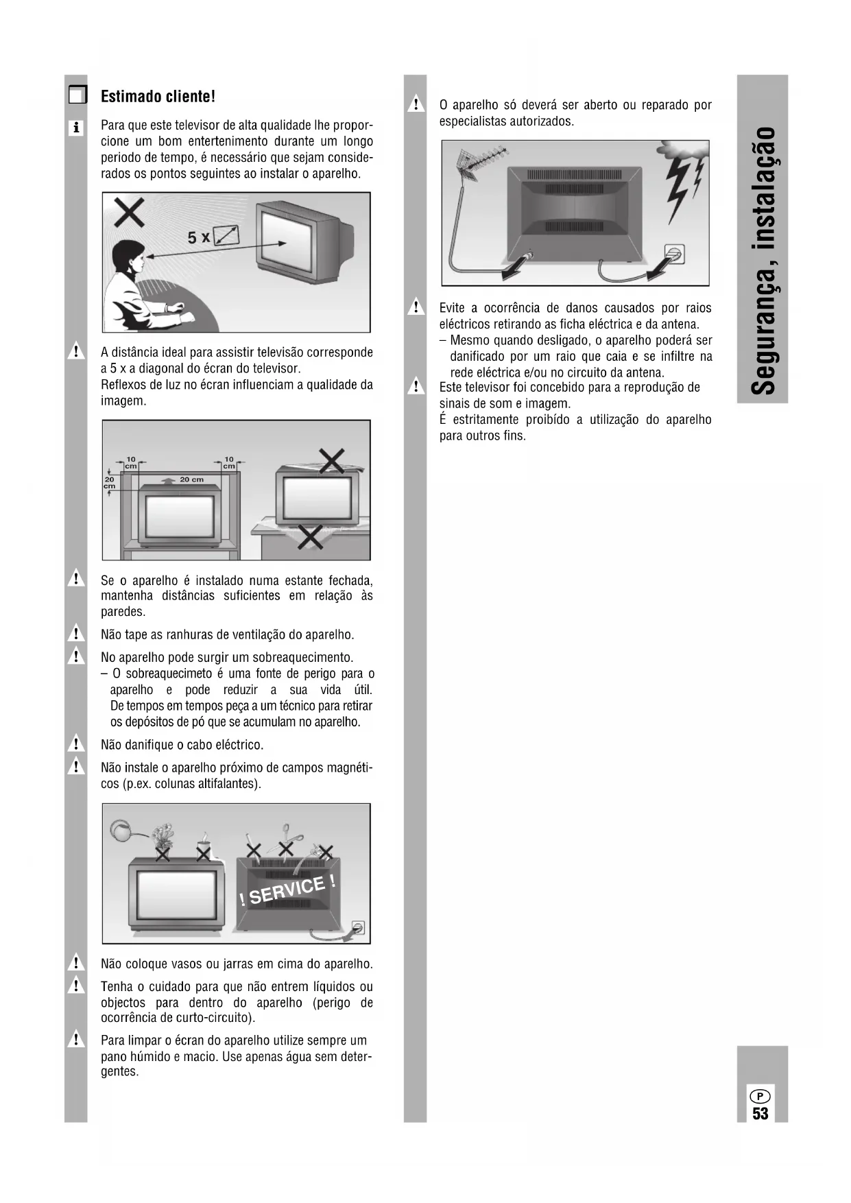 Este televisor foi concebido para a reprodução desinais de som e imagem.É estritamente proibído a utilização do aparelhopara outros fins. Estimado cliente!Para que este televisor de alta qualidade lhe propor-cione um bom entertenimento durante um longoperiodo de tempo, é necessário que sejam conside-rados os pontos seguintes ao instalar o aparelho.