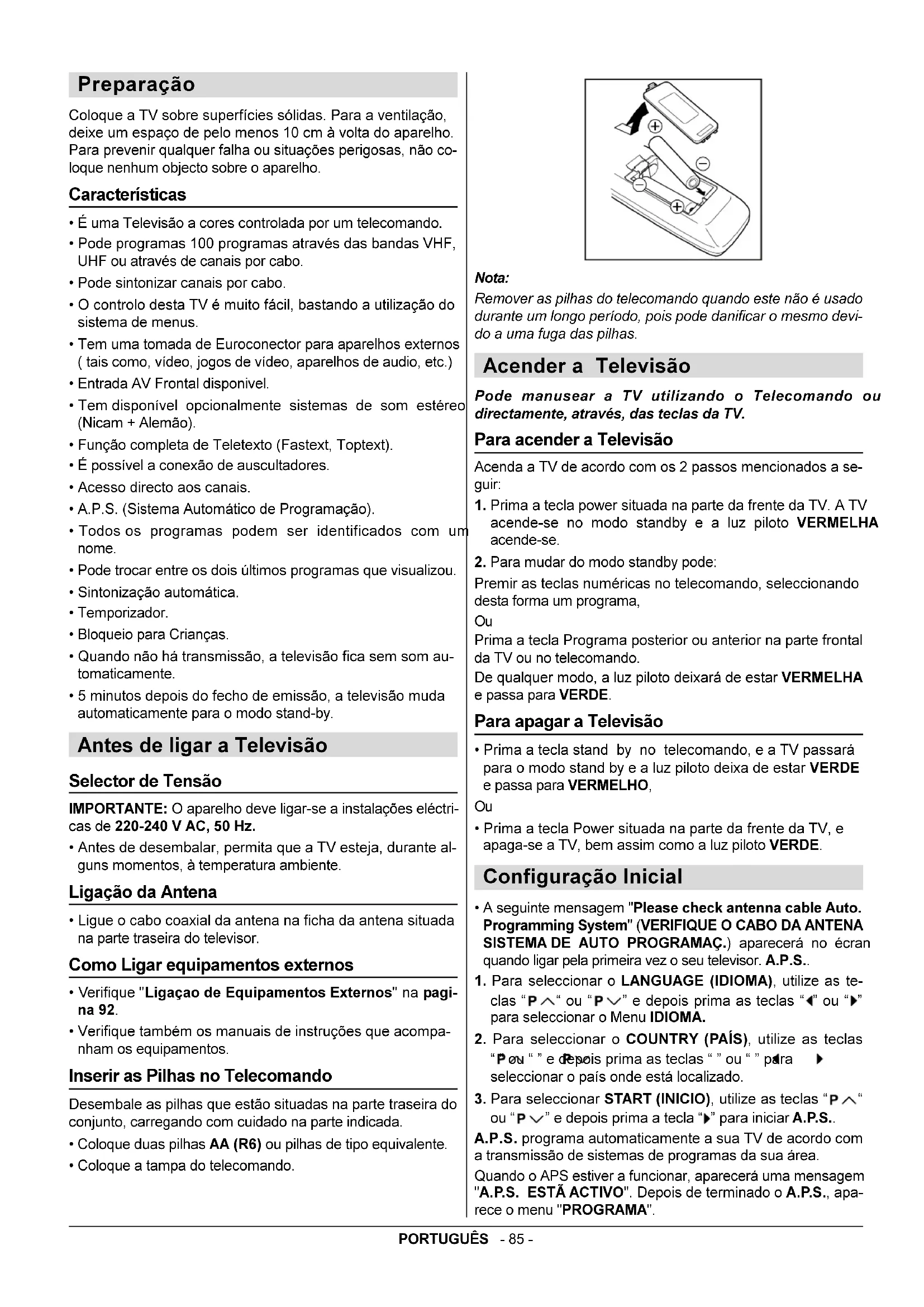 Preparação Coloque a TV sobre superfícies sólidas. Para a ventilação, deixe um espaço de pelo menos 10 cm à volta do aparelho. Para prevenir qualquer falha ou situações perigosas, não co- loque nenhum objecto sobre o aparelho. Características É uma Televisão a cores controlada por um telecomando. Pode programas 100 programas através das bandas VHF, UHF ou através de canais por cabo. Pode sintonizar canais por cabo. O controlo desta TV é muito fácil, bastando a utilização do sistema de menus. Tem uma tomada de Euroconector para aparelhos externos ( tais como, vídeo, jogos de vídeo, aparelhos de audio, etc.) Entrada AV Frontal disponivel. Tem disponível opcionalmente sistemas de som estéreo (Nicam + Alemão). Função completa de Teletexto (Fastext, Toptext). É possível a conexão de auscultadores. Acesso directo aos canais. A.P.S. (Sistema Automático de Programação). Todos os programas podem ser identificados com um nome. Pode trocar entre os dois últimos programas que visualizou. Sintonização automática. Temporizador. Bloqueio para Crianças. Quando não há transmissão, a televisão fica sem som au- tomaticamente. 5 minutos depois do fecho de emissão, a televisão muda automaticamente para o modo stand-by. Antes de ligar a Televisão Selector de Tensão IMPORTANTE: O aparelho deve ligar-se a instalações eléctri- cas de 220-240 V AC, 50 Hz. Antes de desembalar, permita que a TV esteja, durante al- guns momentos, à temperatura ambiente. Ligação da Antena Ligue o cabo coaxial da antena na ficha da antena situada na parte traseira do televisor. Como Ligar equipamentos externos Verifique "Ligaçao de Equipamentos Externos" na pagi- na 92. Verifique também os manuais de instruções que acompa- nham os equipamentos. Inserir as Pilhas no Telecomando Desembale as pilhas que estão situadas na parte traseira do conjunto, carregando com cuidado na parte indicada. Coloque duas pilhas AA (R6) ou pilhas de tipo equivalente. Coloque a tampa do telecomando. Nota: Remover as pilhas do telecomando quando este não é usado durante um longo período, pois pode danificar o mesmo devi- do a uma fuga das pilhas. Acender a Televisão Pode manusear a TV utilizando o Telecomando ou directamente, através, das teclas da TV. Para acender a Televisão Acenda a TV de acordo com os 2 passos mencionados a se- guir: