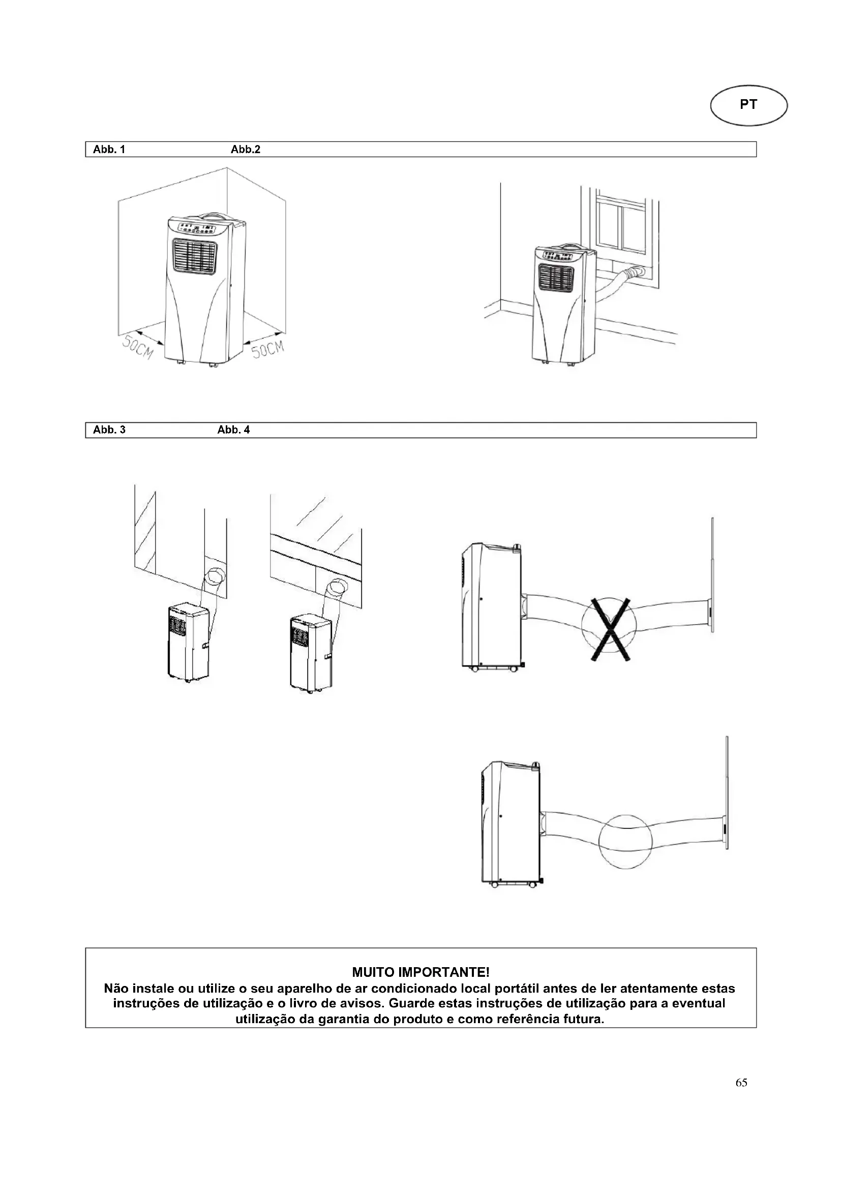 Instalação O aparelho deve ser colocado no chão, a 50 cm de distância de outros objetos, uma vez que estes podem afetar fortemente o desempenho do aparelho (fig. 1). Aviso: antes de usar este aparelho, deve deixá-lo na vertical durante pelo menos 24 horas. O aparelho pode ser movido sem problemas entre as divisões, mas tenha em atenção as seguintes indicações: Instalação do tubo de exaustão, figs. 2 e 3