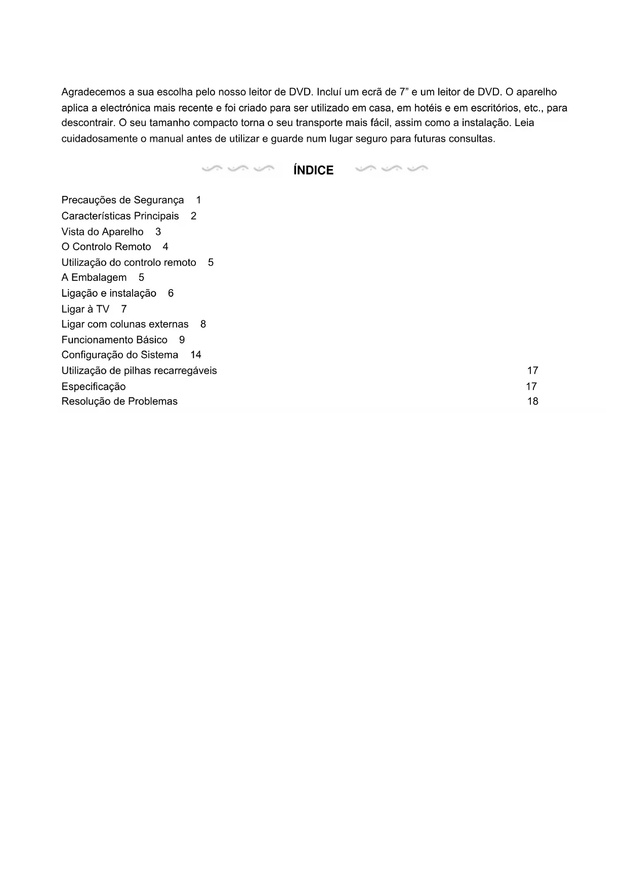 In seguito ad un continuo miglioramento, non verrà dato alcun preavviso in caso di cambiamenti sulle caratteristiche e specifiche sopra riportate.M ANUAL DE UTILIZADOR MANUAL DE UTILIZADORAgradecemos a sua escolha pelo nosso leitor de DVD. Incluí um ecrã de 7” e um leitor de DVD. O aparelho aplica a electrónica mais recente e foi criado para ser utilizado em casa, em hotéis e em escritórios, etc., para descontrair. O seu tamanho compacto torna o seu transporte mais fácil, assim como a instalação. Leia cuidadosamente o manual antes de utilizar e guarde num lugar seguro para futuras consultas. ÍNDICE Precauções de Segurança 1 Características Principais 2 Vista do Aparelho 3 O Controlo Remoto 4 Utilização do controlo remoto 5 A Embalagem 5 Ligação e instalação 6 Ligar à TV 7 Ligar com colunas externas 8 Funcionamento Básico 9 Configuração do Sistema 14 Utilização de pilhas recarregáveis 17 Especificação 17 Resolução de Problemas 18Precauções de Segurança