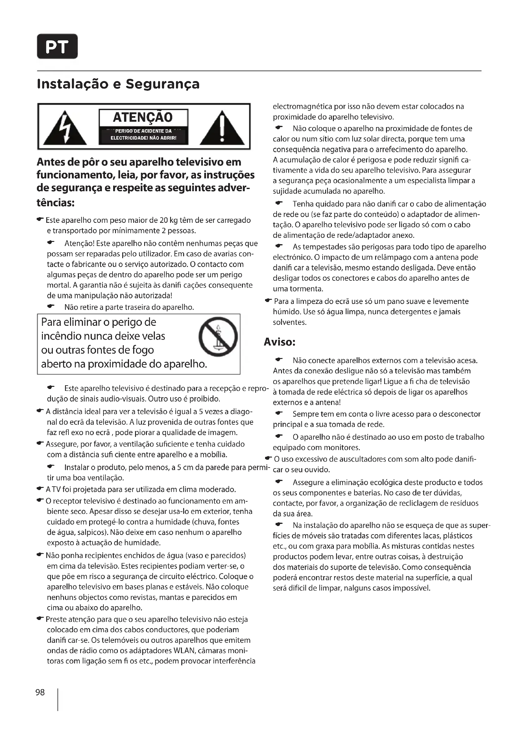 Instalação e Segurança Antes de pôr o seu aparelho televisivo em funcionamento, leia, por favor, as instruções de segurança e respeite as seguintes adver- tências: Este aparelho com peso maior de 20 kg têm de ser carregado e transportado por mínimamente 2 pessoas. Atenção! Este aparelho não contêm nenhumas peças que possam ser reparadas pelo utilizador. Em caso de avarias con-tacte o fabricante ou o serviço autorizado. O contacto com algumas peças de dentro do aparelho pode ser um perigo mortal. A garantia não é sujeita às dani cações consequente de uma manipulação não autorizada! Não retire a parte traseira do aparelho. Para eliminar o perigo de incêndio nunca deixe velas ou outras fontes de fogo aberto na proximidade do aparelho. Este aparelho televisivo é destinado para a recepção e repro- dução de sinais audio-visuais. Outro uso é proibido. A distância ideal para ver a televisão é igual a 5 vezes a diago- nal do ecrã da televisão. A luz provenida de outras fontes que faz re exo no ecrã , pode piorar a qualidade de imagem. Assegure, por favor, a ventilação su ciente e tenha cuidado com a distância su ciente entre aparelho e a mobília. Instalar o produto, pelo menos, a 5 cm da parede para permi- tir uma boa ventilação. A TV foi projetada para ser utilizada em clima moderado. O receptor televisivo é destinado ao funcionamento em am- biente seco. Apesar disso se desejar usa-lo em exterior, tenha cuidado em protegé-lo contra a humidade (chuva, fontes de água, salpicos). Não deixe em caso nenhum o aparelho exposto à actuação de humidade. Não ponha recipientes enchidos de água (vaso e parecidos) em cima da televisão. Estes recipientes podiam verter-se, o que põe em risco a segurança de circuito eléctrico. Coloque o aparelho televisivo em bases planas e estáveis. Não coloque nenhuns objectos como revistas, mantas e parecidos em cima ou abaixo do aparelho. Preste atenção para que o seu aparelho televisivo não esteja colocado em cima dos cabos conductores, que poderiam dani car-se. Os telemóveis ou outros aparelhos que emitem ondas de rádio como os adáptadores WLAN, câmaras moni-toras com ligação sem os etc., podem provocar interferência electromagnética por isso não devem estar colocados na proximidade do aparelho televisivo. Não coloque o aparelho na proximidade de fontes de calor ou num sítio com luz solar directa, porque tem uma consequência negativa para o arrefecimento do aparelho. A acumulação de calor é perigosa e pode reduzir signi ca-tivamente a vida do seu aparelho televisivo. Para assegurar a segurança peça ocasionalmente a um especialista limpar a sujidade acumulada no aparelho. Tenha quidado para não dani car o cabo de alimentação de rede ou (se faz parte do conteúdo) o adaptador de alimen-tação. O aparelho televisivo pode ser ligado só com o cabo de alimentação de rede/adaptador anexo. As tempestades são perigosas para todo tipo de aparelho electrónico. O impacto de um relâmpago com a antena pode dani car a televisão, mesmo estando desligada. Deve então desligar todos os conectores e cabos do aparelho antes de uma tormenta. Para a limpeza do ecrã use só um pano suave e levemente húmido. Use só água limpa, nunca detergentes e jamais solventes. Aviso: Não conecte aparelhos externos com a televisão acesa. Antes da conexão desligue não só a televisão mas também os aparelhos que pretende ligar! Ligue a cha de televisão à tomada de rede eléctrica só depois de ligar os aparelhos externos e a antena! Sempre tem em conta o livre acesso para o desconector principal e a sua tomada de rede. O aparelho não é destinado ao uso em posto de trabalho equipado com monitores. O uso excessivo de auscultadores com som alto pode dani - car o seu ouvido. Assegure a eliminação ecológica deste producto e todos os seus componentes e baterias. No caso de ter dúvidas, contacte, por favor, a organização de recliclagem de resíduos da sua área. Na instalação do aparelho não se esqueça de que as super- fícies de móveis são tratadas com diferentes lacas, plásticos etc., ou com graxa para mobília. As misturas contidas nestes productos podem levar, entre outras coisas, à destruição dos materiais do suporte de televisão. Como consequência poderá encontrar restos deste material na superfície, a qual será difícil de limpar, nalguns casos impossível. ATENÇÃO PERIGO DE ACIDENTE DA ELECTRICIDADE! NÃO ABRIR!99 Instalação e Segurança O ecrã do seu televisor LCD corresponde aos altos requeri- mentos de qualidade e foi posto à prova várias vezes para detectar píxeis defectuosos. Devido a tecnologia do processo de produção (mesmo com a maior atenção na produção de ecrã) não se pode a 100% excluir a aparição de píxeis defeituosos no ecrã. Estes píxeis defeituosos não são conside- rados como um defeito dentro de garantia do aparelho se a sua extensão não ultrapasse límites de nidas seguindo a norma DIN. Informação Importante Relativa à Uti- lização de Videojogos, Computadores, Legendas ou Outras Visualizações de Imagem Fixa A utilização prolongada de material de programa de imagem xa pode causar uma „imagem sombra“ permanente no painel LCD. Esta imagem de fundo é visível em programas normais sob a forma de uma imagem estacionária xa. Este tipo de deterioração irreversível do painel LCD/LED pode ser limitada ao efectuar os seguintes passos: