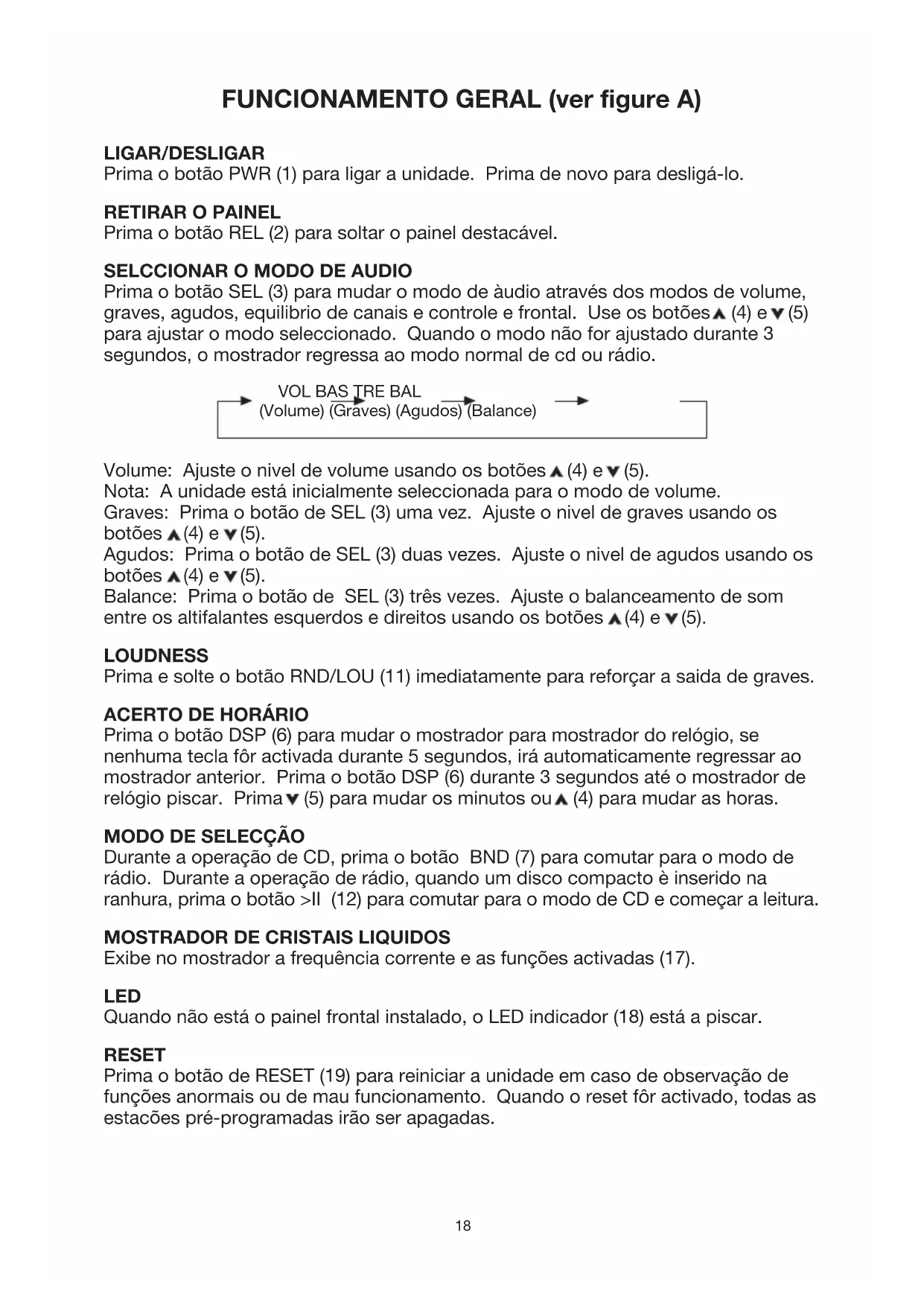Balance: Prima o botão de SEL (3) tíres vezes. Ajuste o balanceamento de som entre os altifalantes esquerdos e direitos usingo os botões A (4) e V (5).