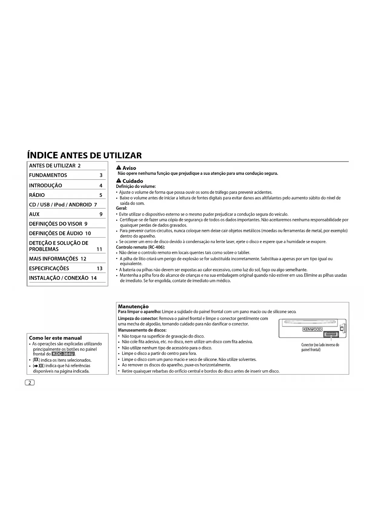 2 500 mV/10kΩ Impedância de preout ≤600Ω Auxiliar Resposta de frequência (±3 dB) 20Hz—20kHz Voltagem máxima de entrada 1000mV Impedância de entrada 30kΩ Geral Voltagem de funcionamento 14,4 V (10,5 V a 16 V permissível) Consumo máximo de corrente 10A Intervalo da temperatura de funcionamento 0°C — +40°C Dimensões da instalação (L× A × P) 182mm × 53mm × 159mm Peso 1,2kg Sujeito a modificações sem aviso prévio. JS_KWD_KDC_364U_102UR_EN_PR.indd 13JS_KWD_KDC_364U_102UR_EN_PR.indd 13 20-Oct-14 2:21:34 PM20-Oct-14 2:21:34 PM14 Data Size: B6L (182 mm x 128 mm) Book Size: B6L (182 mm x 128 mm)