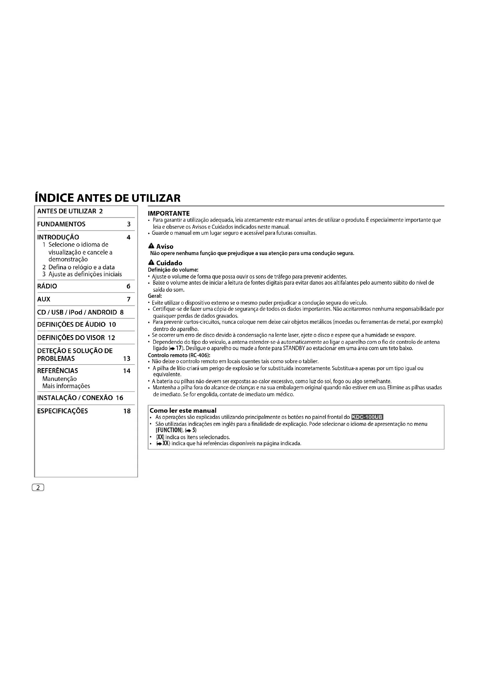 Guarde o manual em um lugar seguro e acessível para futuras consultas. Aviso Não opere nenhuma função que prejudique a sua atenção para uma condução segura. Cuidado Definição do volume: