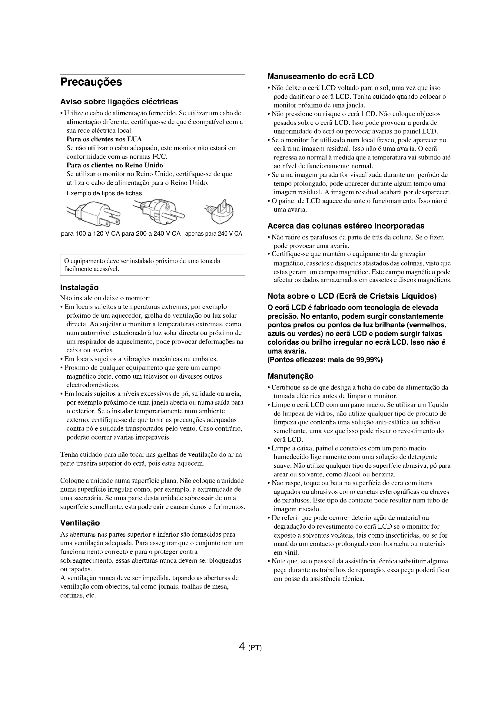 - Certifique-se que mantém o equipamento de gravação magnético, cassetes e disquetes afastados das colunas, visto que estas geram um campo magnético. Este campo magnético pode afectar os dados armazenados em cassetes e discos magnéticos. Nota sobre o LCD (Ecrã de Cristais Líquidos) O ecrã LCD é fabricado com tecnologia de elevada precisão. No entanto, podem surgir constantemente pontos pretos ou pontos de luz brilhante (vermelhos, azuis ou verdes) no ecrã LCD e podem surgir faixas coloridas ou brilho irregular no ecrã LCD. Isso não é uma avaria. (Pontos eficazes: mais de 99,99%) Manutenção