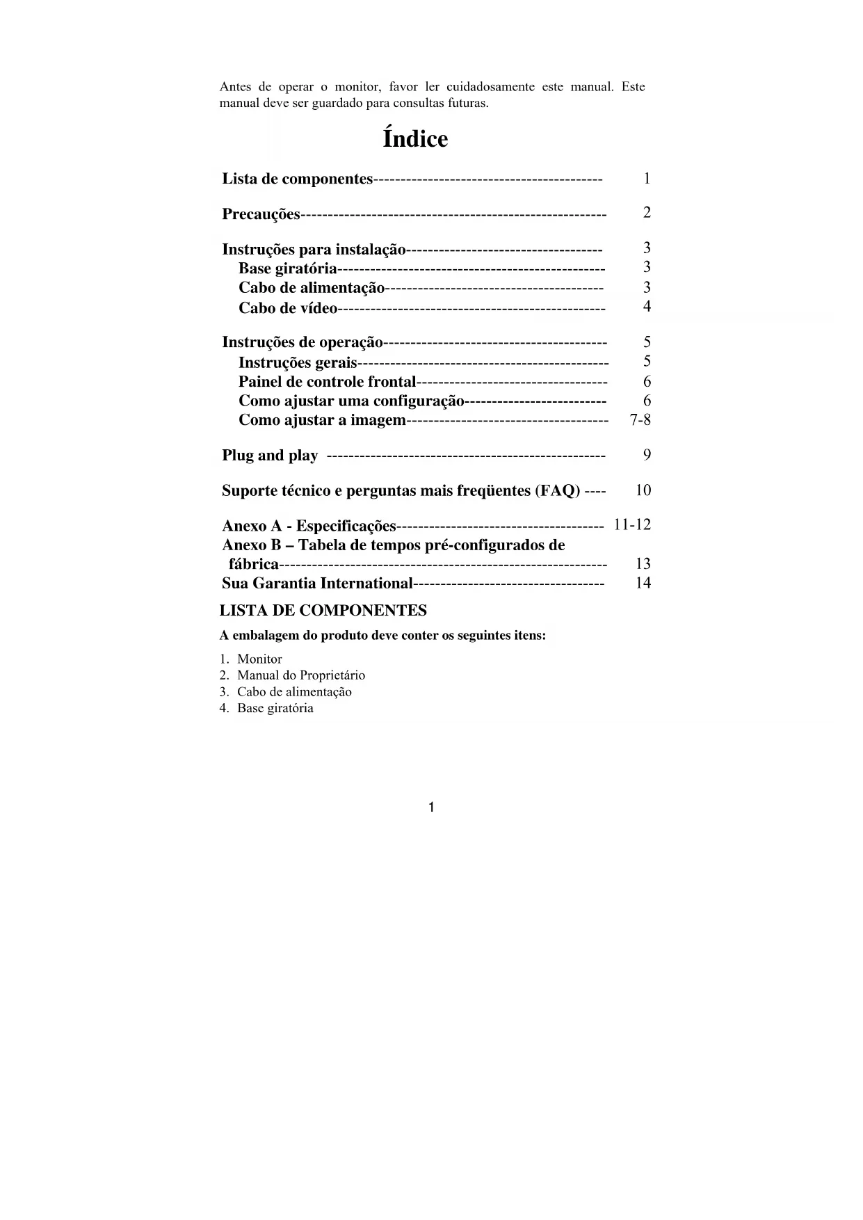 PADRÃO RESOLUÇÃO FREQÜÊNCIA HORIZONTAL FREQÜÊNCIA VERTICAL IBM 720×400 31.5kHz 70Hz VGA 640×480 31.5kHz 60Hz VESA/85 640×480 37.5kHz 75Hz VESA/85 800×600 46.9kHz 75Hz VESA/85 800×600 53.6kHz 85Hz VESA/60 1024×768 48.4kHz 60Hz14 Sua Garantia International Prezado cliente, Muito obrigado por comprar este produto Phillips, que foi projetado e fabricado com o mais alto padrão de qualidade. Se por acaso, este produto apresentar algum problema, a Phillips garante a mão-de-obra e a reposição de peças, livre de qualquer despesa, independente do país em que o produto for consertado, durante um período de 12 meses a partir da data da compra. Esta garantia internacional da Phillips complementa as obrigações para com você da garantia nacional já existente dos revendedores e da Phillips no país da compra e não afeta os seus direitos como consumidor previstos por lei. A garantia da Phillips se aplica desde que o produto seja devidamente manuseado para seu uso indicado, de acordo com suas instruções de operação e sob a apresentação de uma fatura original ou de um recibo de venda, indicando a data da compra, o nome do revendedor, o modelo e o número de fabricação do produto. A garantia da Phillips pode não ser aplicada se: