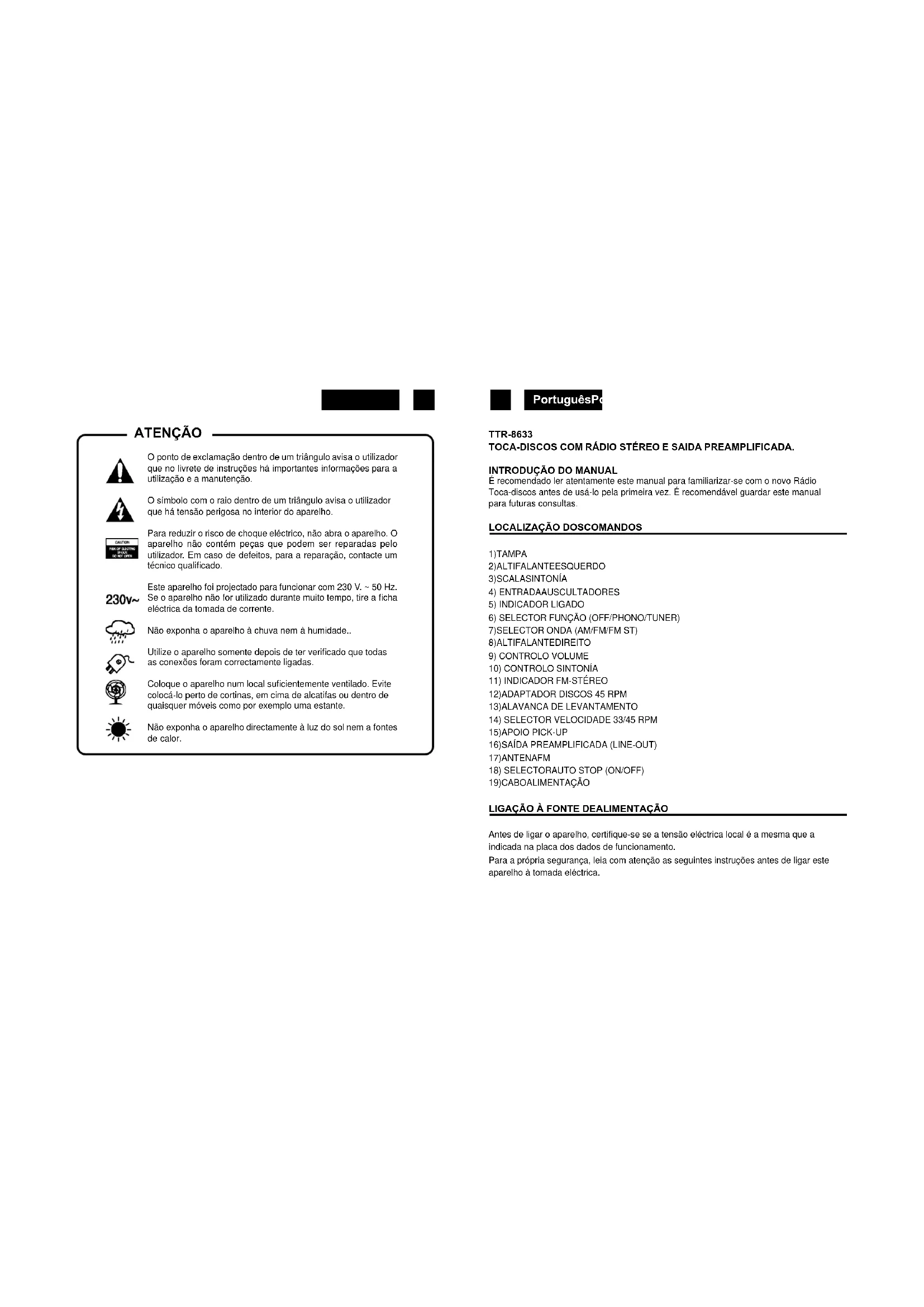 Antes de ligar o aparelho, certifique-se se a tensão eléctrica local é a mesma que a indicada na placa dos dados de funcionamento. Para a própria segurança, leia com atenção as seguintes instruções antes de ligar este aparelho à tomada eléctrica. O ponto de exclamação dentro de um triângulo avisa o utilizador que no livrete de instruções há importantes informações para a utilização e a manutenção. O símbolo com o raio dentro de um triângulo avisa o utilizador que há tensão perigosa no interior do aparelho. Para reduzir o risco de choque eléctrico, não abra o aparelho. O aparelho não contém peças que podem ser reparadas pelo utilizador. Em caso de defeitos, para a reparação, contacte um técnico qualificado. Este aparelho foi projectado para funcionar com 230 V. ~ 50 Hz. Se o aparelho não for utilizado durante muito tempo, tire a ficha eléctrica da tomada de corrente. Não exponha o aparelho à chuva nem à humidade.. Utilize o aparelho somente depois de ter verificado que todas as conexões foram correctamente ligadas. Coloque o aparelho num local suficientemente ventilado. Evite colocá-lo perto de cortinas, em cima de alcatifas ou dentro de quaisquer móveis como por exemplo uma estante. Não exponha o aparelho directamente à luz do sol nem a fontes de calor. ATENÇÃOPortuguêsPortuguês 33 34 FUNCIONAMENTOCOMELECTRICIDADEDAREDE Este aparelho foi projectado para funcionar somente com uma fonte de alimentação de Corrente Alternada de 230 V. 50 Hz. A ligação a qualquer outro tipo de alimentação poderá danificar o aparelho. Atenção Para evitar descargas eléctricas, desligue o aparelho da tomada eléctrica antes de abrir tirar a tampa. O aparelho não contém peças que podem ser reparadas pelo utilizador. Em caso de avarias, para a reparação, contacte um técnico qualificado. Precauções de Segurança Não deixe o aparelho exposto à chuva nem à humidade. Fonte de Alimentação Principal: somente Corrente Alternada 230 V. / 50 Hz Este símbolo significa que este aparelho é duplamente isolado. Não é necessária uma ligação à terra.