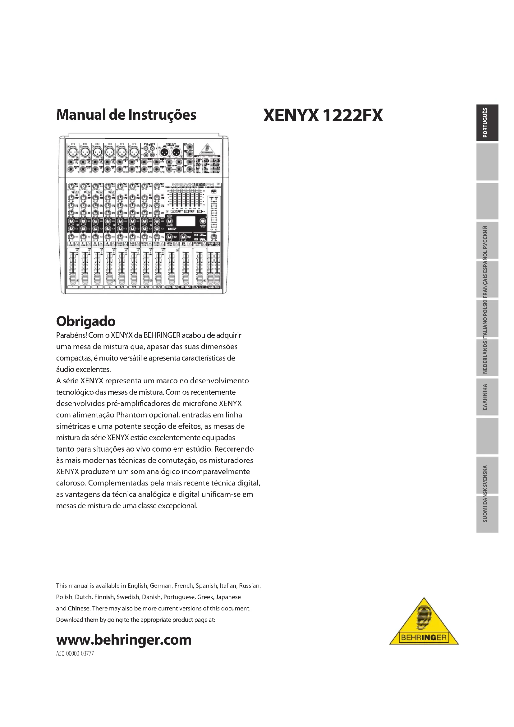 PORTUGUÊSThis manual is available in English, German, French, Spanish, Italian, Russian, Polish, Dutch, Finnish, Swedish, Danish, Portuguese, Greek, Japanese and Chinese. There may also be more current versions of this document. Download them by going to the appropriate product page at: www.behringer.com SUOMI DANSK SVENSKAΕΛΛΗΝΙΚΑNEDERLANDS ITALIANO POLSKI FRANÇAIS ESPAÑOL РУССКИЙ XENYX 1222FX Obrigado Parabéns! Com o XENYX da BEHRINGER acabou de adquirir uma mesa de mistura que, apesar das suas dimensões compactas, é muito versátil e apresenta características de áudio excelentes. A série XENYX representa um marco no desenvolvimento tecnológico das mesas de mistura. Com os recentemente desenvolvidos pré-amplificadores de microfone XENYX com alimentação Phantom opcional, entradas em linha simétricas e uma potente secção de efeitos, as mesas de mistura da série XENYX estão excelentemente equipadas tanto para situações ao vivo como em estúdio. Recorrendo às mais modernas técnicas de comutação, os misturadores XENYX produzem um som analógico incomparavelmente caloroso. Complementadas pela mais recente técnica digital, as vantagens da técnica analógica e digital unificam-se em mesas de mistura de uma classe excepcional. A50-00000-03777 Manual de Instruções2 PORTUGUÊSXENYX 1222FX Manual de Instruções