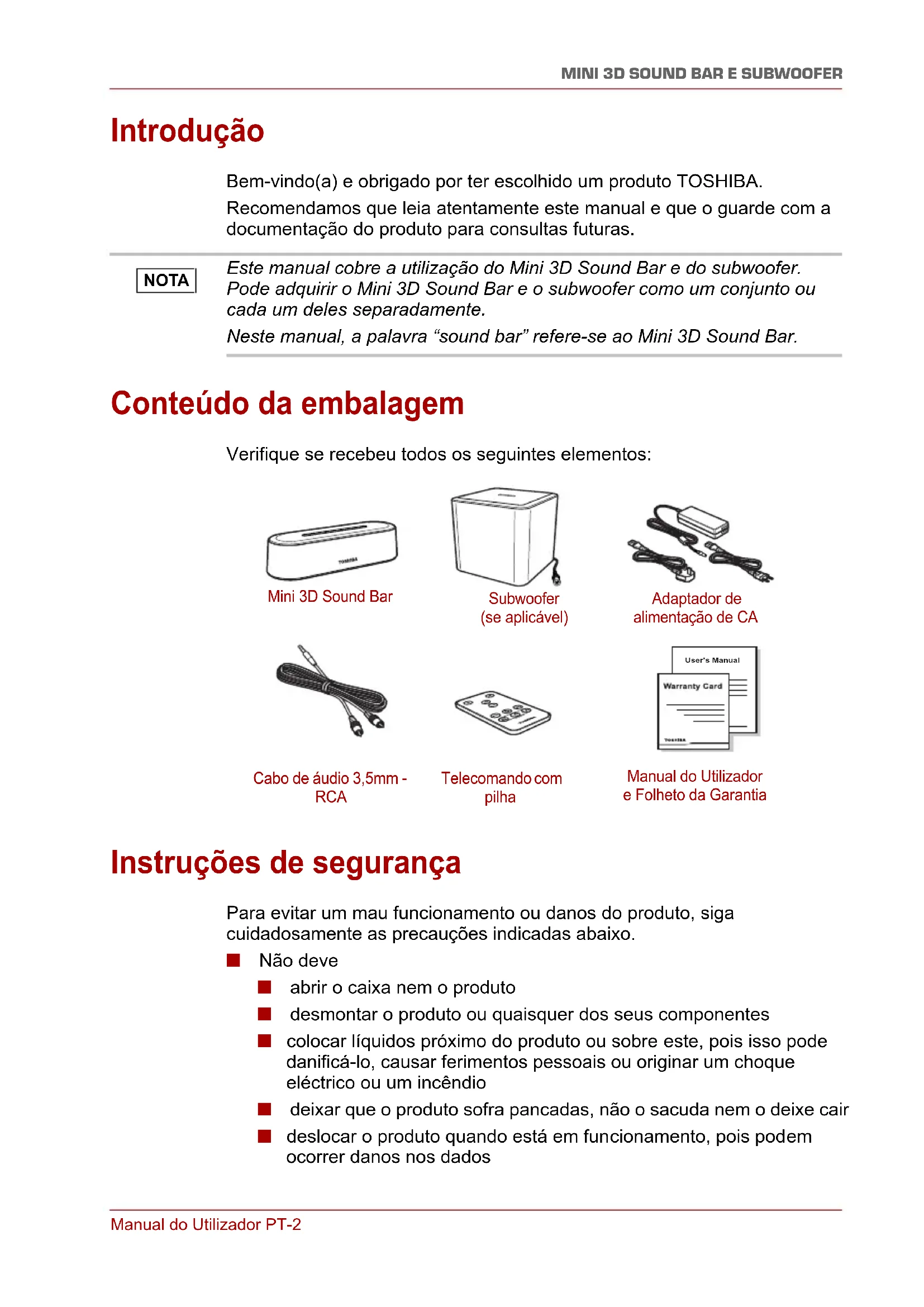 Introdução Bem-vindo(a) e obrigado por ter escolhido um produto TOSHIBA. Recomendamos que leia atentamente este manual e que o guarde com a documentação do produto para consultas futuras. Conteúdo da embalagem Verifique se recebeu todos os seguintes elementos: Instruções de segurança Para evitar um mau funcionamento ou danos do produto, siga cuidadosamente as precauções indicadas abaixo. ■ Não deve ■ abrir o caixa nem o produto ■ desmontar o produto ou quaisquer dos seus componentes ■ colocar líquidos próximo do produto ou sobre este, pois isso pode danificá-lo, causar ferimentos pessoais ou originar um choque eléctrico ou um incêndio ■ deixar que o produto sofra pancadas, não o sacuda nem o deixe cair ■ deslocar o produto quando está em funcionamento, pois podem ocorrer danos nos dados Este manual cobre a utilização do Mini 3D Sound Bar e do subwoofer. Pode adquirir o Mini 3D Sound Bar e o subwoofer como um conjunto ou cada um deles separadamente. Neste manual, a palavra “sound bar” refere-se ao Mini 3D Sound Bar. NOTA User’s Manual Mini 3D Sound Bar Subwoofer (se aplicável) Adaptador de alimentação de CA Cabo de áudio 3,5mm - RCA Telecomando com pilha Manual do Utilizador e Folheto da GarantiaPT-3 Manual do Utilizador