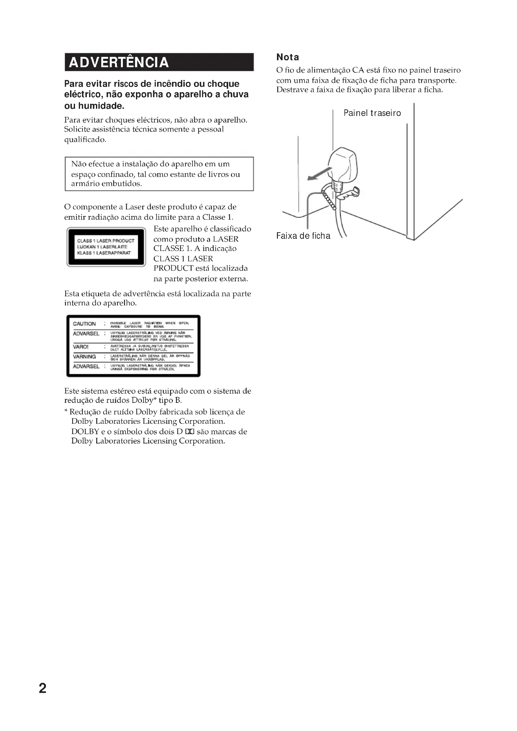 Este aparelho é classificado como produto a LASER CLASSE 1. A indicação CLASS 1 LASER PRODUCT está localizada na parte posterior externa.