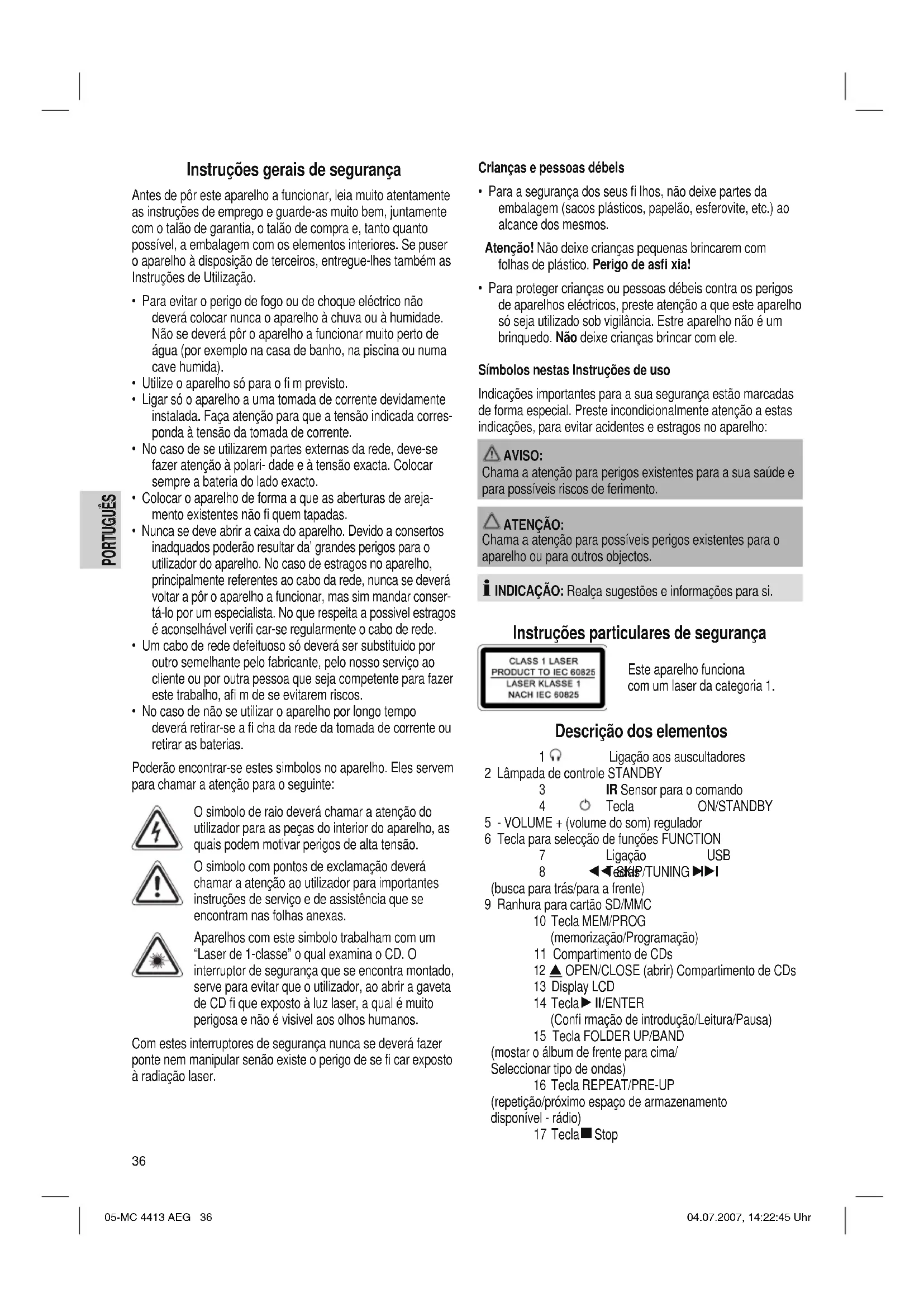 - Para proteger crianças ou pessoas débeis contra os perigos de aparelhos eléctricos, preste atenção a que este aparelho só seja utilizado sob vigilância. Estre aparelho não é um brinquedo. Não deixe crianças brincar com ele. Símbolos nestas Instruções de uso Indicações importantes para a sua segurança estão marcadas de forma especial. Preste incondicionalmente atenção a estas indicações, para evitar acidentes e estragos no aparelho: AVISO: Chama a atenção para perigos existentes para a sua saúde e para possíveis riscos de ferimento. ATENÇÃO: Chama a atenção para possíveis perigos existentes para o aparelho ou para outros objectos. INDICAÇÃO: Realça sugestões e informações para si. Instruções particulares de segurança Este aparelho funciona com um laser da categoria 1. Descrição dos elementos 1 Ligação aos auscultadores 2 Lâmpada de controle STANDBY 3 IR Sensor para o comando 4 Tecla ON/STANDBY