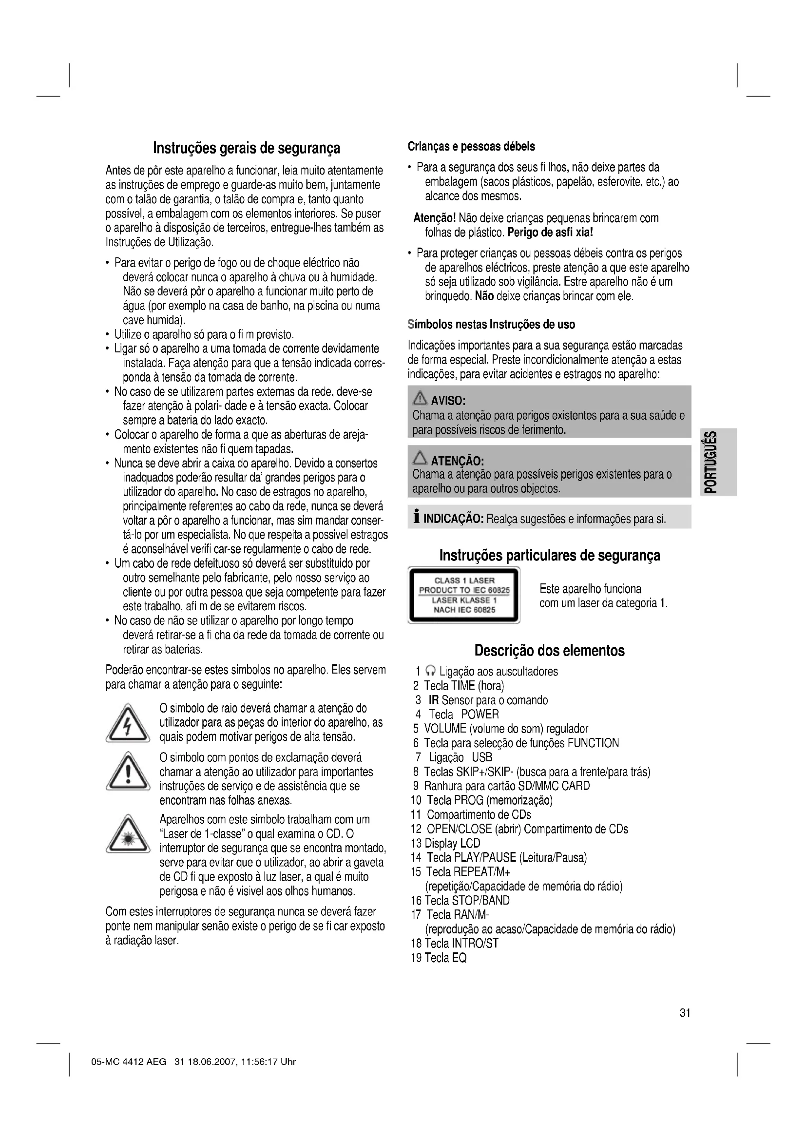 - Para proteger crianças ou pessoas débeis contra os perigos de aparelhos eléctricos, preste atenção a que este aparelho só seja utilizado sob vigilância. Estre aparelho não é um brinquedo. Não deixe crianças brincar com ele. Símbolos nestas Instruções de uso Indicações importantes para a sua segurança estão marcadas de forma especial. Preste incondicionalmente atenção a estas indicações, para evitar acidentes e estragos no aparelho: AVISO: Chama a atenção para perigos existentes para a sua saúde e para possíveis riscos de ferimento. ATENÇÃO: Chama a atenção para possíveis perigos existentes para o aparelho ou para outros objectos. INDICAÇÃO: Realça sugestões e informações para si. Instruções particulares de segurança Este aparelho funciona com um laser da categoria 1. Descrição dos elementos 1 Ligação aos auscultadores 2 Tecla TIME (hora) 3 IR Sensor para o comando 4 Tecla POWER 5 VOLUME (volume do som) regulador 6 Tecla para selecção de funções FUNCTION 7 Ligação USB 8 Teclas SKIP+/SKIP- (busca para a frente/para trás) 9 Ranhura para cartão SD/MMC CARD 10 Tecla PROG (memorização) 11 Compartimento de CDs 12 OPEN/CLOSE (abrir) Compartimento de CDs 13 Display LCD 14 Tecla PLAY/PAUSE (Leitura/Pausa) 15 Tecla REPEAT/M+ (repetição/Capacidade de memória do rádio) 16 Tecla STOP/BAND 17 Tecla RAN/M- (reprodução ao acaso/Capacidade de memória do rádio) 18 Tecla INTRO/ST 19 Tecla EQ 05-MC 4412 AEG 31 18.06.2007, 11:56:17 Uhr32 PORTUGUÊS PORTUGUÊS Parte traseira do aparelho (sem Figura) 20 SPEAKER R/L Ligações para as colunas 21 AC Ligação de corrente 22 FM ANT. Antena volante 23 AM ANT. Ligação à antena 24 AUX Entrada 25 POWER ON/OFF Interruptor Telecomando 1 Tecla PLAY/PAUSE (Leitura/Pausa) 2 Tecla STOP 3 Teclas
