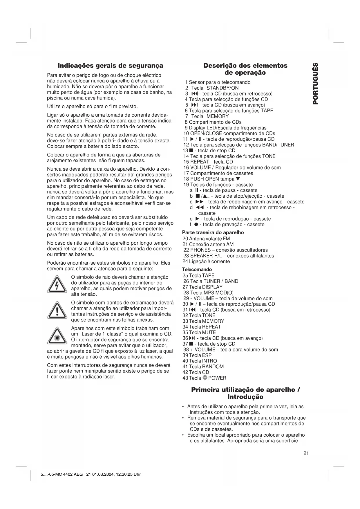 reprodução parará e o programa será apagado. Tem a possibilidade de combinar os títulos programa- dos com a função REPEAT. Depois de ter efectuado a programação e de ter iniciado a reprodução, pressione a tecla REPEAT até 3 x e as funções poderão ser utilizadas da forma descrita na rubrica “REPEAT”. Descrição das teclas CD do telecomando TAPE (25): Muda para o modo TAPE (cassetes). TUNER/ BAND (26): Muda para o modo rádio. DISPLAY (27): Com o CD a ser reproduzido (não no modo MP3) Pressionar 1 x: A duração total do título é contada em retrocesso. Pressionar 2 x: A duração total do CD completo é contada em retrocesso. Pressionar 3x: A canção actual e o tempo de repro- dução decorrido surge no display. MP3 MOD (28): Muda para o modo MP3. / II (30): Inicia o CD. A reprodução pode ser brevemente interrompida. Pressione novamente a tecla PLAY. A indicação surgirá intermitente no display. I / I (31/36): Com estas teclas poderá saltar para o título seguinte, para o que vem depois e assim sucessivamente. Se mantiver a tecla pressionada, iniciar-se-á uma busca de músicas. TONE (32): Consulte o item “TONE”. MEMORY (33): Consulte a rubrica “Reprodução pro- gramada”. REPEAT (34): Consulte a rubrica “REPEAT”. MUTE (35): Serve para desligar rapidamente o som. Para desactivar esta função, pressione novamente a tecla MUTE. Stop (37): Pára o CD. No display surgirá a palav- ra “MUTE”. ESP (39): Activa/desactiva a função anti-choque quando o CD áudio se encontra inse- rido (não no modo MP3). Pressione STOP, pressione a tecla ESP até 2 x. No display surgirá ESP ON respectiva- mente OFF. No caso de interferências, os dados musicais do CD serão lidos a partir de uma memória intermédia e deixará de haver interferências. Erros de leitura serão posteriormente corrigi- dos na memória intermédia. INTRO (40): Reproduz os títulos de todos os CDs durante cerca de 10 segundos, saltan- do em seguida para o título seguinte (não no modo MP3). RANDOM (41): Pressionando-se a tecla RANDOM, serão reproduzidos sucessivamente todos os títulos ao acaso (não no modo MP3). A indicação RANDOM no display, mostra esta função. Pres- sionando-se novamente esta tecla, serão anuladas todas as funções e o funcionamento normal continuará. CD (42): Muda para o modo CD. Funções especiais CDs MP3 Poderá reproduzir no seu aparelho CDs MP3. Nestes CDs, pode ser memorizado um total de 200 títulos. O seu aparelho reconhecerá automatica- mente um CD MP3. No display surgirá a indicação MP3. Será assim mantida qualidade do som. Para ouvir estes CDs, proceda da forma descrita para a reprodução de CDs. Este aparelho foi controlado nos termos das actuais directivas da CEE aplicáveis, tais como inocuidade elec- tromagnética e directiva sobre baixa tensão, e fabricado de acordo com as mais novas prescrições da segurança técnica. Reserva-se o direito de alterações! Garantia O aparelho vendido pela nossa empresa tem uma garan- tia de 24 meses a partir da data da compra (talão). Durante o período de garantia, procederemos à remoção grátis - por reparação, ou, segundo a nossa decisão, por substituição - das defi ciências do aparelho ou dos acessórios*) que provenham de erros de material ou de fabricação. A prestação de serviços relacionados com a garantia não prolongarão a mesma, nem iniciarão um novo prazo de garantia! O talão de compra consistirá prova desta garantia. Sem o mesmo, não será possível proceder-se a qualquer troca ou reparação grátis. Em caso de garantia, entregue o aparelho completo, jun- tamente com o talão de compra, na loja onde o mesmo foi comprado. *) No caso de danos em quaisquer acessórios, não será efectuada automática-mente uma substituição completa do aparelho. Contacte neste caso a nossa hotline! Danos causados por quebras de peças de vidro ou de plástico terão de ser pagos pelo cliente! Não estão incluídos na garantia quaisquer defeitos de acessórios ou de peças que se desgastem (como, por exemplo, carvões do motor, varinhas, correias do motor, 5....-05-MC 4402 AEG 24 01.03.2004, 12:30:28 Uhr25 PORTUGUÊS telecomandos, escovas de dentes, folhas de serra, etc.), nem a limpeza, a manutenção ou a substituição de peças que se desgastem, devendo tais despesas ser reembolsadas! A garantia terminará sempre que tenha havido interven- ção alheia nos aparelhos. Após a garantia Após a expiração do prazo de garantia, poderão ser efectuados arranjos por pessoal especializado, ou pelos nossos serviços de reparações, contra reembolso. 5....-05-MC 4402 AEG 25 01.03.2004, 12:30:29 Uhr26 ITALIANO Avvertenze generali per la sicurezza Per evitare il rischio di incendio o di scosse, non si deve mai tenere l’apparecchio sotto la pioggia o in ambienti umidi. Quindi non usare l’apparecchio nelle immediate vicinanze di acqua, per esempio in prossimità di una vasca, di una piscina o in una cantina umida. Utilizzare l’apparecchio solo per l’uso previsto. Collegare l’apparecchio esclusivamente ad una presa installata a norma. Fare attenzione a che la tensione indicata corrisponda alla tensione della presa. Se si impiegano alimentatori esterni, fare attenzione all’esattezza di polarità e di tensione, inserire le batterie sempre correttamente. Collocare l’apparecchio in modo che le aperture per l’aerazione esistenti non vengano coperte. Non togliere mai la protezione dell’apparecchio. Ripa- razioni non a regola d’arte possono causare notevoli pericoli per l’utente. Se l’apparecchio presenta danni, soprattutto nella zona del cavo di collegamento, non metterlo più in funzione, ma farlo riparare prima da un esperto. Esaminare regolarmente il cavo di collegamento alla rete per verifi care che non ci siano danni. Un cavo di collegamento difettoso può essere sostituito con un cavo equivalente solo dal produttore, dal nostro servizio assistenza o da persone similment