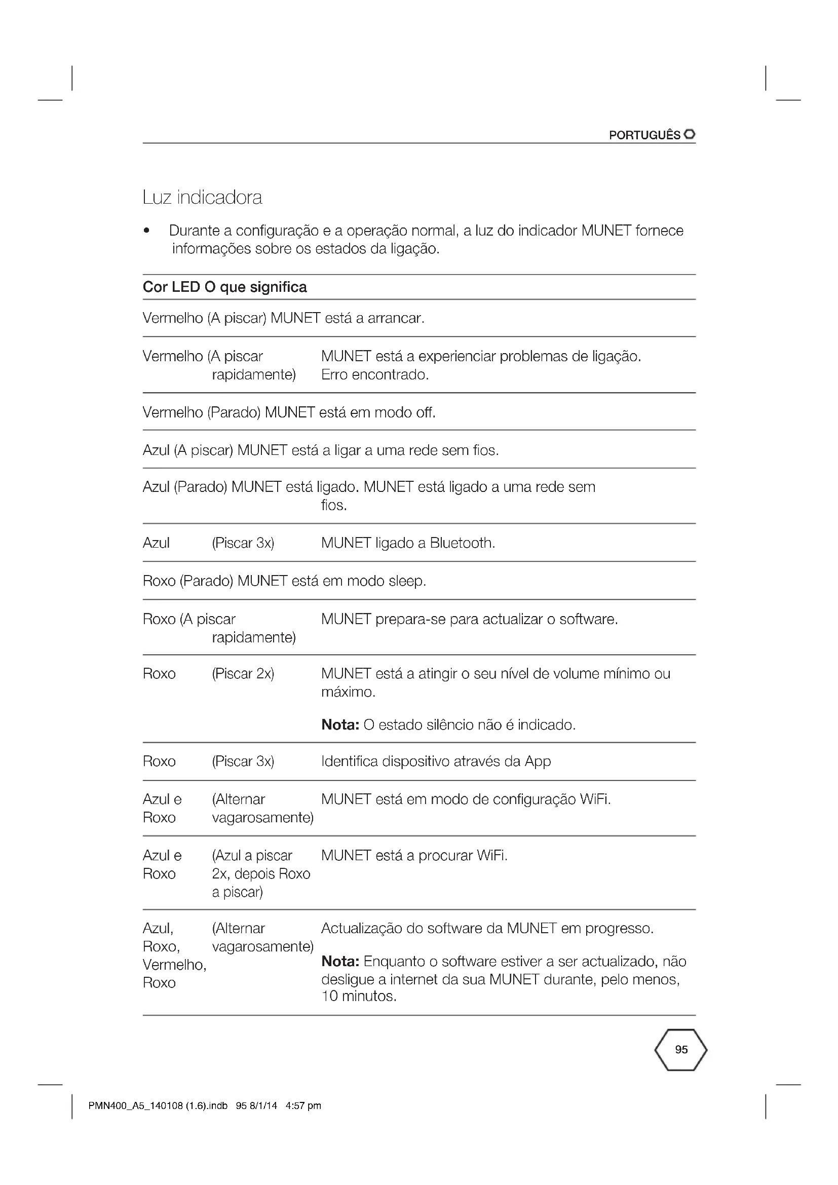 - Durante a configuração e a operação normal, a luz do indicador MUNET fornece informações sobre os estados da ligação. Cor LED O que significa Vermelho (A piscar) MUNET está a arrancar. Vermelho (A piscar rapidamente) MUNET está a experienciar problemas de ligação. Erro encontrado. Vermelho (Parado) MUNET está em modo o. Azul (A piscar) MUNET está a ligar a uma rede sem fios. Azul (Parado) MUNET está ligado. MUNET está ligado a uma rede sem fios. Azul (Piscar 3x) MUNET ligado a Bluetooth. Roxo (Parado) MUNET está em modo sleep. Roxo (A piscar rapidamente) MUNET prepara-se para actualizar o software. Roxo (Piscar 2x) MUNET está a atingir o seu nível de volume mínimo ou máximo. Nota: O estado silêncio não é indicado. Roxo (Piscar 3x) Identifica dispositivo através da App Azul e Roxo (Alternar vagarosamente) MUNET está em modo de configuração WiFi. Azul e Roxo (Azul a piscar 2x, depois Roxo a piscar) MUNET está a procurar WiFi. Azul, Roxo, Vermelho, Roxo (Alternar vagarosamente) Actualização do software da MUNET em progresso. Nota: Enquanto o software estiver a ser actualizado, não desligue a internet da sua MUNET durante, pelo menos, 10 minutos. PMN400_A5_140108 (1.6).indb 95 8/1/14 4:57 pmPORTUGUÊS