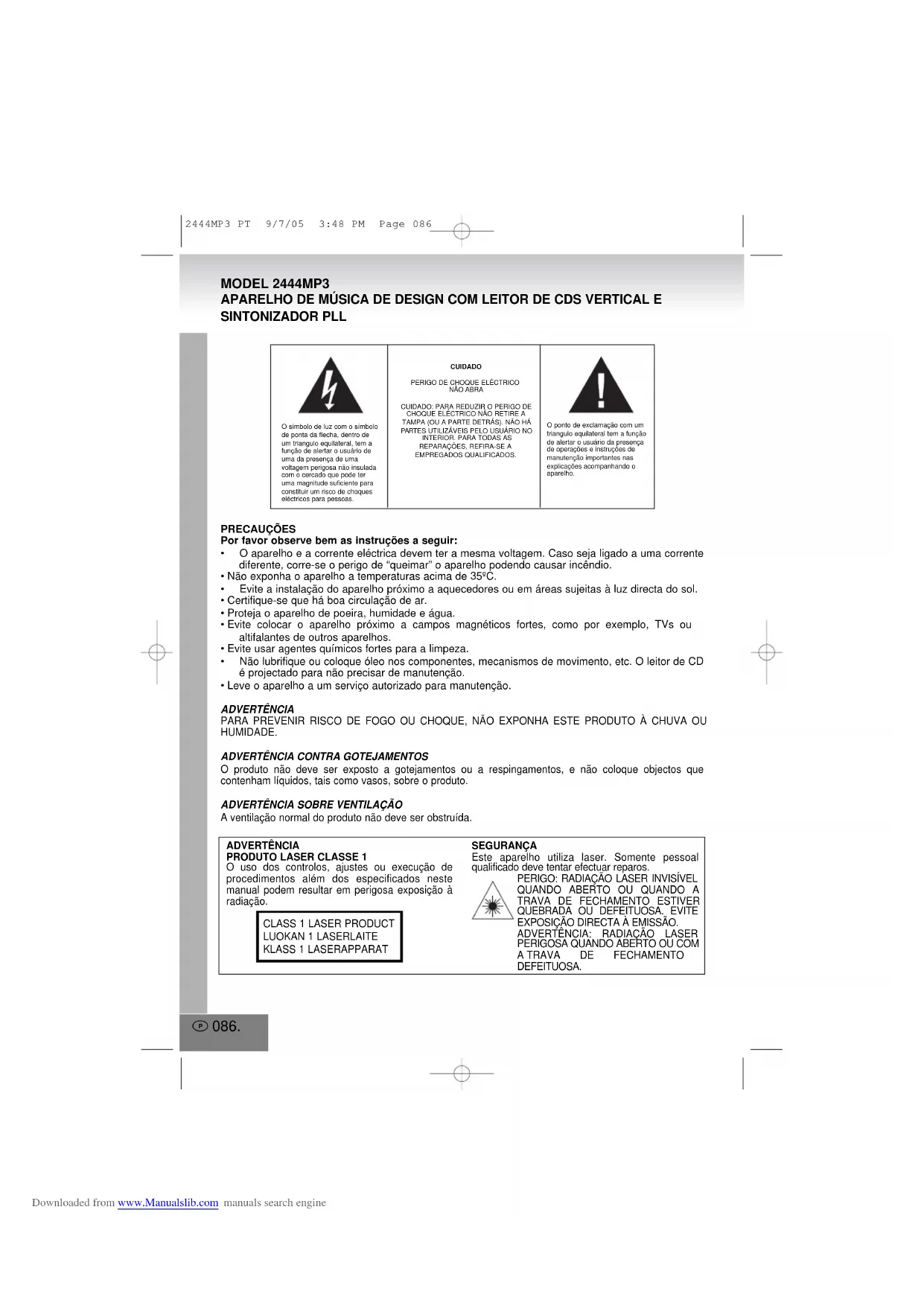 - Não lubrifique ou coloque óleo nos componentes, mecanismos de movimento, etc. O leitor de CD é projectado para não precisar de manutenção.• Leve o aparelho a um serviço autorizado para manutenção.ADVERTÊNCIAPARA PREVENIR RISCO DE FOGO OU CHOQUE, NÃO EXPONHA ESTE PRODUTO À CHUVA OUHUMIDADE.ADVERTÊNCIA CONTRA GOTEJAMENTOSO produto não deve ser exposto a gotejamentos ou a respingamentos, e não coloque objectos quecontenham líquidos, tais como vasos, sobre o produto. ADVERTÊNCIA SOBRE VENTILAÇÃOA ventilação normal do produto não deve ser obstruída.O símbolo de luz com o símbolode ponta da flecha, dentro deum triangulo equilateral, tem afunção de alertar o usuário deuma da presença de umavoltagem perigosa não insuladacom o cercado que pode teruma magnitude suficiente paraconstituir um risco de choqueseléctricos para pessoas.CUIDADOPERIGO DE CHOQUE ELÉCTRICO NÃO ABRACUIDADO: PARA REDUZIR O PERIGO DECHOQUE ELÉCTRICO NÃO RETIRE ATAMPA (OU A PARTE DETRÁS). NÃO HÁPARTES UTILIZÁVEIS PELO USUÁRIO NOINTERIOR. PARA TODAS ASREPARAÇÕES, REFIRA-SE AEMPREGADOS QUALIFICADOS.O ponto de exclamação com umtriangulo equilateral tem a funçãode alertar o usuário da presençade operações e instruções demanutenção importantes nasexplicações acompanhando oaparelho. P 086. MODEL 2444MP3 APARELHO DE MÚSICA DE DESIGN COM LEITOR DE CDS VERTICAL E SINTONIZADOR PLL ADVERTÊNCIAPRODUTO LASER CLASSE 1O uso dos controlos, ajustes ou execução deprocedimentos além dos especificados nestemanual podem resultar em perigosa exposição àradiação.CLASS 1 LASER PRODUCTLUOKAN 1 LASERLAITEKLASS 1 LASERAPPARATSEGURANÇAEste aparelho utiliza laser. Somente pessoalqualificado deve tentar efectuar reparos.PERIGO: RADIAÇÃO LASER INVISÍVELQUANDO ABERTO OU QUANDO ATRAVA DE FECHAMENTO ESTIVERQUEBRADA OU DEFEITUOSA. EVITEEXPOSIÇÃO DIRECTA À EMISSÃO.ADVERTÊNCIA: RADIAÇÃO LASERPERIGOSA QUANDO ABERTO OU COMA TRAVA DE FECHAMENTODEFEITUOSA. 2444MP3 PT 9/7/05 3:48 PM Page 086 Downloaded from www.Manualslib.com manuals search engineP 087. ADVERTÊNCIA Leia o manual de instruções antes de tentar usar o aparelho. Manuseie os painéis de vidro com cuidado. Consulte seu revendedor ou serviço autorizado se tiver dúvidas sobre a instalação, operação ou segurança do aparelho. Certifique-se que o aparelho está conectado a uma tomada de 230V. Usar tomadas com voltagens maiores pode causar mau funcionamento do aparelho ou até mesmo a pegar fogo. Certifique-se que todas as conexões eléctricas (incluído extensões e inter conectores) sejam feitas adequadamente. Desligue o aparelho antes de desconectá-lo da corrente. Não exponha a temperaturas acima de 35ºC. Não coloque o aparelho próximo a aquecedores ou em áreas sujeitas à luz directa do sol. Coloque o aparelho onde há boa circulação de ar. Proteja o aparelho de poeira, humidade, água e outros líquidos. Não coloque o aparelho próximo a TV, altifalantes e outros objectos que geram campos magnéticos fortes. Não faça a limpeza com agentes químicos fortes. Não lubrifique ou coloque óleo nos componentes, mecanismos de movimento, etc. O leitor de CD é projectado para não precisar de manutenção. Não tente consertar o aparelho por si próprio. Leve a um serviço autorizado se precisar de reparos. Não opere o aparelho se não estiver funcionando normalmente ou se tiver sido danificado de alguma forma. Desligue o aparelho, desconecte-o da corrente e consulte um técnico especializado. Não remova nenhuma cobertura fixa. Isto aumentará a chance de choque eléctrico. Quando em uso não deixe o aparelho sozinho. Não use os auriculares com o volume alto. Não obstrua as saídas de ventilação do aparelho. Não tente criar seu próprio suporte para o aparelho. Use apenas o suporte incluído. Não introduza objectos nos orifícios, saídas or aberturas do aparelho. Não permita que crianças operem o aparelho sem a supervisão de um adulto. A reprodução pode ficar irregular se o aparelho for usado em ambientes com luzes fluorescentes. ADVERTÊNCIA - Este leitor de CD deve ser usado somente com o suporte fornecido pelo fabricante. Uso de outro suporte pode resultar em instabilidade causando possíveis danos. Acima de tudo