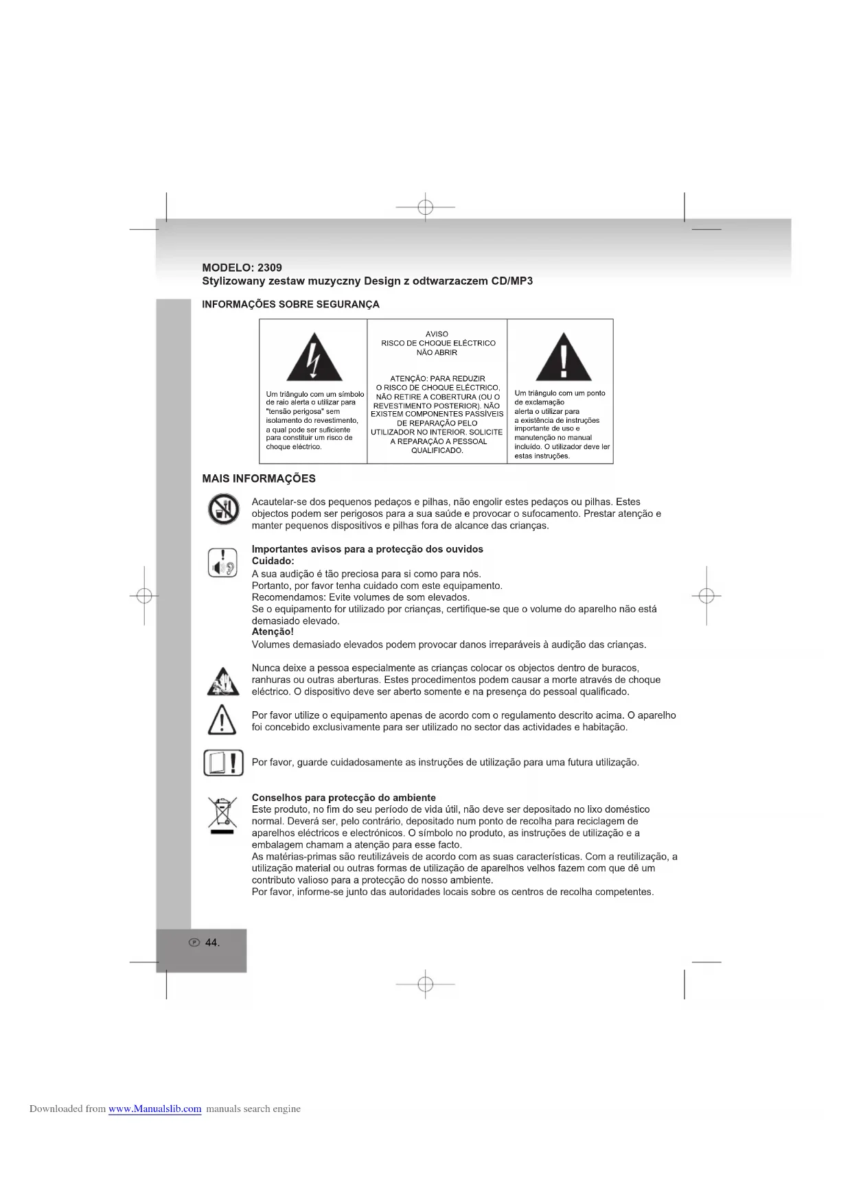 MODELO: 2309 Stylizowany zestaw muzyczny Design z odtwarzaczem CD/MP3 AVISORISCO DE CHOQUE ELÉCTRICONÃO ABRIRATENÇÃO: PARA REDUZIRO RISCO DE CHOQUE ELÉCTRICO,NÃO RETIRE A COBERTURA (OU O REVESTIMENTO POSTERIOR). NÃO EXISTEM COMPONENTES PASSÍVEIS DE REPARAÇÃO PELO UTILIZADOR NO INTERIOR. SOLICITE A REPARAÇÃO A PESSOALQUALIFICADO.Um triângulo com um ponto de exclamaçãoalerta o utilizar paraa existência de instruções importante de uso emanutenção no manualincluído. O utilizador deve ler estas instruções.Um triângulo com um símbolo de raio alerta o utilizar para"tensão perigosa" sem isolamento do revestimento, a qual pode ser suficiente para constituir um risco dechoque eléctrico.Acautelar-se dos pequenos pedaços e pilhas, não engolir estes pedaços ou pilhas. Estes objectos podem ser perigosos para a sua saúde e provocar o sufocamento. Prestar atenção e manter pequenos dispositivos e pilhas fora de alcance das crianças.Importantes avisos para a protecção dos ouvidosCuidado:A sua audição é tão preciosa para si como para nós.Portanto, por favor tenha cuidado com este equipamento.Recomendamos: Evite volumes de som elevados.Se o equipamento for utilizado por crianças, certifique-se que o volume do aparelho não está demasiado elevado.Atenção!Volumes demasiado elevados podem provocar danos irreparáveis à audição das crianças.Nunca deixe a pessoa especialmente as crianças colocar os objectos dentro de buracos, ranhuras ou outras aberturas. Estes procedimentos podem causar a morte através de choque eléctrico. O dispositivo deve ser aberto somente e na presença do pessoal qualificado.Por favor utilize o equipamento apenas de acordo com o regulamento descrito acima. O aparelho foi concebido exclusivamente para ser utilizado no sector das actividades e habitação.Por favor, guarde cuidadosamente as instruções de utilização para uma futura utilização.Conselhos para protecção do ambienteEste produto, no fim do seu período de vida útil, não deve ser depositado no lixo doméstico normal. Deverá ser, pelo contrário, depositado num ponto de recolha para reciclagem de aparelhos eléctricos e electrónicos. O símbolo no produto, as instruções de utilização e a embalagem chamam a atenção para esse facto.As matérias-primas são reutilizáveis de acordo com as suas características. Com a reutilização, a utilização material ou outras formas de utilização de aparelhos velhos fazem com que dê um contributo valioso para a protecção do nosso ambiente.Por favor, informe-se junto das autoridades locais sobre os centros de recolha competentes.