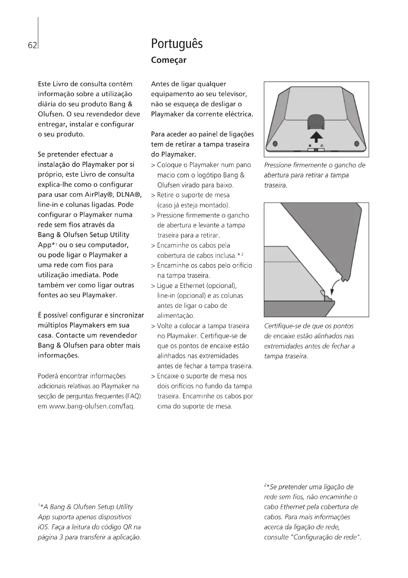 ou o seu computador, ou pode ligar o Playmaker a uma rede com os para utilização imediata. Pode também ver como ligar outras fontes ao seu Playmaker. É possível congurar e sincronizar múltiplos Playmakers em sua casa. Contacte um revendedor Bang & Olufsen para obter mais informações. Poderá encontrar informações adicionais relativas ao Playmaker na secção de perguntas frequentes (FAQ) em www.bang-olufsen.com/faq. Antes de ligar qualquer equipamento ao seu televisor, não se esqueça de desligar o Playmaker da corrente eléctrica. Para aceder ao painel de ligações tem de retirar a tampa traseira do Playmaker. > Coloque o Playmaker num pano macio com o logótipo Bang& Olufsen virado para baixo. > Retire o suporte de mesa (caso já esteja montado). > Pressione rmemente o gancho de abertura e levante a tampa traseira para a retirar. > Encaminhe os cabos pela cobertura de cabos inclusa.*