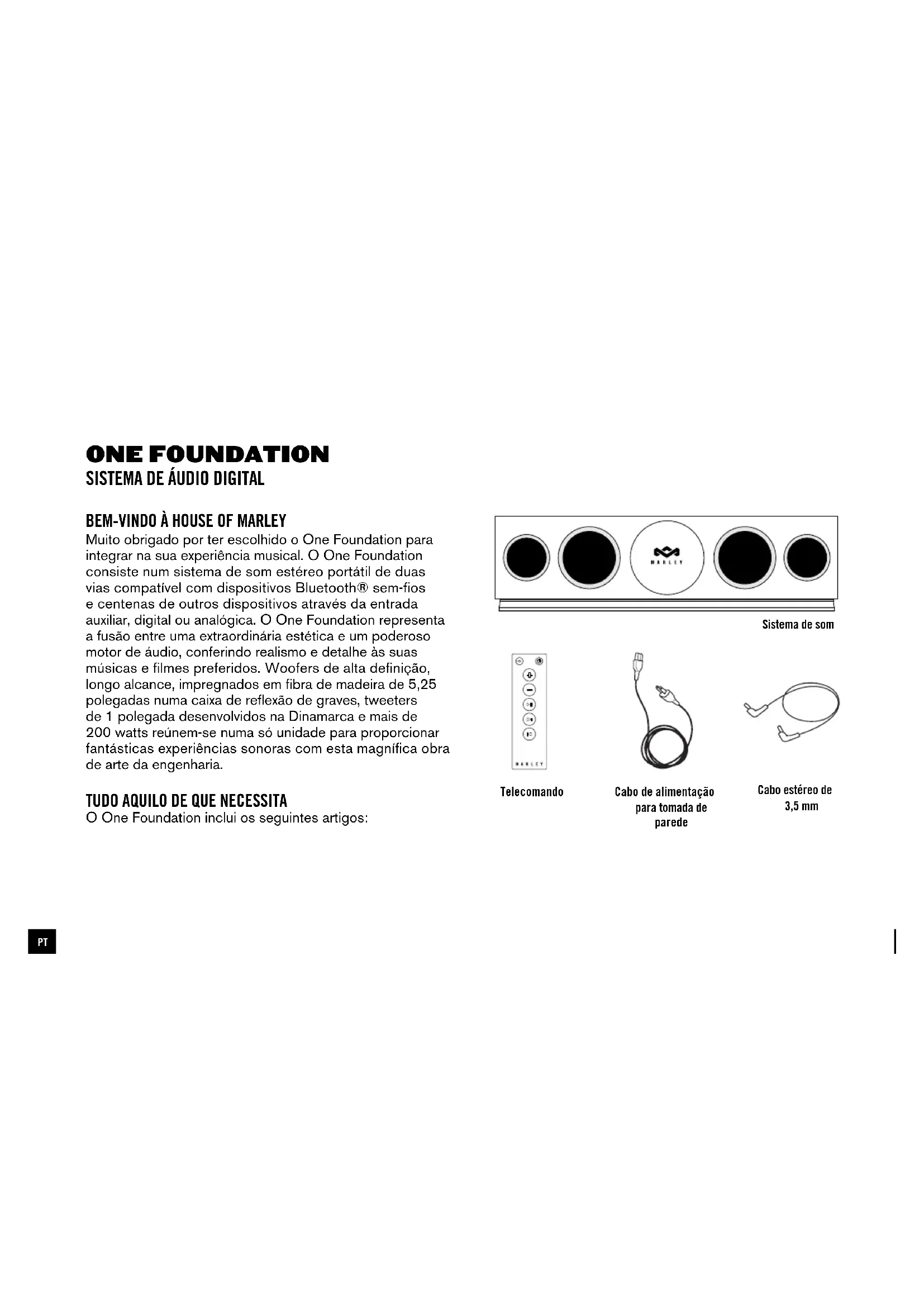 Muito obrigado por ter escolhido o One Foundation para integrar na sua experiência musical. O One Foundation consiste num sistema de som estéreo portátil de duas vias compatível com dispositivos Bluetooth® sem-fios e centenas de outros dispositivos através da entrada auxiliar, digital ou analógica. O One Foundation representa a fusão entre uma extraordinária estética e um poderoso motor de áudio, conferindo realismo e detalhe às suas músicas e filmes preferidos. Woofers de alta definição, longo alcance, impregnados em fibra de madeira de 5,25 polegadas numa caixa de reflexão de graves, tweeters de 1 polegada desenvolvidos na Dinamarca e mais de 200 watts reúnem-se numa só unidade para proporcionar fantásticas experiências sonoras com esta magnífica obra de arte da engenharia.