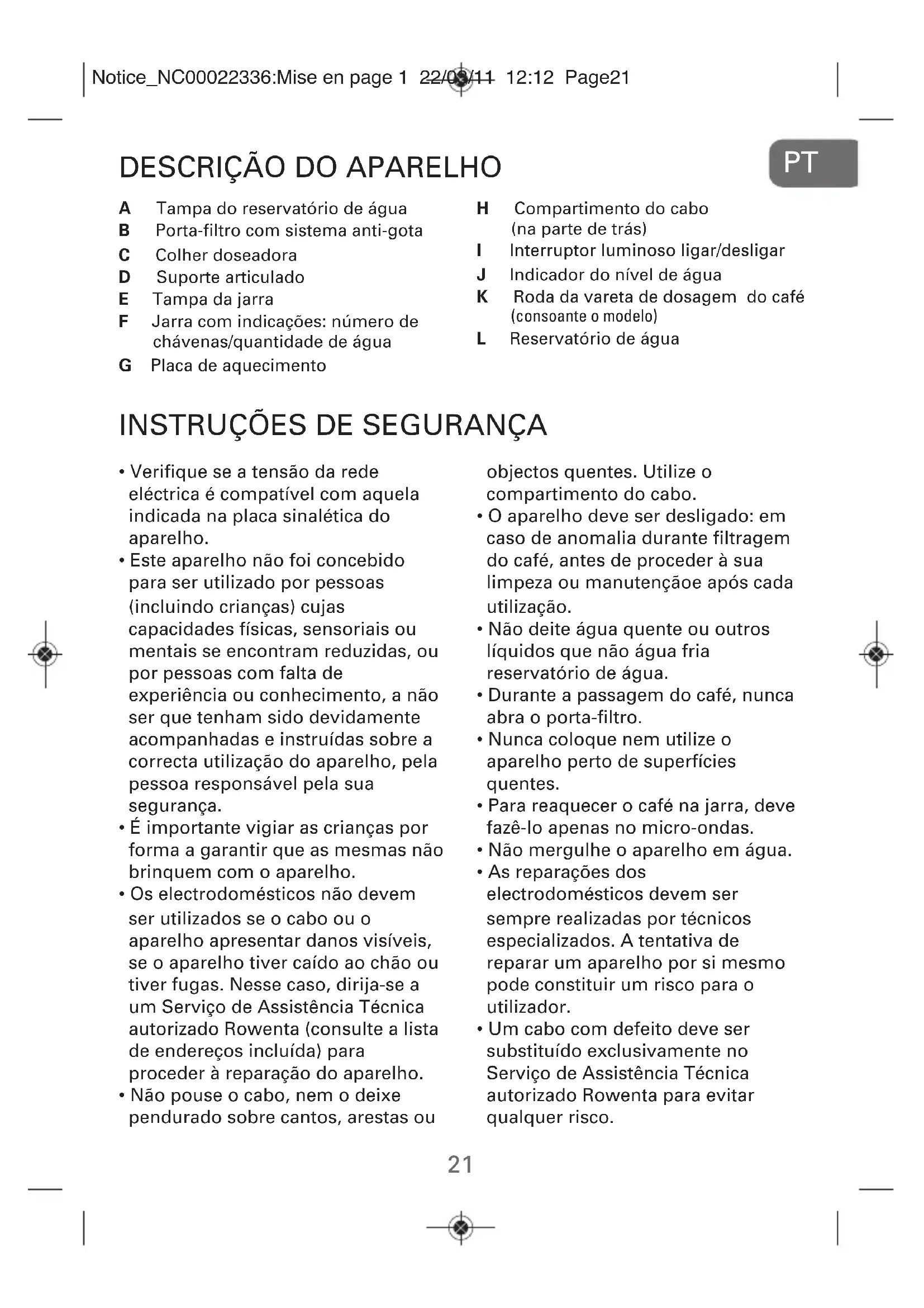 H Compartimento do cabo (na parte de trás) I Interruptor luminoso ligar/desligar J Indicador do nível de água K Roda da vareta de dosagem do café (consoante o modelo) L Reservatório de água A Tampa do reservatório de água B Porta-filtro com sistema anti-gota C Colher doseadora D Suporte articulado E Tampa da jarra F Jarra com indicações: número de chávenas/quantidade de água G Placa de aquecimento objectos quentes. Utilize o compartimento do cabo.