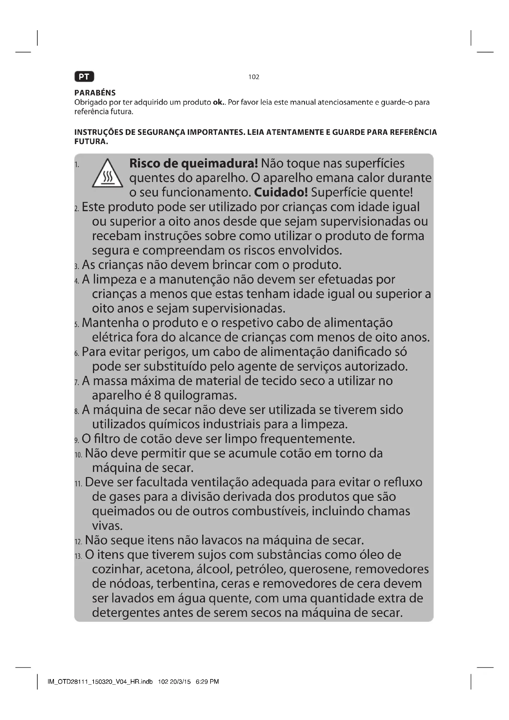 O itens que tiverem sujos comsubstancias como oleo de cozinhar, acetona, alcool, petroleo, querosene, removedores de nodos, terbentina, ceras e removeados de cera devem ser lavados em agua quente, com una quantidade extra de detergentes antes de serem secs naquina de secar.