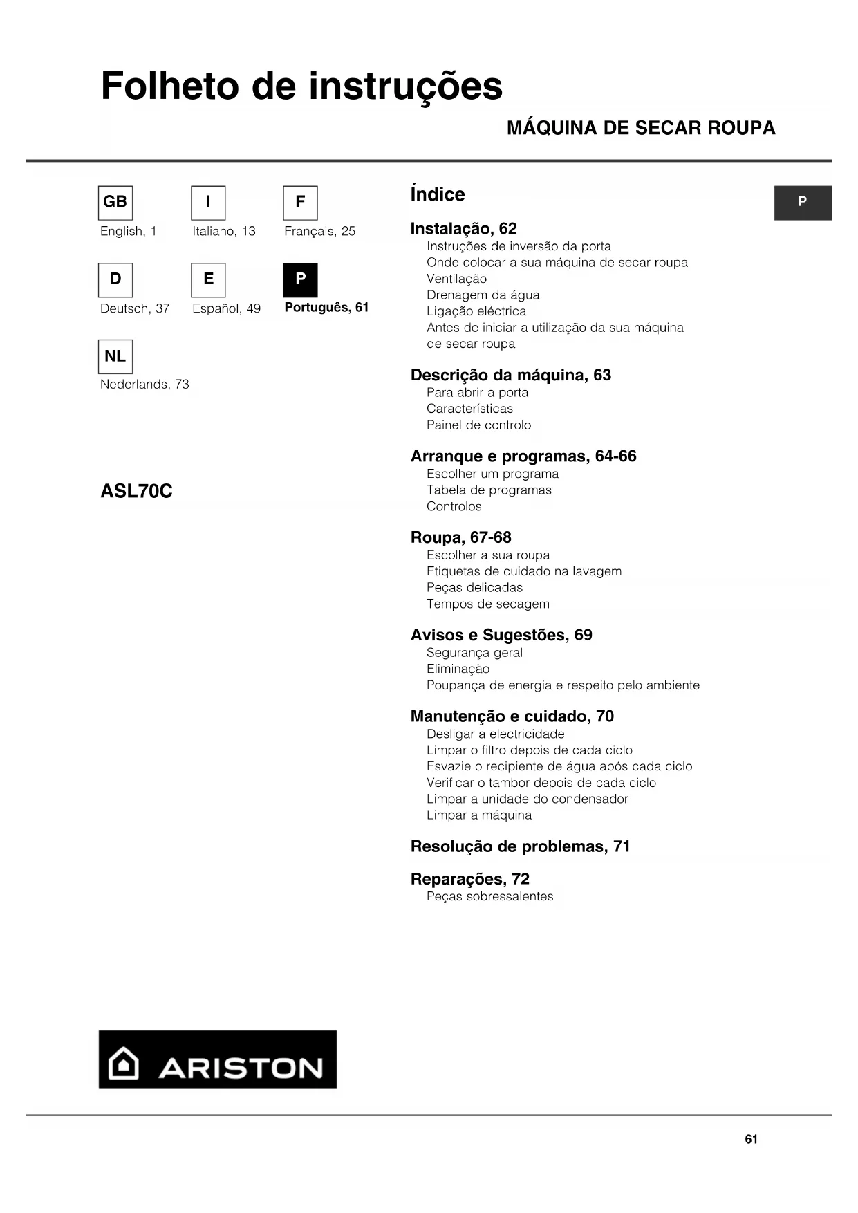 ASL70C Folheto de instruções Instalação, 62 Instruções de inversão da porta Onde colocar a sua máquina de secar roupa Ventilação Drenagem da água Ligação eléctrica Antes de iniciar a utilização da sua máquina de secar roupa Descrição da máquina, 63 Para abrir a porta Características Painel de controlo Arranque e programas, 64-66 Escolher um programa Tabela de programas Controlos Roupa, 67-68 Escolher a sua roupa Etiquetas de cuidado na lavagem Peças delicadas Tempos de secagem Avisos e Sugestões, 69 Segurança geral Eliminação Poupança de energia e respeito pelo ambiente Manutenção e cuidado, 70 Desligar a electricidade Limpar o filtro depois de cada ciclo Esvazie o recipiente de água após cada ciclo Verificar o tambor depois de cada ciclo Limpar a unidade do condensador Limpar a máquina Resolução de problemas, 71 Reparações, 72 Peças sobressalentes