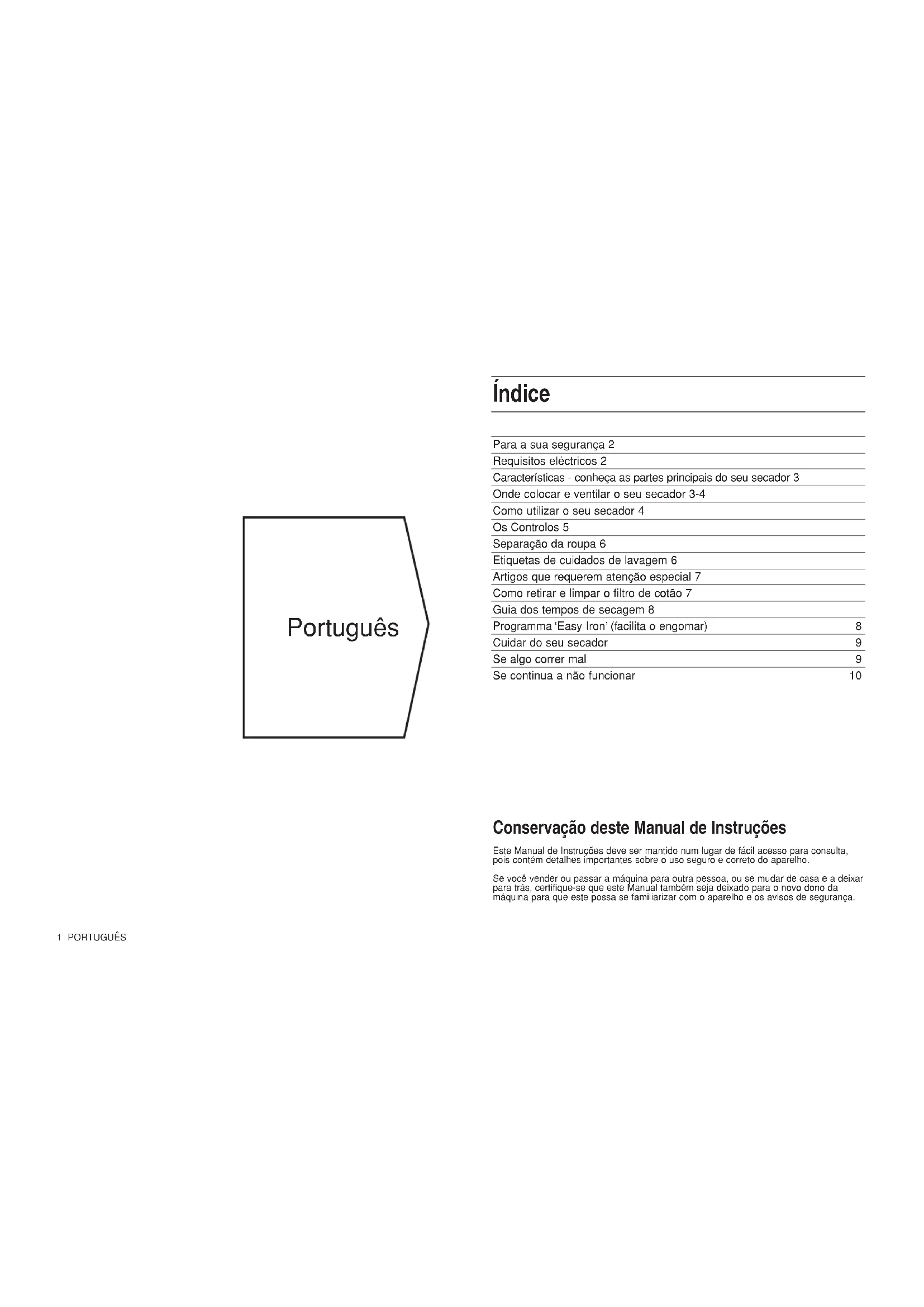 Le rogamos tenga toda esta información lista antes de llamar. Recuerde que su nuevo electrodoméstico es un aparato complejo. Los arreglos que haga usted mismo o personas no cualificadas, pueden ponerlo a usted en peligro o bien dañar la máquina, del mismo modo que puede hacer que pierda la garantía que cubre las piezas. En caso de que se presenten problemas en su secadora, no se arries- gue, llame a nuestro mecánico. Nuestras Piezas de Repuesto están diseñadas exclusivamente para que se ajusten a su electrodoméstico. No las use para ningún otro propósito, o de lo contrario podrá poner en riesgo su seguridad. Con el fin de reducir el riesgo de que se lastimen los niños, le rogamos se deshaga de su aparato de forma segura. Deberá quitarle la puerta y la tapa, así como cortar el cable por completo de forma que no pueda enchufarse en ninguna otra toma. A continuación deshágase de la secadora de forma segura. Este aparato se ajusta a las siguientes directivas de la CEE. Aparatos con Bajo Voltaje 72/23/CEE 93/68/CEE Compatibilidad Electromagnética 89/336/CEE 92/31/CEE 93/68/CEE Póngase en contacto con la Oficina de Servicio de Asistencia Técnica ESPAÑOL 10Português Para a sua segurança 2 Requisitos eléctricos 2 Características - conheça as partes principais do seu secador 3 Onde colocar e ventilar o seu secador 3-4 Como utilizar o seu secador 4 Os Controlos 5 Separação da roupa 6 Etiquetas de cuidados de lavagem 6 Artigos que requerem atenção especial 7 Como retirar e limpar o filtro de cotão 7 Guia dos tempos de secagem 8 Programma ‘Easy Iron’ (facilita o engomar) 8 Cuidar do seu secador 9 Se algo correr mal 9 Se continua a não funcionar 10 Índice 1 PORTUGUÊS Conservação deste Manual de Instruções Este Manual de Instruções deve ser mantido num lugar de fácil acesso para consulta, pois contém detalhes importantes sobre o uso seguro e correto do aparelho. Se você vender ou passar a máquina para outra pessoa, ou se mudar de casa e a deixar para trás, certifique-se que este Manual também seja deixado para o novo dono da máquina para que este possa se familiarizar com o aparelho e os avisos de segurança.Para a sua segurança NUNCA ● Deixe que crianças brinquem com o secador ou interfiram de qualquer maneira com o mesmo. NUNCA ● Deixe obstruir a entrada de ar na traseira do secador, a saída de ar ou a mangueira de ventilação. NUNCA ● Direccione a saída da mangueira de ventilação para a entrada de ar na traseira da máquina. NUNCA ● Deixe que o secador recicle o ar expelido. NUNCA ● Desligue a máquina deixando uma carga quente no tambor. NUNCA ● Seque sem o filtro em posição. NUNCA ● Exceda a capacidade de carga máxima recomendada ou coloque artigos a pingar no tambor. NUNCA ● Utilize o secador num piso com alcatifa onde a altura do pêlo impeça que o ar entre no secador através da base. NUNCA ● Deixe que se acumule cotão em volta do secador. NUNCA ● Acrescente líquido ou amaciador de tecidos ao secador, utilize o líquido amaciador no enxaguamento final da lavagem. NUNCA ● Utilize o secador para secagem comercial, o secador só é adequado para uso doméstico. NUNCA ● Seque acrílicos no ajuste de calor máximo. NUNCA ● Seque artigos que NÃO tenham sido bem lavados em água e detergente e a seguir bem enxaguados. NUNCA ● Secar artigos que contenham produtos químicos empregados em limpezas. NUNCA ● Seque artigos que estejam contaminados com substâncias inflamáveis tais como: petróleo, óleo, tinta, lacas de cabelo, cremes, gordura ou óleo de cozinhar. NUNCA ● Seque: borracha, borracha esponjosa, plástico, espuma plástica, cuecas de plástico ou resguardos, politeno ou papel. Artigos grandes, volumosos incluindo edredões e sacos de dormir. NUNCA ● Tente pôr-se em pé em cima do secador de roupa, este não foi concebido para tal e pode ferir-se ou danificar o secador abusando dele. NUNCA ● Ligue ou desligue a electricidade com as mãos molhadas. IMPORTANTE A utilização do seu secador de roupa é fácil. No entanto, para a sua própria segurança e para obter os melhores resultados é importante conhecer o secador de roupa através deste manual antes de o utilizar pela primeira vez. UMA CRIANÇA PODE ENTRAR OU MEXER INDEVIDAMENTE NUM SECADOR DE ROUPA NÃO VIGIADO. QUANDO A MÁQUINA NÃO ESTIVER A SER UTILIZADA DESLIGUE-A, RETIRE A FICHA DA TOMADA E FECHE A PORTA. IMPORTANTE Para a sua segurança SEMPRE ● Quando o secador não estiver em utilização, desligue-o, retire a ficha da tomada e feche a porta. SEMPRE ● Cumpra os requisitos eléctricos especificados. SEMPRE ● Certifique-se de que o seu secador de roupa está instalado correctamente e possui ventilação adequada. (veja, “Onde colocar e ventilar o seu secador.”) SEMPRE ● Utilize a mangueira de ventilação para desempenho óptimo de secagem. SEMPRE ● Termine todos os programas com o ciclo frio de secagem fornecido no controlo. SEMPRE ● Limpe o filtro, é essencial que o filtro seja limpo e mantido sempre sem cotão. SEMPRE ● Cumpra as regras para a secagem dos artigos de roupa: Em especial, os artigos de lã, não devem ser secos num secador, a não ser que estes possuam a etiqueta ‘Superwash’, ‘Lavável na máquina’ ou tiverem o símbolo ‘Pode ser seco na máquina’: Se tiver dúvidas não seque lã na máquina. Ao contrário de outros materiais, o mecanismo de encolhimento da lã é irreversível, ou seja, não estica de novo para o tamanho ou forma originais. SEMPRE ● Compre acessórios originais e peças sobresselentes. Requisitos eléctricos VEJA A PLACA DE ESPECIFICAÇÕES QUANTO AOS REQUISI- TOS DE TENSÃO E CORRENTE. (veja o diagrama quanto à localização.) O secador de roupa deve ser ligado à alimentação da rede através de uma tomada adequada que fique acessível após a instalação. Os fios do cabo de alimentação estão coloridos de acordo com o seguinte: