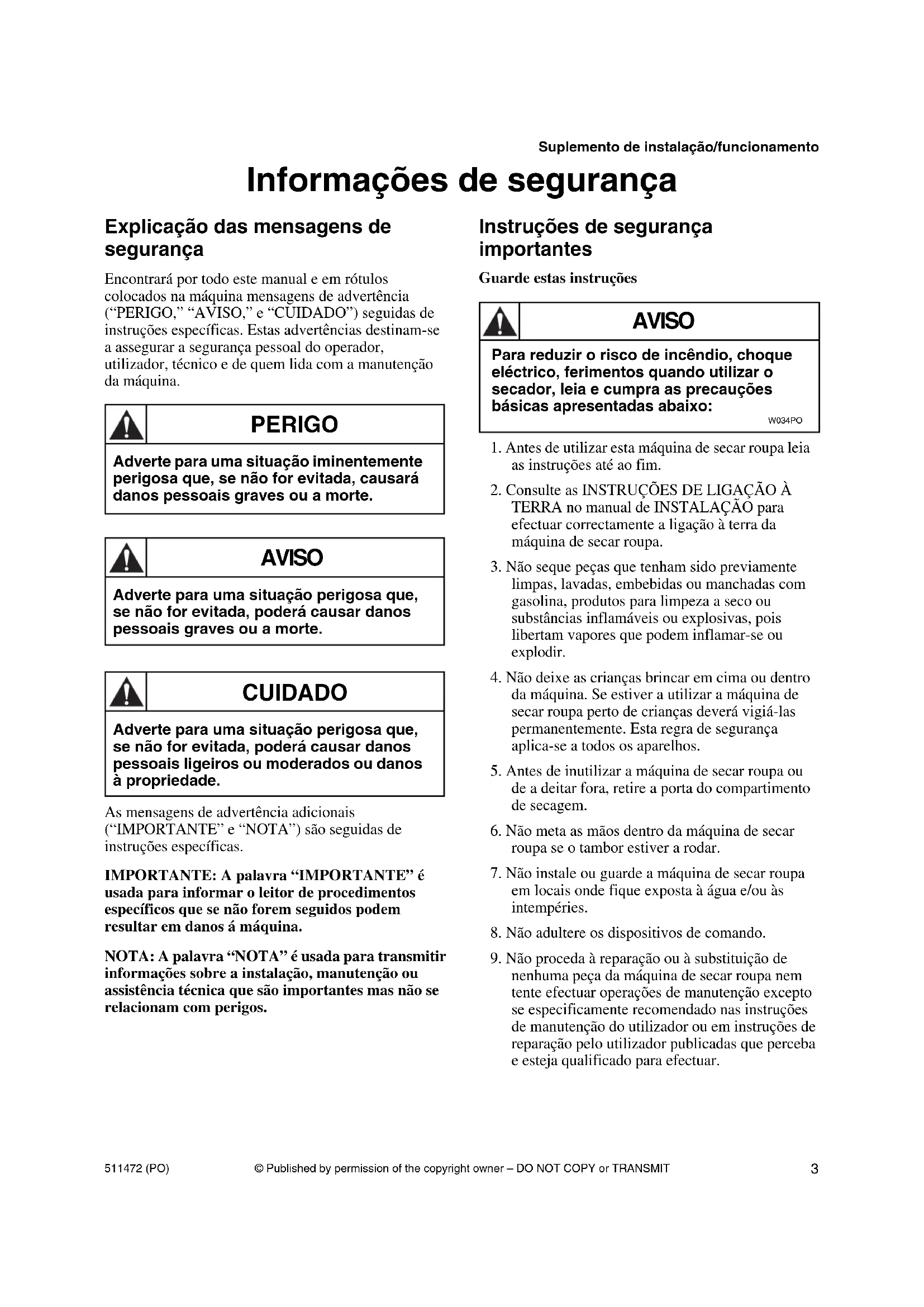 nenhuma peça da máquina de secar roupa nem tente efectuar operações de manutenção excepto se especificamente recomendado nas instruções de manutenção do utilizador ou em instruções de reparação pelo utilizador publicadas que perceba e esteja qualificado para efectuar. Adverte para uma situação iminentemente perigosa que, se não for evitada, causará danos pessoais graves ou a morte. PERIGO Adverte para uma situação perigosa que, se não for evitada, poderá causar danos pessoais graves ou a morte. AVISO Adverte para uma situação perigosa que, se não for evitada, poderá causar danos pessoais ligeiros ou moderados ou danos à propriedade. CUIDADO Para reduzir o risco de incêndio, choque eléctrico, ferimentos quando utilizar o secador, leia e cumpra as precauções básicas apresentadas abaixo: W034PO AVISO© Published by permission of the copyright owner – DO NOT COPY or TRANSMIT Suplemento de instalação/funcionamento 511472 (PO)