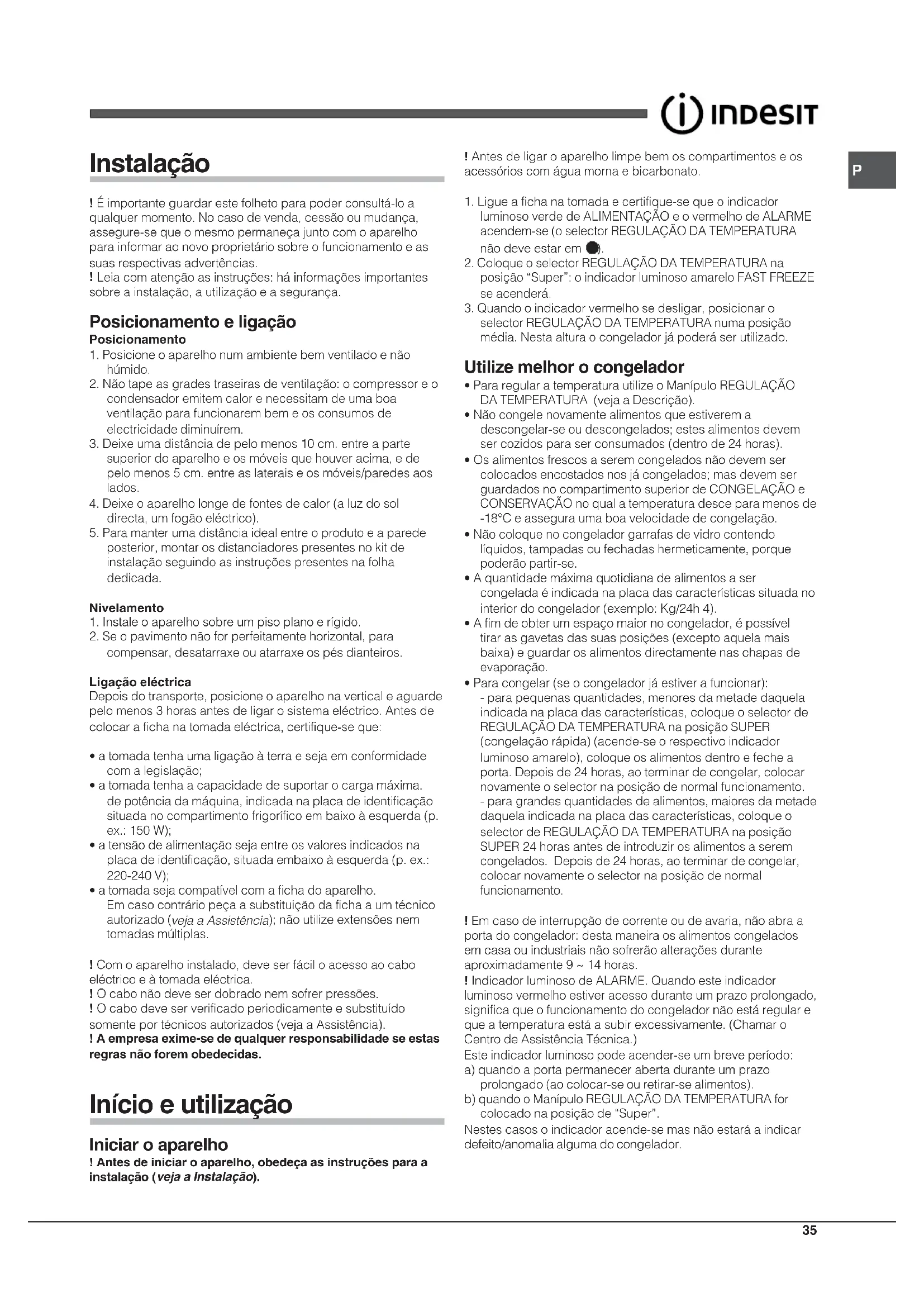 ! Antes de ligar o aparelho limpe bem os compartimentos e osacessórios com água morna e bicarbonato.1. Ligue a ficha na tomada e certifique-se que o indicadorluminoso verde de ALIMENTAÇÃO e o vermelho de ALARMEacendem-se (o selector REGULAÇÃO DA TEMPERATURAnão deve estar em 2. Coloque o selector REGULAÇÃO DA TEMPERATURA naposição “Super”: o indicador luminoso amarelo FAST FREEZEse acenderá.3. Quando o indicador vermelho se desligar, posicionar oselector REGULAÇÃO DA TEMPERATURA numa posiçãomédia. Nesta altura o congelador já poderá ser utilizado. Utilize melhor o congelador