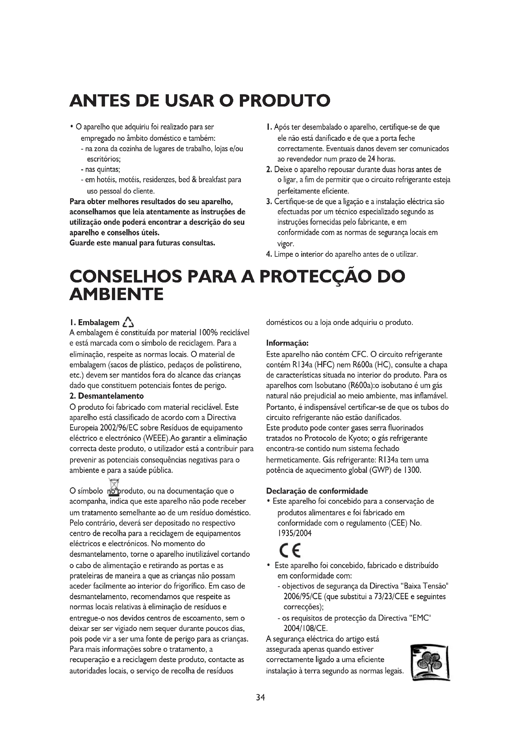 O produto foi fabricado com material reciclável. Este aparelho está classificado de acordo com a Directiva Europeia 2002/96/EC sobre Resíduos de equipamento eléctrico e electrónico (WEEE).Ao garantir a eliminação correcta deste produto, o utilizador está a contribuir para prevenir as potenciais consequências negativas para o ambiente e para a saúde pública. O símbolo no produto, ou na documentação que o acompanha, indica que este aparelho não pode receber um tratamento semelhante ao de um resíduo doméstico. Pelo contrário, deverá ser depositado no respectivo centro de recolha para a reciclagem de equipamentos eléctricos e electrónicos. No momento do desmantelamento, torne o aparelho inutilizável cortando o cabo de alimentação e retirando as portas e as prateleiras de maneira a que as crianças não possam aceder facilmente ao interior do frigorífico. Em caso de desmantelamento, recomendamos que respeite as normas locais relativas à eliminação de resíduos e entregue-o nos devidos centros de escoamento, sem o deixar ser ser vigiado nem sequer durante poucos dias, pois pode vir a ser uma fonte de perigo para as crianças. Para mais informações sobre o tratamento, a recuperação e a reciclagem deste produto, contacte as autoridades locais, o serviço de recolha de resíduos domésticos ou a loja onde adquiriu o produto. Informação: Este aparelho não contém CFC. O circuito refrigerante contém R134a (HFC) nem R600a (HC), consulte a chapa de características situada no interior do produto. Para os aparelhos com Isobutano (R600a):o isobutano é um gás natural não prejudicial ao meio ambiente, mas inflamável. Portanto, é indispensável certificar-se de que os tubos do circuito refrigerante não estão danificados. Este produto pode conter gases serra fluorinados tratados no Protocolo de Kyoto; o gás refrigerante encontra-se contido num sistema fechado hermeticamente. Gás refrigerante: R134a tem uma potência de aquecimento global (GWP) de 1300. Declaração de conformidade