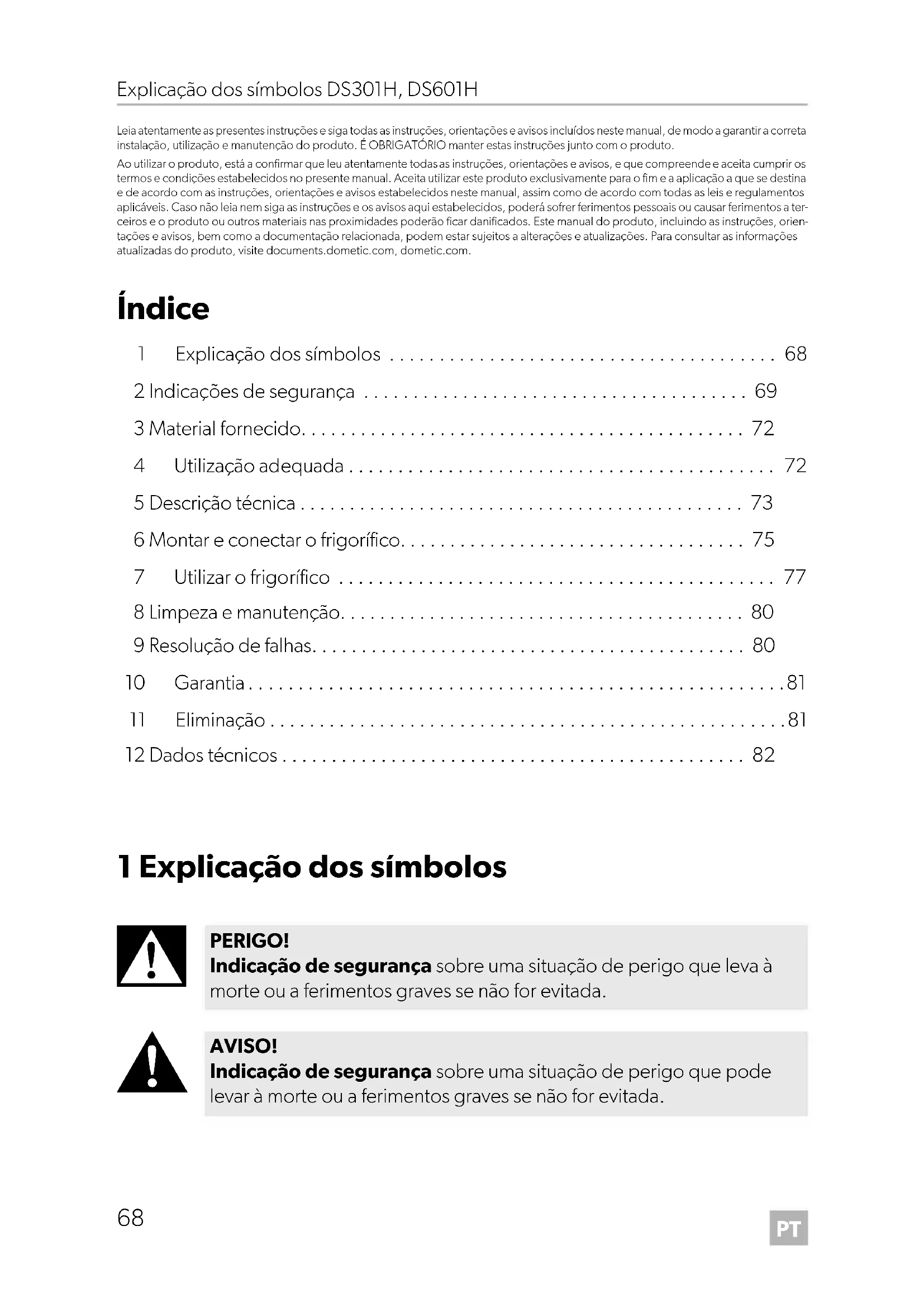 - Leia atentamente as presentes instruções e siga todas as instruções, orientações e avisos incluídos neste manual, de modo a garantir a correta instalação, utilização e manutenção do produto. É OBRIGATÓRIO manter estas instruções junto com o produto. Ao utilizar o produto, está a confirmar que leu atentamente todas as instruções, orientações e avisos, e que compreende e aceita cumprir os termos e condições estabelecidos no presente manual. Aceita utilizar este produto exclusivamente para o fim e a aplicação a que se destina e de acordo com as instruções, orientações e avisos estabelecidos neste manual, assim como de acordo com todas as leis e regulamentos aplicáveis. Caso não leia nem siga as instruções e os avisos aqui estabelecidos, poderá sofrer ferimentos pessoais ou causar ferimentos a ter- ceiros e o produto ou outros materiais nas proximidades poderão ficar danificados. Este manual do produto, incluindo as instruções, orien- tações e avisos, bem como a documentação relacionada, podem estar sujeitos a alterações e atualizações. Para consultar as informações atualizadas do produto, visite documents.dometic.com, dometic.com. Índice 1 Explicação dos símbolos p. 68