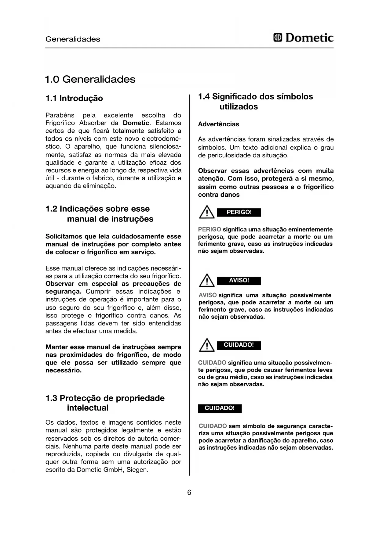 utilizados As advertências foram sinalizadas através de símbolos. Um texto adicional explica o grau de periculosidade da situação. Observar essas advertências com muita atenção. Com isso, protegerá a si mesmo, assim como outras pessoas e o frigorífico contra danos Advertências PERIGO significa uma situação eminentemente perigosa, que pode acarretar a morte ou um ferimento grave, caso as instruções indicadas não sejam observadas. PERIGO! AVISO significa uma situação possivelmente perigosa, que pode acarretar a morte ou um ferimento grave, caso as instruções indicadas não sejam observadas. AVISO! CUIDADO significa uma situação possivelmen- te perigosa, que pode causar ferimentos leves ou de grau médio, caso as instruções indicadas não sejam observadas. CUIDADO! CUIDADO sem símbolo de segurança caracte- riza uma situação possivelmente perigosa que pode acarretar a danificação do aparelho, caso as instruções indicadas não sejam observadas. CUIDADO!7 Generalidades As prestações de garantia são cumpridas segundo a Directiva europeia 44/1999/EC e as condições usuais do país em questão. Caso pretenda exigir garantia, contacte o seu con- cessionário. Estão excluídos da prestação de garantia, defeitos causados por um manuseio errado. A garantia irá caducar e não será assumida nenhuma responsabilidade, caso o aparelho sofra alteração ou forem empregues peças de reposição que não sejam peças originais da Dometic e ainda se as instruçõ- es de montagem e de uso do aparelho não forem devidamente seguidas.