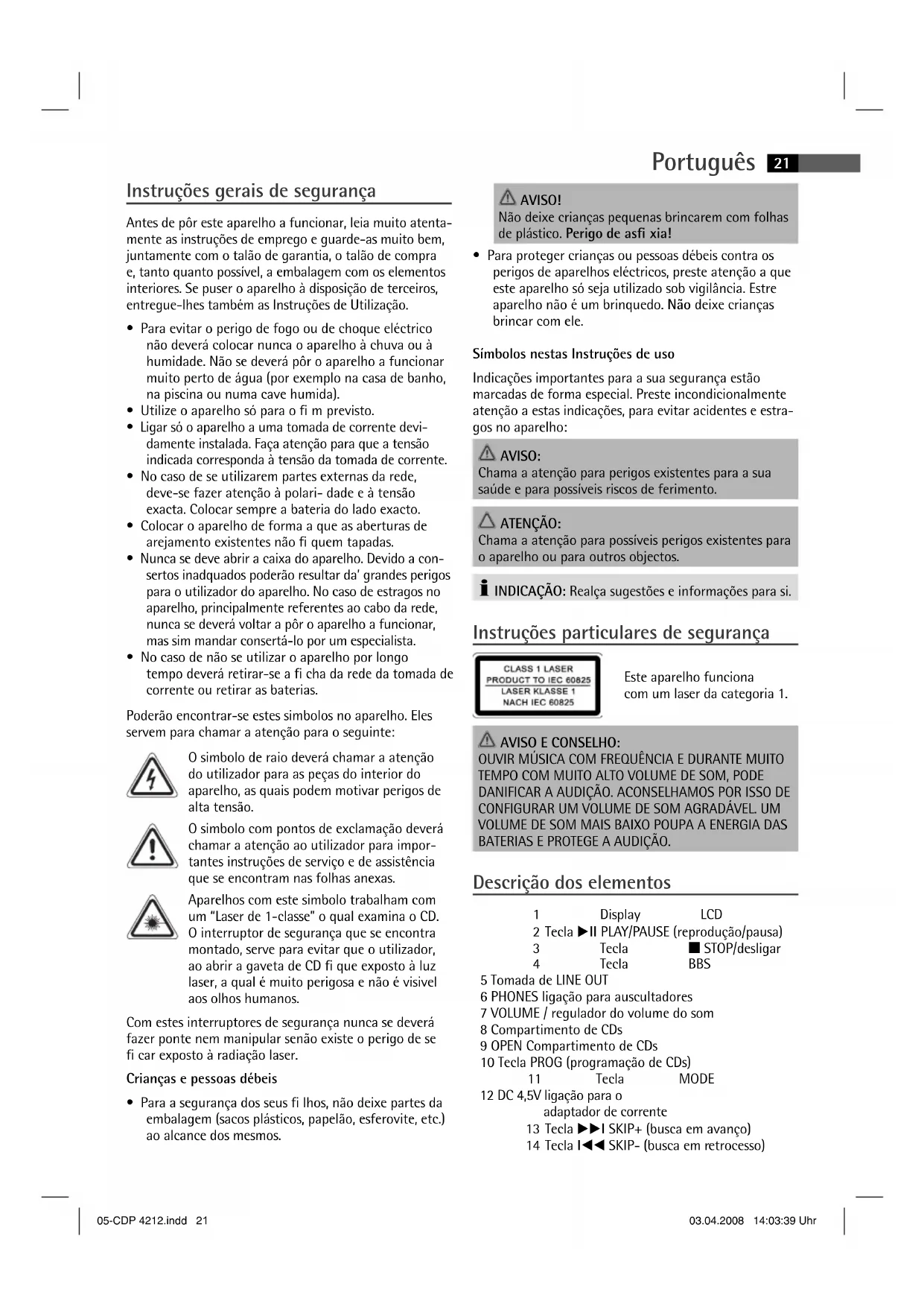 - Para proteger crianças ou pessoas débeis contra os perigos de aparelhos eléctricos, preste atenção a que este aparelho só seja utilizado sob vigilância. Estre aparelho não é um brinquedo. Não deixe crianças brincar com ele. Símbolos nestas Instruções de uso Indicações importantes para a sua segurança estão marcadas de forma especial. Preste incondicionalmente atenção a estas indicações, para evitar acidentes e estra- gos no aparelho: AVISO: Chama a atenção para perigos existentes para a sua saúde e para possíveis riscos de ferimento. ATENÇÃO: Chama a atenção para possíveis perigos existentes para o aparelho ou para outros objectos. 쫵 INDICAÇÃO: Realça sugestões e informações para si. Instruções particulares de segurança Este aparelho funciona com um laser da categoria 1. AVISO E CONSELHO: OUVIR MÚSICA COM FREQUÊNCIA E DURANTE MUITO TEMPO COM MUITO ALTO VOLUME DE SOM, PODE DANIFICAR A AUDIÇÃO. ACONSELHAMOS POR ISSO DE CONFIGURAR UM VOLUME DE SOM AGRADÁVEL. UM VOLUME DE SOM MAIS BAIXO POUPA A ENERGIA DAS BATERIAS E PROTEGE A AUDIÇÃO. Descrição dos elementos 1 Display LCD 2 Tecla 왘II PLAY/PAUSE (reprodução/pausa) 3 Tecla 왎 STOP/desligar 4 Tecla BBS 5 Tomada de LINE OUT 6 PHONES ligação para auscultadores 7 VOLUME / regulador do volume do som 8 Compartimento de CDs 9 OPEN Compartimento de CDs 10 Tecla PROG (programação de CDs) 11 Tecla MODE 12 DC 4,5V ligação para o adaptador de corrente 13 Tecla 왘왘I SKIP+ (busca em avanço) 14 Tecla I왗왗 SKIP- (busca em retrocesso) 21Português 05-CDP 4212.indd 05-CDP 4212.indd 22 03.04.2008 14:03:40 Uhr03.04.2008 14:03:40 Uhr 15 Tecla ESP/DIR 16 HOLD bloqueio de teclas 17 Compartimento de pilhas Utilização conforme à sua nalidade Este aparelho serve para