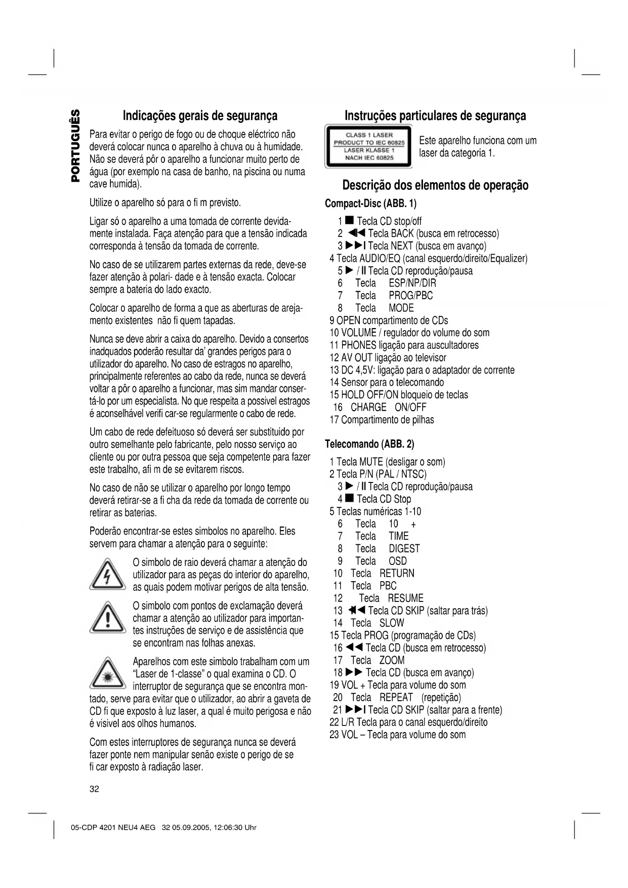 Aparelhos com este simbolo trabalham com um "Laser de 1-classe" o qual examina o CD. O interruptor de segurança que se encontra mon-