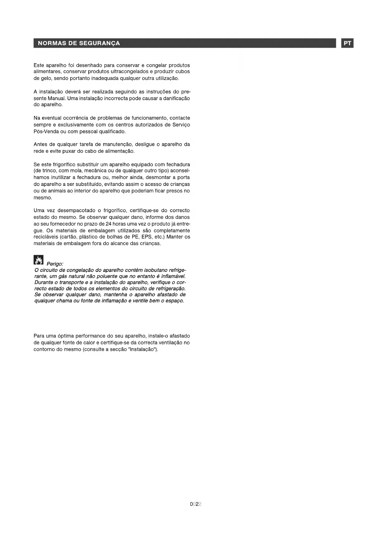 0011Este aparelho foi desenhado para conservar e congelar produtos alimentares, conservar produtos ultracongelados e produzir cubos de gelo, sendo portanto inadequada qualquer outra utilização. A instalação deverá ser realizada seguindo as instruções do pre- sente Manual. Uma instalação incorrecta pode causar a danificação do aparelho. Na eventual ocorrência de problemas de funcionamento, contacte sempre e exclusivamente com os centros autorizados de Serviço Pós-Venda ou com pessoal qualificado. Antes de qualquer tarefa de manutenção, desligue o aparelho da rede e evite puxar do cabo de alimentação. Se este frigorífico substituir um aparelho equipado com fechadura (de trinco, com mola, mecânica ou de qualquer outro tipo) aconsel- hamos inutilizar a fechadura ou, melhor ainda, desmontar a porta do aparelho a ser substituído, evitando assim o acesso de crianças ou de animais ao interior do aparelho que poderiam ficar presos no mesmo. Uma vez desempacotado o frigorífico, certifique-se do correcto estado do mesmo. Se observar qualquer dano, informe dos danos ao seu fornecedor no prazo de 24 horas uma vez o produto já entre- gue. Os materiais de embalagem utilizados são completamente recicláveis (cartão, plástico de bolhas de PE, EPS, etc.) Manter os materiais de embalagem fora do alcance das crianças. Para uma óptima performance do seu aparelho, instale-o afastado de qualquer fonte de calor e certifique-se da correcta ventilação no contorno do mesmo (consulte a secção "Instalação"). PPeerriiggoo:: OO cciirrccuuiittoo ddee ccoonnggeellaaççããoo ddoo aappaarreellhhoo ccoonnttéémm iissoobbuuttaannoo rreeffrriiggee-- rraannttee,, uumm ggááss nnaattuurraall nnããoo ppoolluueennttee qquuee nnoo eennttaannttoo éé iinnffllaammáávveell.. DDuurraannttee oo ttrraannssppoorrttee ee aa iinnssttaallaaççããoo ddoo aappaarreellhhoo,, vveerriiffiiqquuee oo ccoorr-- rreeccttoo eessttaaddoo ddee ttooddooss ooss eelleemmeennttooss ddoo cciirrccuuiittoo ddee rreeffrriiggeerraaççããoo.. SSee oobbsseerrvvaarr qquuaallqquueerr ddaannoo,, mmaanntteennhhaa oo aappaarreellhhoo aaffaassttaaddoo ddee qquuaallqquueerr cchhaammaa oouu ffoonnttee ddee iinnffllaammaaççããoo ee vveennttiillee bbeemm oo eessppaaççoo..