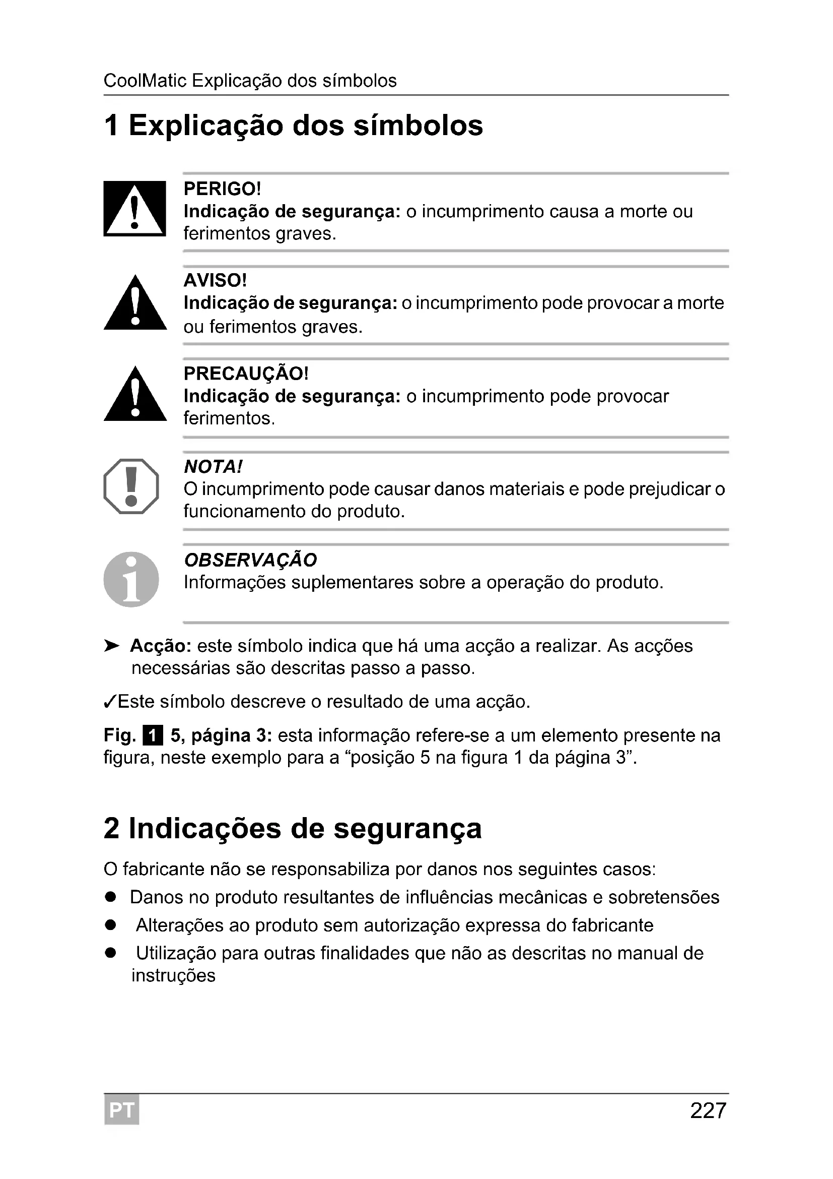 OBSERVAÇÃO Informações suplementares sobre a operação do produto. ➤ Acção: este símbolo indica que há uma acção a realizar. As acções necessárias são descritas passo a passo. ✓ Este símbolo descreve o resultado de uma acção. Fig. 1 5, página 3: esta informação refere-se a um elemento presente na figura, neste exemplo para a “posição 5 na figura 1 da página 3”. 2 Indicações de segurança O fabricante não se responsabiliza por danos nos seguintes casos: Danos no produto resultantes de influências mecânicas e sobretensões Alterações ao produto sem autorização expressa do fabricante Utilização para outras finalidades que não as descritas no manual de instruçõesPT Indicações de segurança CoolMatic