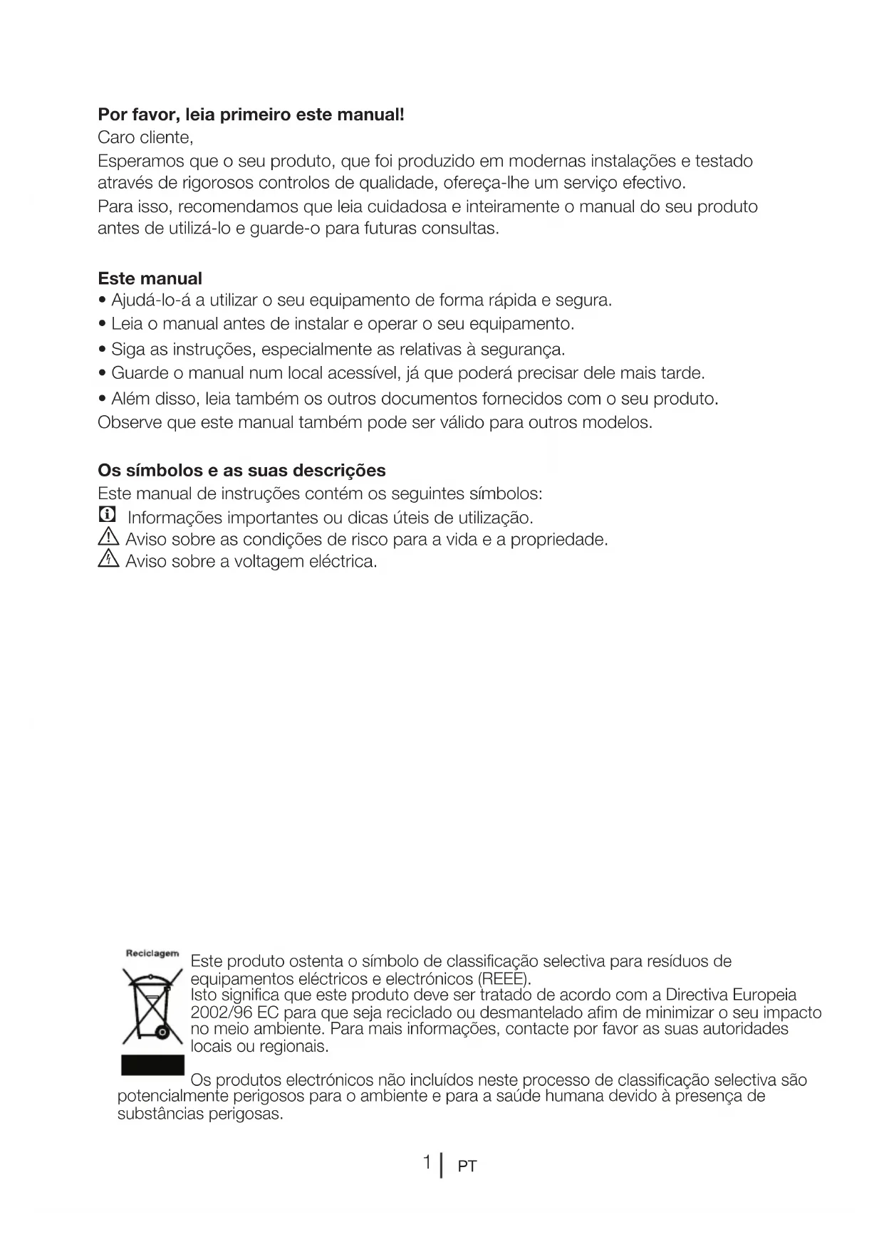- Além disso, leia também os outros documentos fornecidos com o seu produto. Observe que este manual também pode ser válido para outros modelos. Os símbolos e as suas descrições Este manual de instruções contém os seguintes símbolos: C Informações importantes ou dicas úteis de utilização. A Aviso sobre as condições de risco para a vida e a propriedade. B Aviso sobre a voltagem eléctrica. Este produto ostenta o símbolo de classificação selectiva para resíduos de equipamentos eléctricos e electrónicos (REEE). Isto significa que este produto deve ser tratado de acordo com a Directiva Europeia 2002/96 EC para que seja reciclado ou desmantelado afim de minimizar o seu impacto no meio ambiente. Para mais informações, contacte por favor as suas autoridades locais ou regionais. Os produtos electrónicos não incluídos neste processo de classificação selectiva são potencialmente perigosos para o ambiente e para a saúde humana devido à presença de substâncias perigosas.2