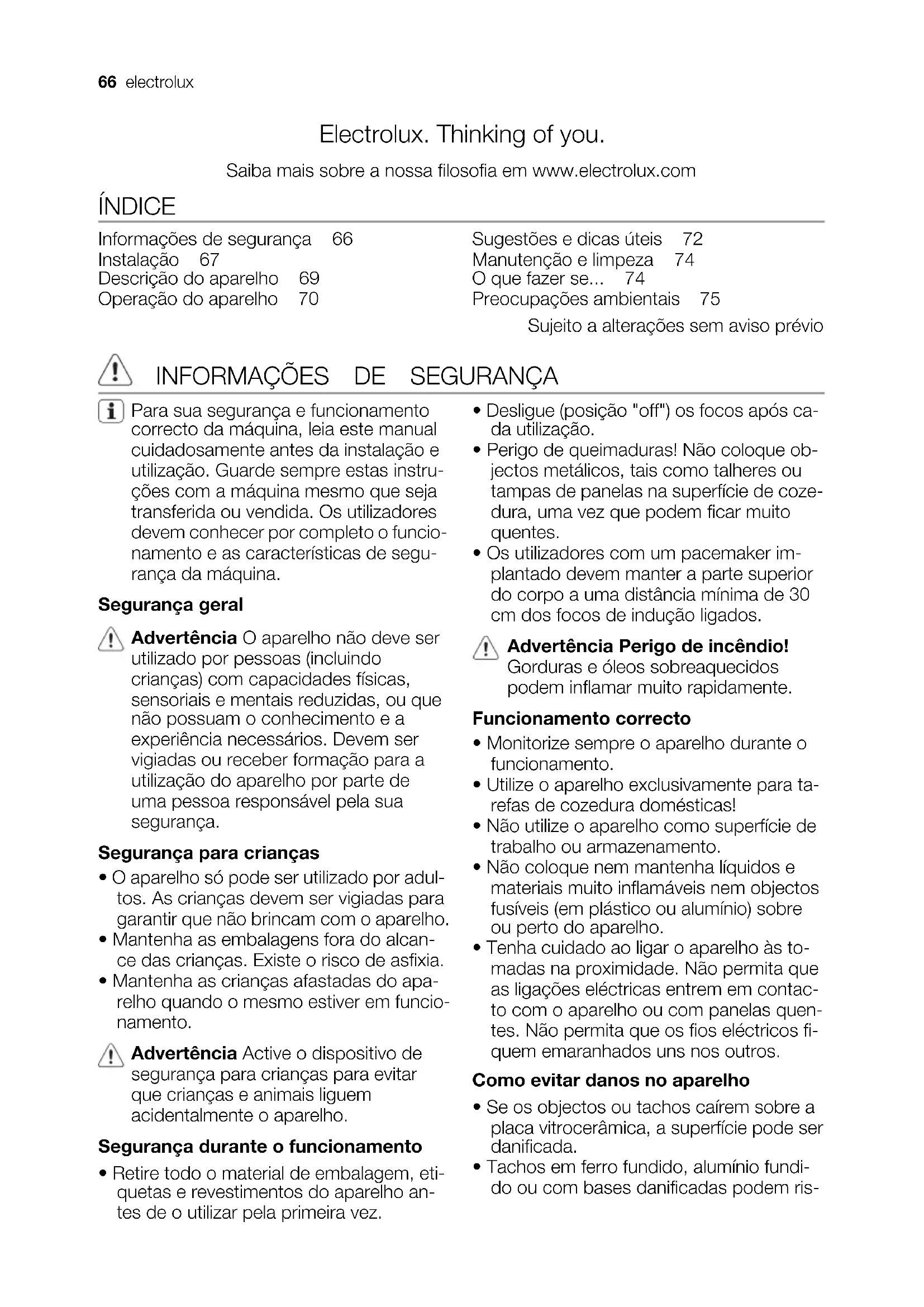 ELECTROLUX 220-240 V 50-60 Hz 7,4 kW Induction 7,4 kW Instruções de segurança Advertência Leia atentamente estas instruções! Certifique-se de que o aparelho não es- tá danificado devido ao transporte. Não ligue um aparelho danificado. Ca- so seja necessário, contacte o fornece- dor. O aparelho apenas pode ser instalado, ligado ou reparado por um técnico de assistência autorizado. Utilize apenas peças sobresselentes originais. Utilize apenas aparelhos de encastrar após montar o aparelho em unidades encastradas adequadas e superfícies de trabalho de acordo com as normas. Não altere as especificações nem mo- difique este produto. Risco de ferimen- tos e danos no aparelho. Respeite na totalidade as leis, regula- mentos, directivas e normas vigentes no país onde utiliza o aparelho (normas de segurança, normas de reciclagem, regras de segurança eléctrica, etc.). Deverão ser respeitadas as distâncias mínimas entre aparelhos! Instale uma protecção anti-choque, por exemplo, as gavetas só devem ser ins- taladas com um piso protector directa- mente por baixo do aparelho! Proteja as superfícies de corte da ban- cada contra a humidade utilizando um vedante adequado! Instale o aparelho na bancada, colocan- do um vedante adequado sem deixar folga! Proteja a parte inferior do aparelho con- tra vapor e humidade, por exemplo de uma máquina de lavar loiça ou de um forno! Não instale o aparelho perto de portas ou debaixo de janelas! Caso contrário, os tachos quentes podem ser derruba- dos sobre a placa ao abrir as portas ou janelas. Advertência Perigo de ferimentos devido a corrente eléctrica. Cumpra cuidadosamente as instruções para as ligações eléctricas.