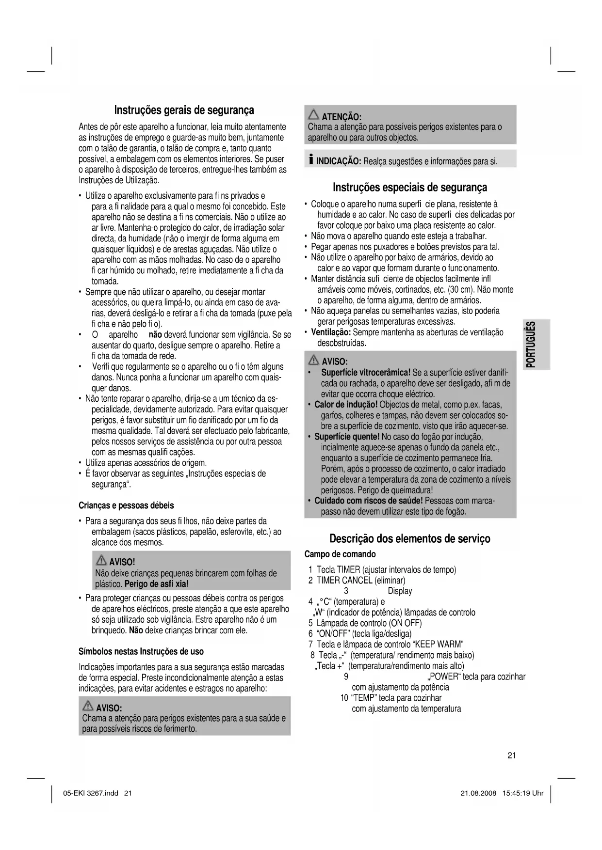 - Cuidado com riscos de saúde! Pessoas com marca- passo não devem utilizar este tipo de fogão. Descrição dos elementos de serviço Campo de comando 1 Tecla TIMER (ajustar intervalos de tempo) 2 TIMER CANCEL (eliminar) 3 Display 4 „°C“ (temperatura) e „W“ (indicador de potência) lâmpadas de controlo 5 Lâmpada de controlo (ON OFF) 6 “ON/OFF” (tecla liga/desliga) 7 Tecla e lâmpada de controlo “KEEP WARM” 8 Tecla „-“ (temperatura/ rendimento mais baixo) „Tecla +“ (temperatura/rendimento mais alto) 9 „POWER“ tecla para cozinhar com ajustamento da potência 10 “TEMP” tecla para cozinhar com ajustamento da temperatura 05-EKI 3267.indd 2105-EKI 3267.indd 21 21.08.2008 15:45:19 Uhr21.08.2008 15:45:19 Uhr22 PORTUGUÊS PORTUGUÊS Geral Cozinhar com indução Ao cozinhar com indução o calor é gerado através de forças magnéticas, esta função somente é iniciada depois que uma panela ou frigideira com fundo capaz de ser magnetizado é disposta sobre a zona de cozimento. Este processo aquece tão somente o fundo da panela/frigideira, e não a zona de cozimen- to como um todo. Abaixo da vitro-cerâmica há uma bobina de indução. Quando esta bobina é alimentada com corrente eléctri- ca, é gerado um campo magnético, que produz um remoinho no fundo da panela. Isto gera o aquecimento do fundo. Deste modo é economizada energia, visto que o calor somente é gerado no local onde ele é necessitado. Que tipo de panela etc. posso usar? Para os fogões por indução tem de ser utilizadas panelas etc. cujo fundo seja fabricado em uma material capaz de ser magnetizado. Este tipo de panela hoje em dia é produzido com a indicação de que o produto é adequado para fogões por indução. Basicamente podem ser utilizadas todas as panelas de ferro; para saber estas podem ser magnetizadas, faça um pequeno teste: Coloque a panela no fogão. Soando um sinal, depois que a função de cozimento foi seleccionada e o aparelho ligado, a panela é adequada. INDICAÇÃO: Por questões de segurança, o aparelho desliga de modo automático após alguns segundos no modo de espera. Estes materiais não podem ser utilizados no fogão: cerâmica, vidro ou alumínio. Estes panelas não podem ser utilizadas no fogão: Panelas com o fundo abaulado. Panelas cujo diâ- metro no fundo for inferior a 12cm. Panelas com pés. Conexão eléctrica Valor de conexão No total o fogão tem uma capacidade de rendimento de 2000 W. Com este valor de conexão, recomenda-se uma rede em separado com dispositivo de segurança por intermédio de um interruptor doméstico de segurança 16A. AVISO COM SOBRECARGA! Não utilize fi os de extensão ou tomadas múltiplas de corrente, visto que este é um aparelho de alta potência. Conexão