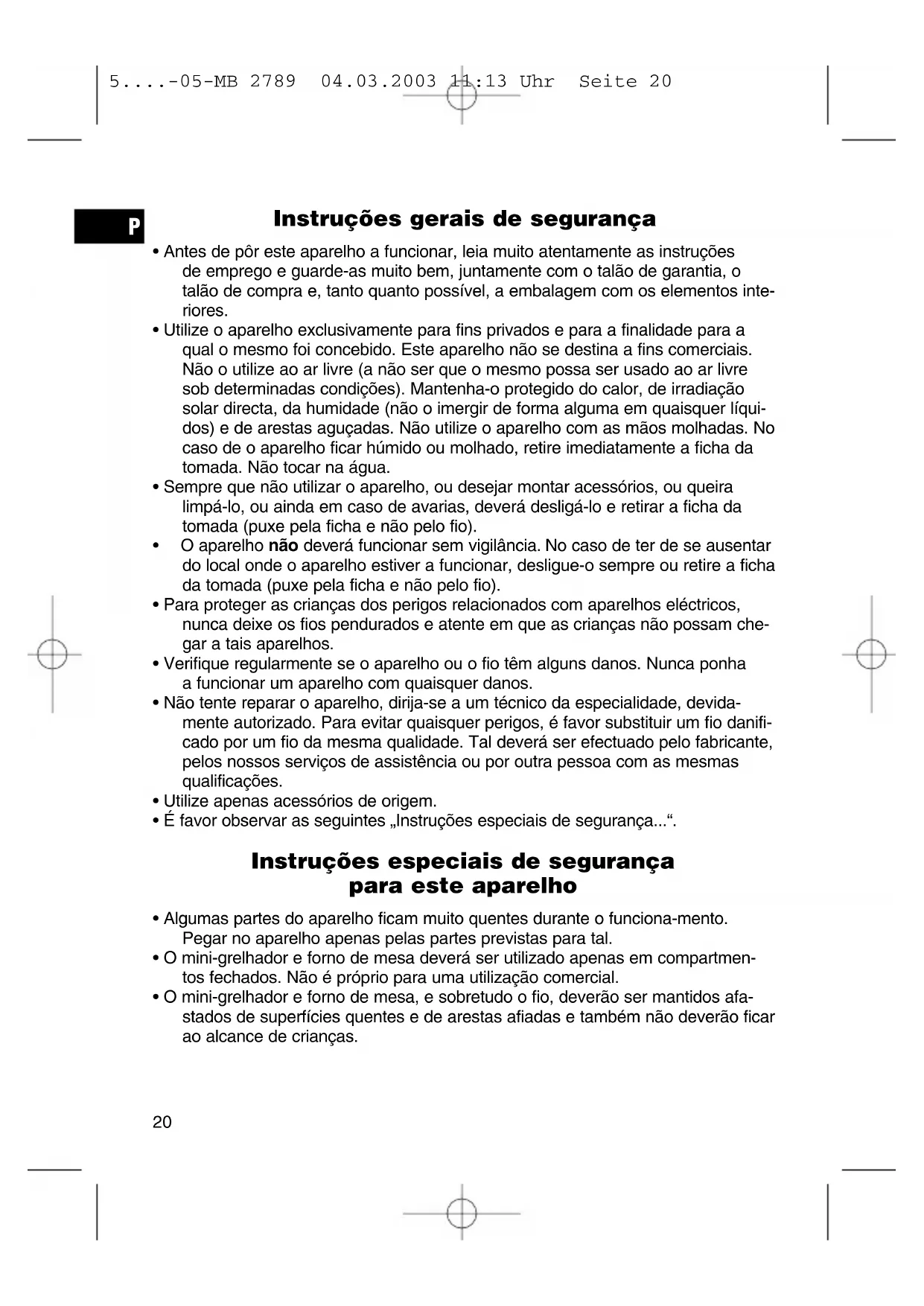 5....-05-MB 2789 04.03.2003 11:13 Uhr Seite 22O talão de compra consistirá prova desta garantia. Sem o mesmo, não será pos- sível proceder-se a qualquer troca ou reparação grátis. Em caso de garantia, entregue o aparelho completo, juntamente com o talão de compra, na loja onde o mesmo foi comprado. *) No caso de danos em quaisquer acessórios, não será efectuada automática- mente uma substituição completa do aparelho. Contacte neste caso a nossa hotli- ne! Danos causados por quebras de peças de vidro ou de plástico terão de ser pagos pelo cliente! Não estão incluídos na garantia quaisquer defeitos de acessórios ou de peças que se desgastem (como, por exemplo, carvões do motor, varinhas, correias do motor, telecomandos, escovas de dentes, folhas de serra, etc.), nem a limpeza, a manu- tenção ou a substituição de peças que se desgastem, devendo tais despesas ser reembolsadas! A garantia terminará sempre que tenha havido intervenção alheia nos aparelhos. Após a garantia Após a expiração do prazo de garantia, poderão ser efectuados arranjos por pes- soal especializado, ou pelos nossos serviços de reparações, contra reembolso.