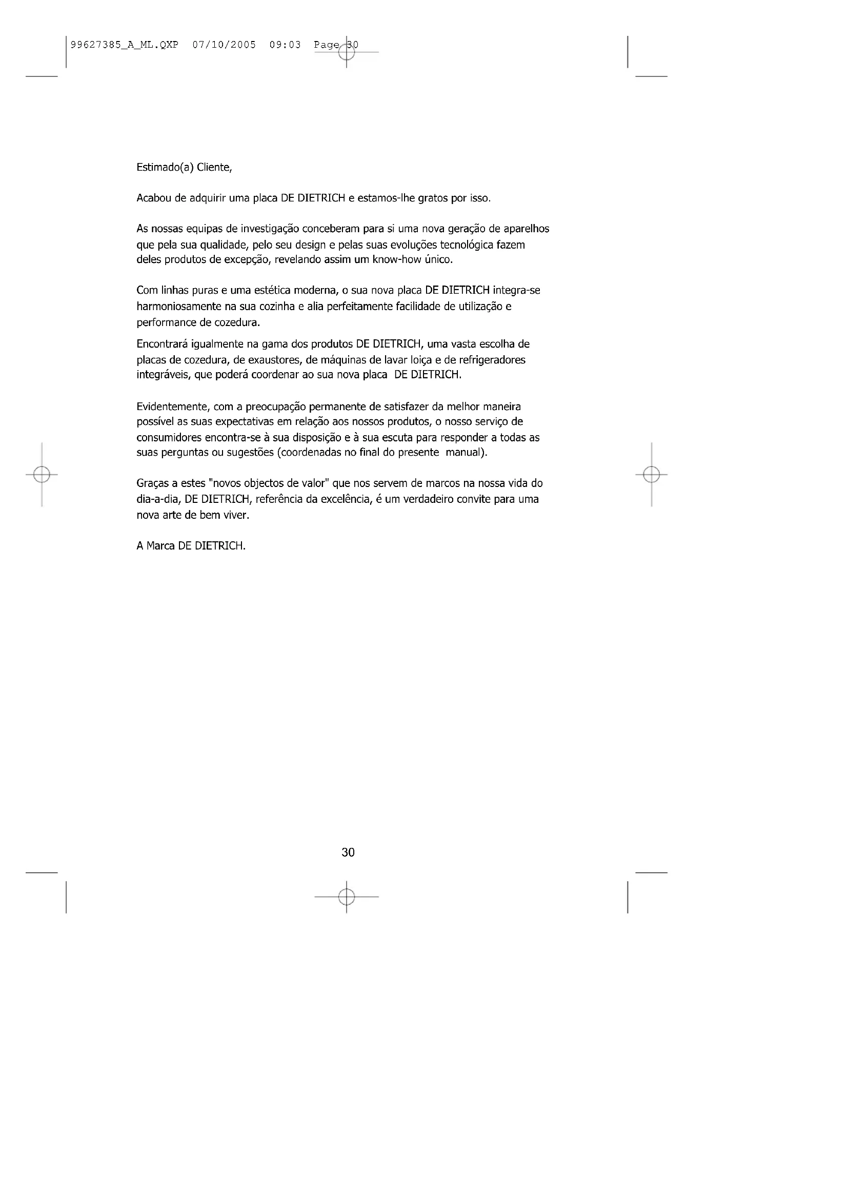 - 99627385_A_ML.QXP 07/10/2005 09:03 Page 2930 Estimado(a) Cliente, Acabou de adquirir uma placa DE DIETRICH e estamos-lhe gratos por isso. As nossas equipas de investigação conceberam para si uma nova geração de aparelhos que pela sua qualidade, pelo seu design e pelas suas evoluções tecnológica fazem deles produtos de excepção, revelando assim um know-how único. Com linhas puras e uma estética moderna, o sua nova placa DE DIETRICH integra-se harmoniosamente na sua cozinha e alia perfeitamente facilidade de utilização e performance de cozedura. Encontrará igualmente na gama dos produtos DE DIETRICH, uma vasta escolha de placas de cozedura, de exaustores, de máquinas de lavar loiça e de refrigeradores integráveis, que poderá coordenar ao sua nova placa DE DIETRICH. Evidentemente, com a preocupação permanente de satisfazer da melhor maneira possível as suas expectativas em relação aos nossos produtos, o nosso serviço de consumidores encontra-se à sua disposição e à sua escuta para responder a todas as suas perguntas ou sugestões (coordenadas no final do presente manual). Graças a estes "novos objectos de valor" que nos servem de marcos na nossa vida do dia-a-dia, DE DIETRICH, referência da excelência, é um verdadeiro convite para uma nova arte de bem viver. A Marca DE DIETRICH. 99627385_A_ML.QXP 07/10/2005 09:03 Page 3031 Neste manual, os símbolos abaixo identificam: as instruções de segurança, os conselhos e astúcias A sua placa em total segurança p. 30