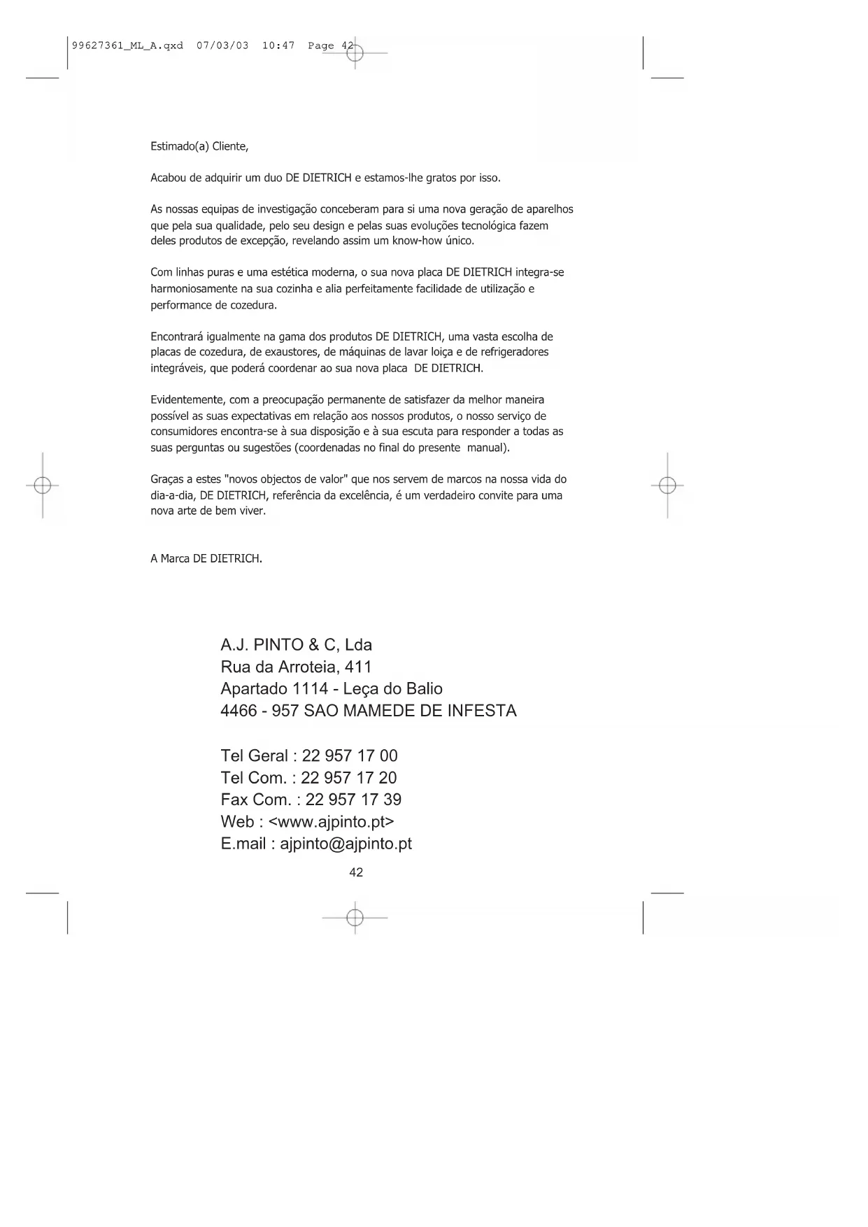 99627361_ML_A.qxd 07/03/03 10:47 Page 4142 Estimado(a) Cliente, Acabou de adquirir um duo DE DIETRICH e estamos-lhe gratos por isso. As nossas equipas de investigação conceberam para si uma nova geração de aparelhos que pela sua qualidade, pelo seu design e pelas suas evoluções tecnológica fazem deles produtos de excepção, revelando assim um know-how único. Com linhas puras e uma estética moderna, o sua nova placa DE DIETRICH integra-se harmoniosamente na sua cozinha e alia perfeitamente facilidade de utilização e performance de cozedura. Encontrará igualmente na gama dos produtos DE DIETRICH, uma vasta escolha de placas de cozedura, de exaustores, de máquinas de lavar loiça e de refrigeradores integráveis, que poderá coordenar ao sua nova placa DE DIETRICH. Evidentemente, com a preocupação permanente de satisfazer da melhor maneira possível as suas expectativas em relação aos nossos produtos, o nosso serviço de consumidores encontra-se à sua disposição e à sua escuta para responder a todas as suas perguntas ou sugestões (coordenadas no final do presente manual). Graças a estes "novos objectos de valor" que nos servem de marcos na nossa vida do dia-a-dia, DE DIETRICH, referência da excelência, é um verdadeiro convite para uma nova arte de bem viver. A Marca DE DIETRICH. A.J. PINTO & C, Lda Rua da Arroteia, 411 Apartado 1114 - Leça do Balio