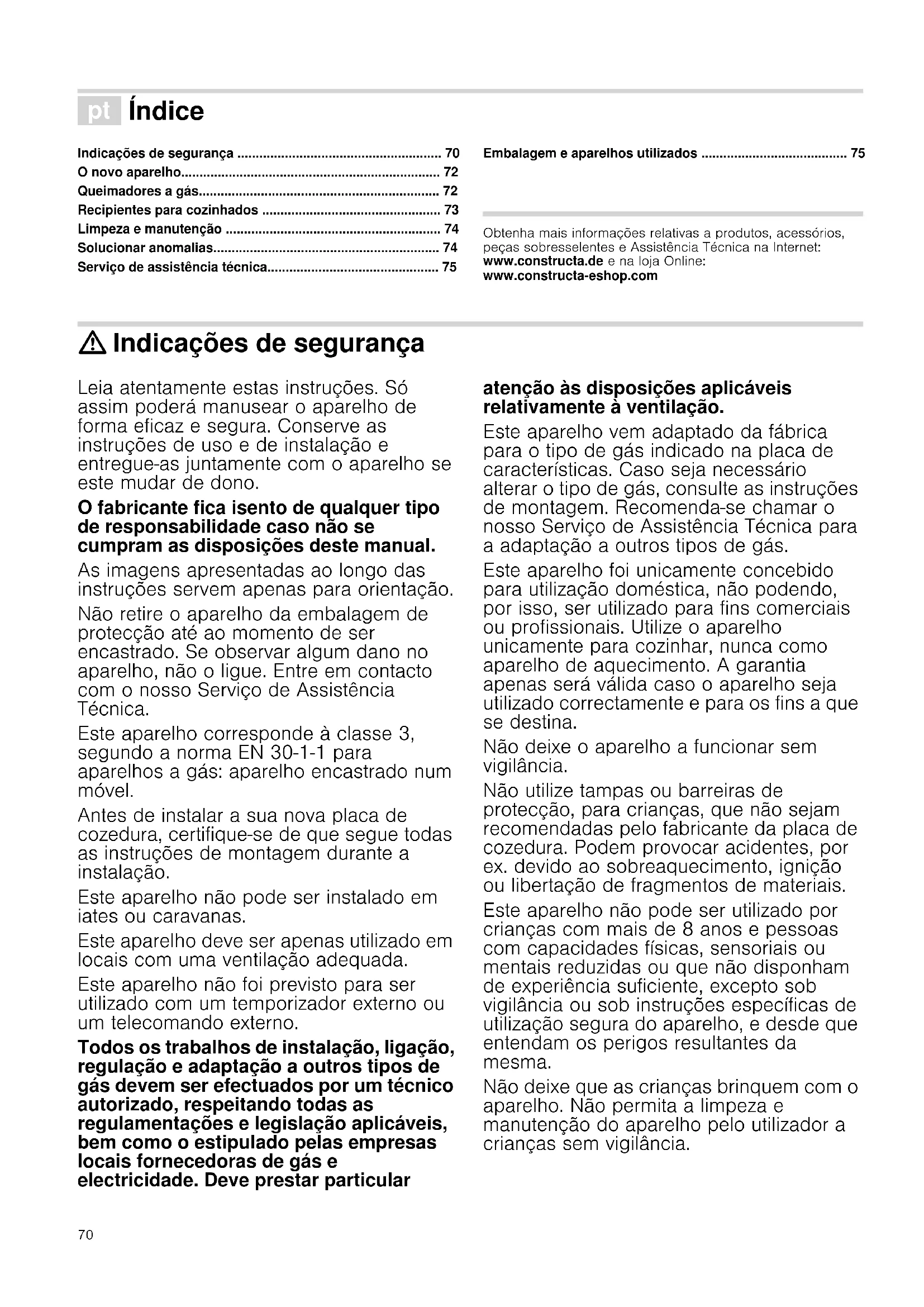- Ambalaj şi aparate uzate Produktinfo Pe pagina noastră de internet găsiţi alte informaţii referitoare la produse, accesorii, piese de schimb şi servicii: www.constructa.de şi la magazinul online: www.constructa-eshop.com : Indicaţii referitoare la siguranţă Citiţi cu atenţie aceste instrucţiuni. Doar atunci veţi putea manevra aparatul dvs. într- un mod eficient şi sigur. Păstraţi instrucţiunile de utilizare şi instalare şi înmânaţi-le împreună cu aparatul dacă acesta îşi schimbă proprietarul. Producătorul este exonerat de orice răspundere dacă nu sunt îndeplinite dispoziţiile din acest manual. Imaginile prezentate în aceste instrucţiuni sunt cu scop orientativ. Nu scoateţi aparatul din ambalajul protector până în momentul încastrării. Dacă observaţi vreo daună la aparat, nu îl conectaţi. Luaţi legătura cu Serviciul nostru tehnic. Acest aparat corespunde cu clasa 3, conform normei EN 30-1-1 pentru aparate pe bază de gaz: aparat încastrat într-o mobilă. Înainte de a instala noua dvs. plită de gătit, asiguraţi-vă că instalarea se efectuează urmând instrucţiunile de montare. Acest aparat nu poate fi instalat în iahturi sau rulote. Acest aparat trebuie s ă fie utilizat exclusiv în locuri cu ventilaţie suficientă. Acest aparat nu este destinat exploatării cu un comutator temporizat extern sau cu o telecomandă. Toate lucrările de instalare, conectare, reglare şi adaptare la alte tipuri de gaz trebuie să fie realizate de către un tehnician autorizat, respectând toate normele şi legislaţia aplicabile şi dispoziţiile companiilor locale furnizoare de gaz şi energie electrică. Se va acorda o atenţie deosebită dispoziţiilor aplicabile în ceea ce priveşte ventilaţia. Acest aparat iese din fabrică reglat pentru tipul de gaz indicat pe plăcuţa cu caracteristici. Dacă este necesar să îl schimbaţi, consultaţi instrucţiunile de montare. Este recomandat să apelaţi la serviciul nostru tehnic pentru adaptarea la alte tipuri de gaz. Acest aparat a fost conceput numai pentru uz casnic, nefiind permisă utilizarea sa în scopuri comerciale sau profesionale. Utilizaţi aparatul numai pentru gătit, niciodată pentru încălzirea casei. Garanţia va fi valabilă numai dacă se respectă utilizarea pentru care a fost conceput. Nu lăsaţi aparatul nesupravegheat în timpul funcţionării. Nu utilizaţi capace sau bariere de protecţie pentru copii care nu sunt recomandate de către producătorul plitei de gătit. Puteţi provoca accidente, de ex. aprinderea sau desprinderea de fragmente de material datorită supraîncălzirii. Acest aparat poate fi utilizat de copii peste 8 ani şi persoane cu calităţi fizice, senzoriale sau mentale reduse, numai sub supraveghere sau dacă au fost instruite privind exploatarea în siguranţă a aparatului şi dacă au înţeles care sunt pericolele care rezultă din aceasta. Copiii nu au voie să se joace cu aparatul. Nu este permis ca întreţinerea şi curăţarea aparatului să fie efectuate de copii nesupravegheaţi. Pericol de deflagraţie! Acumularea de gaz fără ardere într-o incintă închisă aduce pericolul de deflagraţie. Nu supuneţi aparatul la curenţi de aer. Arzătoarele s-ar putea stinge. Citiţi cu atenţie instrucţiunile şi indicaţiile cu privire la func ţionarea arzătoarelor cu gaz.77 Pericol de intoxicare! Utilizarea unui aparat de gătit cu gaz produce căldură, umiditate şi produşi de ardere în locul în care este instalat. Asiguraţi o bună aerisire a bucătăriei, în special cât timp plita de gătit este în funcţiune: menţineţi deschise orificiile de aerisire naturală sau instalaţi un dispozitiv de aerisire mecanică (hotă). Utilizarea frecventă şi prelungită a aparatului poate necesita o aerisire suplimentară sau mai eficientă: deschideţi o fereastră sau măriţi puterea aerisirii mecanice. Pericol de arsuri! Zonele de gătit şi zonele adiacente se înfierbântă. Nu atingeţi niciodată suprafeţele fierbinţi. Ţineţi la distanţă copiii cu vârsta sub 8 ani. Pericol de incendiu! p. 81