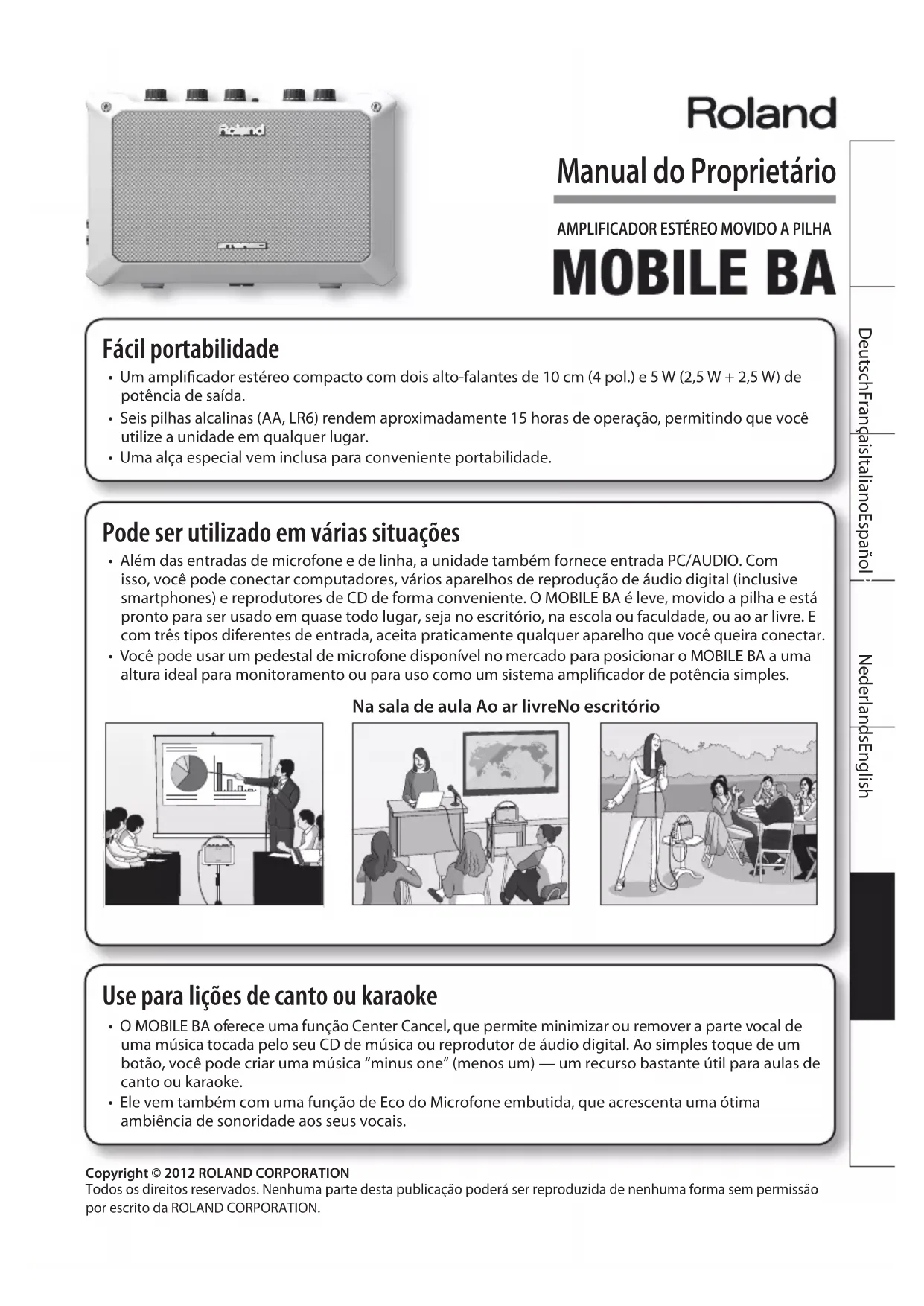 Baixe as instruções para o seu Receptor em formato PDF gratuitamente! Encontre o seu manual Mobile BA - ROLAND e retome o controlo do seu dispositivo eletrónico. Nesta página estão publicados todos os documentos necessários para a utilização do seu dispositivo. Mobile BA da marca ROLAND.