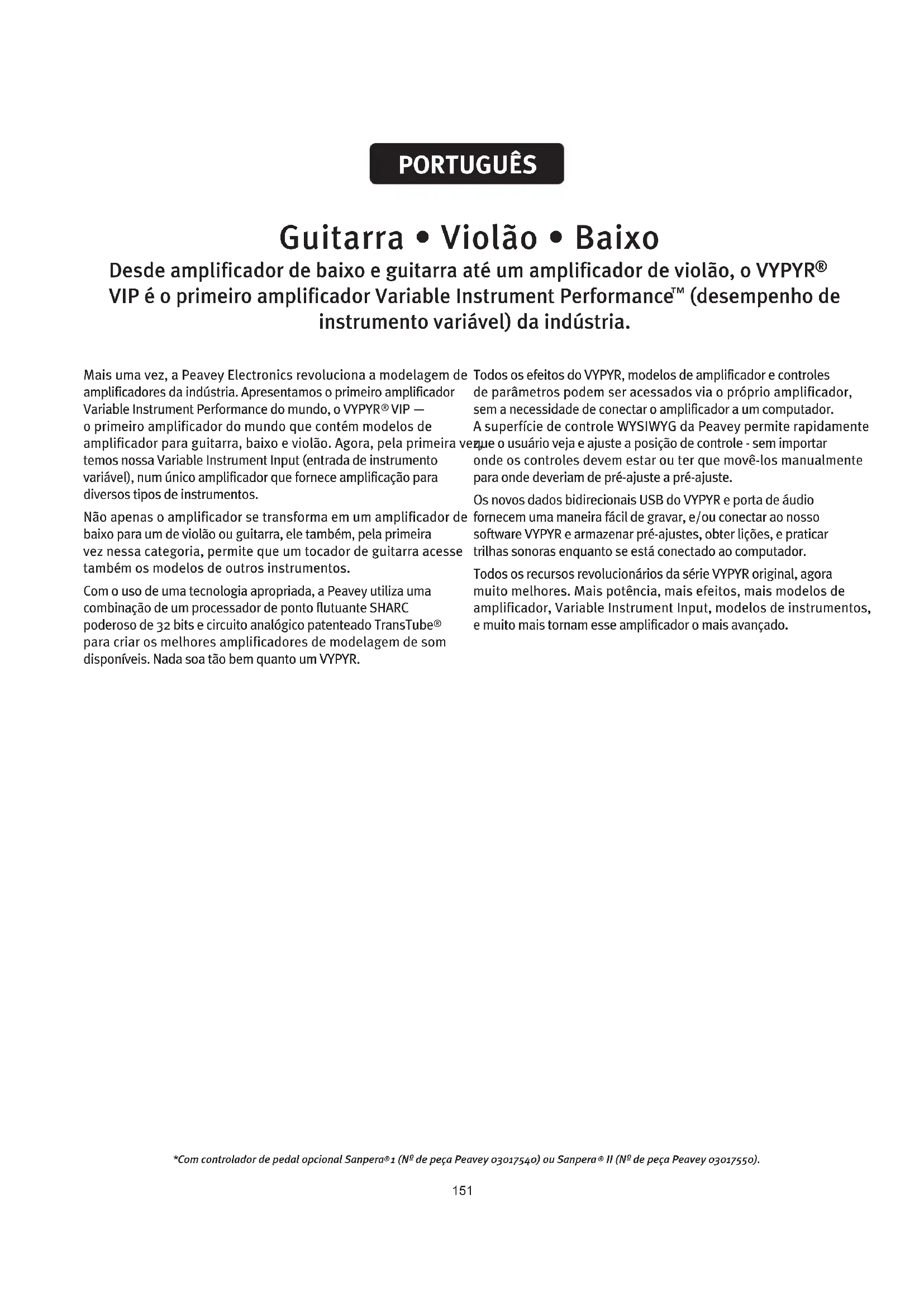 VIP Manual de Operação151 PORTUGUÊS Mais uma vez, a Peavey Electronics revoluciona a modelagem de amplificadores da indústria. Apresentamos o primeiro amplificador Variable Instrument Performance do mundo, o VYPYR