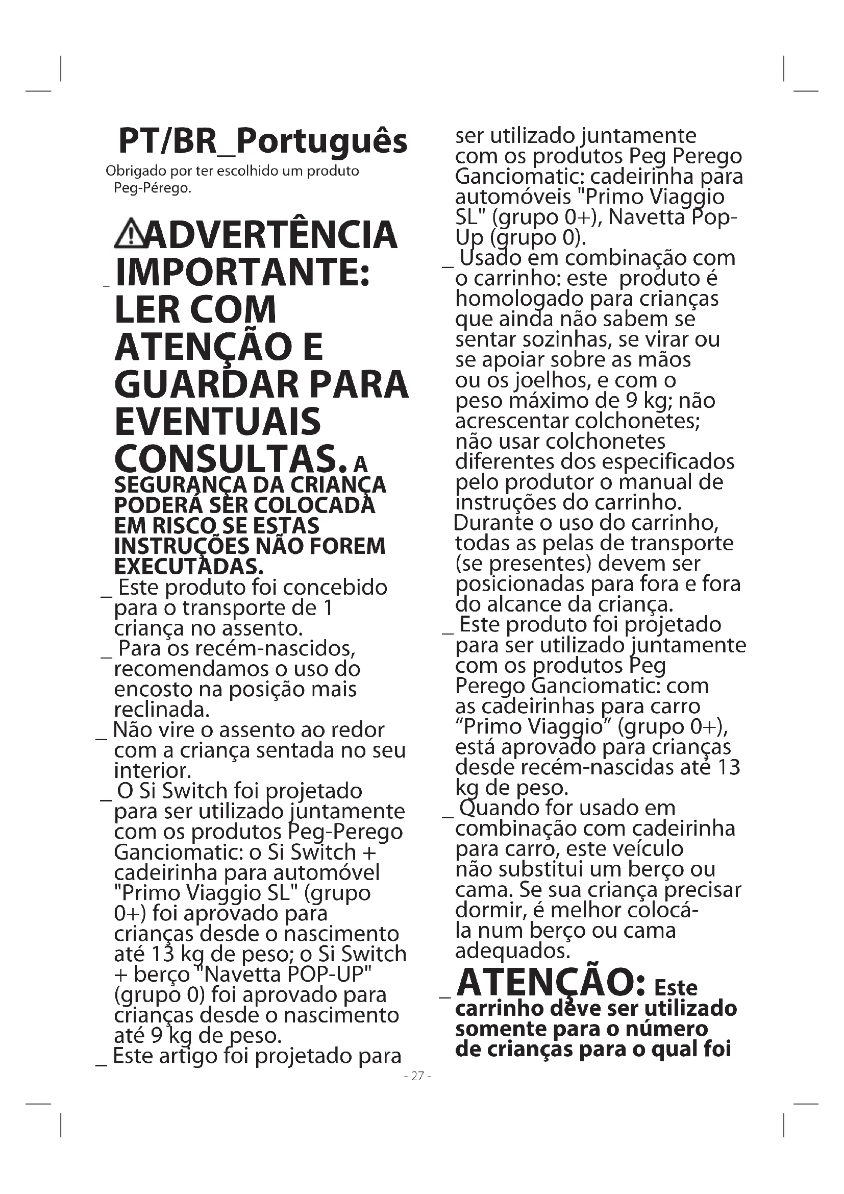 EXECUTADAS. _ Este produto foi concebido para o transporte de 1 criança no assento. _ Para os recém-nascidos, recomendamos o uso do encosto na posição mais reclinada. _ Não vire o assento ao redor com a criança sentada no seu interior. _ O Si Switch foi projetado para ser utilizado juntamente com os produtos Peg-Perego Ganciomatic: o Si Switch + cadeirinha para automóvel "Primo Viaggio SL" (grupo 0+) foi aprovado para crianças desde o nascimento até 13 kg de peso; o Si Switch + berço "Navetta POP-UP" (grupo 0) foi aprovado para crianças desde o nascimento até 9 kg de peso. _ Este artigo foi projetado para ser utilizado juntamente com os produtos Peg Perego Ganciomatic: cadeirinha para automóveis "Primo Viaggio SL" (grupo 0+), Navetta Pop- Up (grupo 0). _ Usado em combinação com o carrinho: este produto é homologado para crianças que ainda não sabem se sentar sozinhas, se virar ou se apoiar sobre as mãos ou os joelhos, e com o peso máximo de 9 kg; não acrescentar colchonetes; não usar colchonetes diferentes dos especificados pelo produtor o manual de instruções do carrinho. Durante o uso do carrinho, todas as pelas de transporte (se presentes) devem ser posicionadas para fora e fora do alcance da criança. _ Este produto foi projetado para ser utilizado juntamente com os produtos Peg Perego Ganciomatic: com as cadeirinhas para carro “Primo Viaggio” (grupo 0+), está aprovado para crianças desde recém-nascidas até 13 kg de peso. _ Quando for usado em combinação com cadeirinha para carro, este veículo não substitui um berço ou cama. Se sua criança precisar dormir, é melhor colocá- la num berço ou cama adequados. _ ATENÇÃO: Este carrinho deve ser utilizado somente para o número de crianças para o qual foi- 28 - projetado. _ Este carrinho é destinado para crianças a partir desde recém- nascidos e com peso a té 15 kg. _ Para os recém-nascidos, recomendamos o uso do encosto na posição mais reclinada. _ ATENÇÃO: As operações de montagem e preparação do artigo devem ser realizadas apenas por adultos. _ Não utilize este artigo se apresentar rupturas ou se faltarem peças.