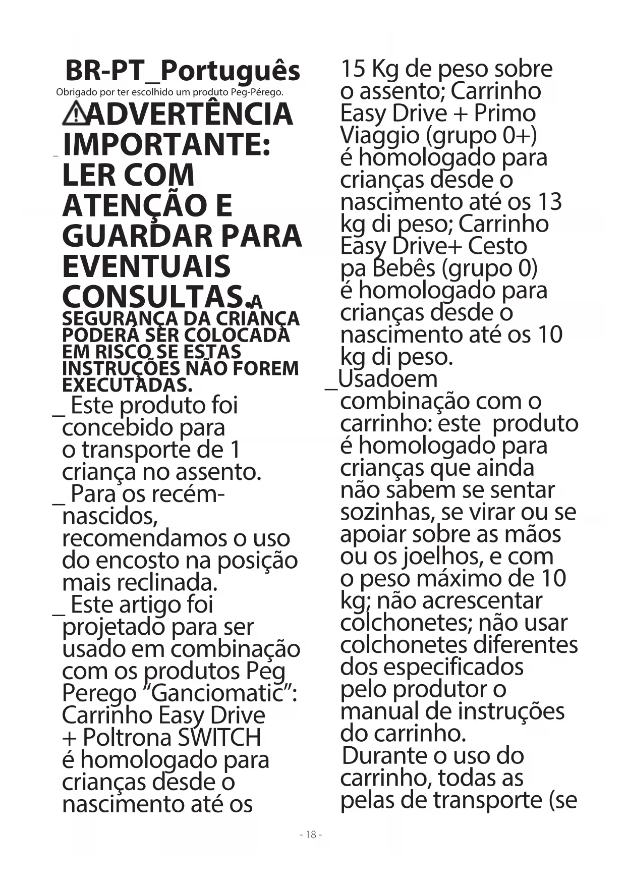 EXECUTADAS. _ Este produto foi concebido para o transporte de 1 criança no assento. _ Para os recém- nascidos, recomendamos o uso do encosto na posição mais reclinada. _ Este artigo foi projetado para ser usado em combinação com os produtos Peg Perego “Ganciomatic”: Carrinho Easy Drive + Poltrona SWITCH é homologado para crianças desde o nascimento até os 15 Kg de peso sobre o assento; Carrinho Easy Drive + Primo Viaggio (grupo 0+) é homologado para crianças desde o nascimento até os 13 kg di peso; Carrinho Easy Drive+ Cesto pa Bebês (grupo 0) é homologado para crianças desde o nascimento até os 10 kg di peso. _ Usado em combinação com o carrinho: este produto é homologado para crianças que ainda não sabem se sentar sozinhas, se virar ou se apoiar sobre as mãos ou os joelhos, e com o peso máximo de 10 kg; não acrescentar colchonetes; não usar colchonetes diferentes dos especificados pelo produtor o manual de instruções do carrinho. Durante o uso do carrinho, todas as pelas de transporte (se- 19 - presentes) devem ser posicionadas para fora e fora do alcance da criança. _ Este produto foi projetado para ser utilizado juntamente com os produtos Peg Perego Ganciomatic: com as cadeirinhas para carro “Primo Viaggio” (grupo 0+), está aprovado para crianças desde recém- nascidas até 13 kg de peso. _ Quando for usado em combinação com cadeirinha para carro, este veículo não substitui um berço ou cama. Se sua criança precisar dormir, é melhor colocá-la num berço ou cama adequados. _ ATENÇÃO: Este carrinho deve ser utilizado somente para o número de crianças para o qual foi projetado. _ Este carrinho é destinado para crianças a partir desde recém-nascidos e com peso a té 15 kg. _ Para os recém- nascidos, recomendamos o uso do encosto na posição mais reclinada. _ ATENÇÃO: As operações de montagem e preparação do artigo devem ser realizadas apenas por adultos. _ Não utilize este artigo se apresentar rupturas ou se faltarem peças. _ ATENÇÃO: Utilize sempre o cinto de segurança. Utilize sempre o cinto de segurança de cinco pontos. _ ATENÇÃO: Sempre utilize a tira entrepernas em combinaçao com o cinto abdominal. _ ATENÇÃO: Nunca deixe a criança sozinha sem a supervisão de um adulto.- 20 - _ Acione s empre o freio quando estiver parado. _ ATENÇÃO: Assegure-se de que todos os dispositivos de travamento estejam acionados antes do uso. _ ATENÇÃO: Nas operações de abertura e fechamento, certifique-se -sede que a criança esteja a uma devida distância para evitar incidentes. _ ATENÇÃO: Não permita que a criança brinque com este produto. _ Evite introduzir os dedos nos mecanismos. _ Preste atenção à presença da criança quando se efetuarem operações de regulagem dos mecanismos (manípulos, encosto). _ Qualquer carga suspensa na alça tornar o produto instável; siga a s indicações do fabricante com relação às cargas máximas utilizáveis. _ ATENÇÃO: Não pendure nenhum peso na alça do carrinho. _ O protetor frontal não foi concebido para sustentar o peso da criança; o protetor frontal não foi concebido para manter a criança no assento e não substitui o cinto de segurança. _ Não introduza no cesto cargas de peso superior a 5 kg. Não introduza no porta-bebidas pesos superiores ao especificado no próprio porta-bebidas e nunca introduza bebidas quentes. Não introduza nos bolsos das capotas (se presentes) pesos superiores a 0,2 kg. _ Não utilize o artigo- 21 - na proximidade de escadas ou degraus; não o utilize perto de fontes de calor, chamas livres ou objetos perigosos ao alcance da criança. _ ATENÇÃO: Não podem ser utilizados acessórios não aprovados pelo fabricante. _ ATENÇÃO: Não utilize o abrigo para chuva (se presente) em ambientes fechados e verifique sempre se a criança não sente calor; nunca o coloque perto de fontes de calor e tenha cuidado com os cigarros. A capa de chuva não deve ser utilizada em um carrinho sem capota ou guarda-sol capaz de adaptá-la. Use sempre a capa de chuva somente sob a supervisão de um adulto.Certifique-se de que a capa para chuva não interfere com nenhum mecanismo em movimento do carrinh o; remova s empre a capa para ch uva antes d e fechar o carrinho. _ ADVERTÊNCIA: Este produto não pode ser utilizado para correr ou patinar. _ Acione sempre o freio durante as operações de carregamento e descarregamento da criança. _ ATENÇÃO: Não adicione nenhum tipo de colchão. _ ATENÇÃO: Verificar se os dispositivos de fixação do cesto para bebês ou da unidade de assento estão corretamente encaixados antes do uso.