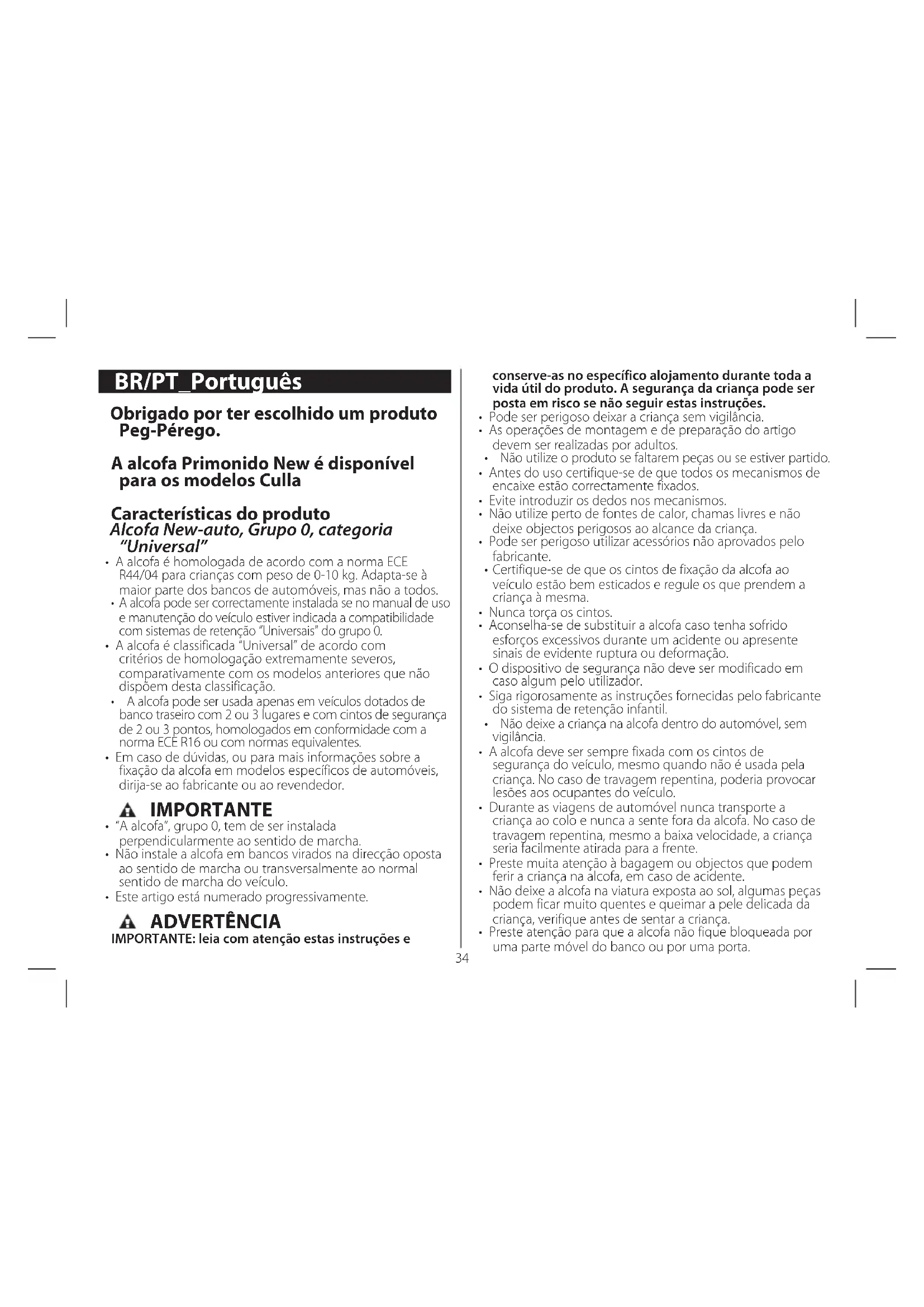 - Número progressivo de fabrico: personaliza cada alcofa, a partir da emissão da homologação cada uma está identificada com um número específico. PEG-PÉREGO S.p.A. Peg-Pérego S.p.A é certificada ISO 9001. A certificação oferece aos clientes e aos consumidores a garantia de transparência e confiança no que se refere ao modo com que a empresa trabalha. Peg Pérego poderá realizar em qualquer momento alterações nos modelos descritos nesta publicação, por motivos técnicos ou comerciais.Peg Perego está à disposição dos seus Consumadores para satisfazer ao máximo suas exigências. Portanto, conhecer a opinião de nossos Clientes, é para nós extremamente importante e precioso. Ficaremos muito agradecidos se depois de ter utilizado um nosso produto, quiser preencher o QUESTIONÁRIO DE SATISFAÇÃO DO CONSUMADOR, a indicar eventuais observações ou sugestões, que encontrará em nosso site Internet: www.pegperego.com SERVIÇO DE ASSISTÊNCIA PEG-PÉREGO Se, inadvertidamente, uma peça do modelo se perder ou danificar, utilizar apenas peças de substituição Peg Pérego originais. Para eventuais reparações, substituições, informações sobre os produtos, venda de peças originais e acessórios, contactar o Serviço de38 Wij danken u voor de keuze van een Peg-Pérego product. De reiswieg Primonido New is verkrijgbaar in het model Culla. Productkenmerken Reiswieg-auto, Groep 0, categorie “Universeel”