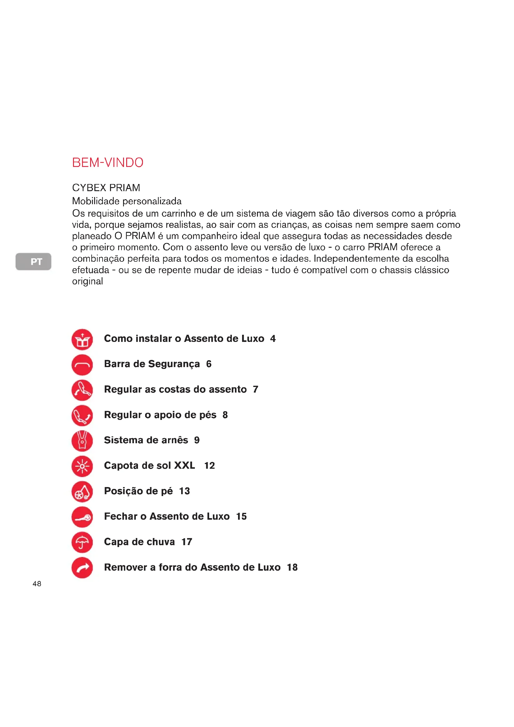 BEM-VINDO Os requisitos de um carrinho e de um sistema de viagem são tão diversos como a própria vida, porque sejamos realistas, ao sair com as crianças, as coisas nem sempre saem como planeado O PRIAM é um companheiro ideal que assegura todas as necessidades desde o primeiro momento. Com o assento leve ou versão de luxo - o carro PRIAM oferece a combinação perfeita para todos os momentos e idades. Independentemente da escolha efetuada - ou se de repente mudar de ideias - tudo é compatível com o chassis clássico original Mobilidade personalizada CYBEX PRIAM Como instalar o Assento de Luxo 4 Barra de Segurança 6 Regular as costas do assento 7 Regular o apoio de pés 8 Sistema de arnês 9 Capota de sol XXL 12 Posição de pé 13 Fechar o Assento de Luxo 15 Capa de chuva 17 Remover a forra do Assento de Luxo 18PT