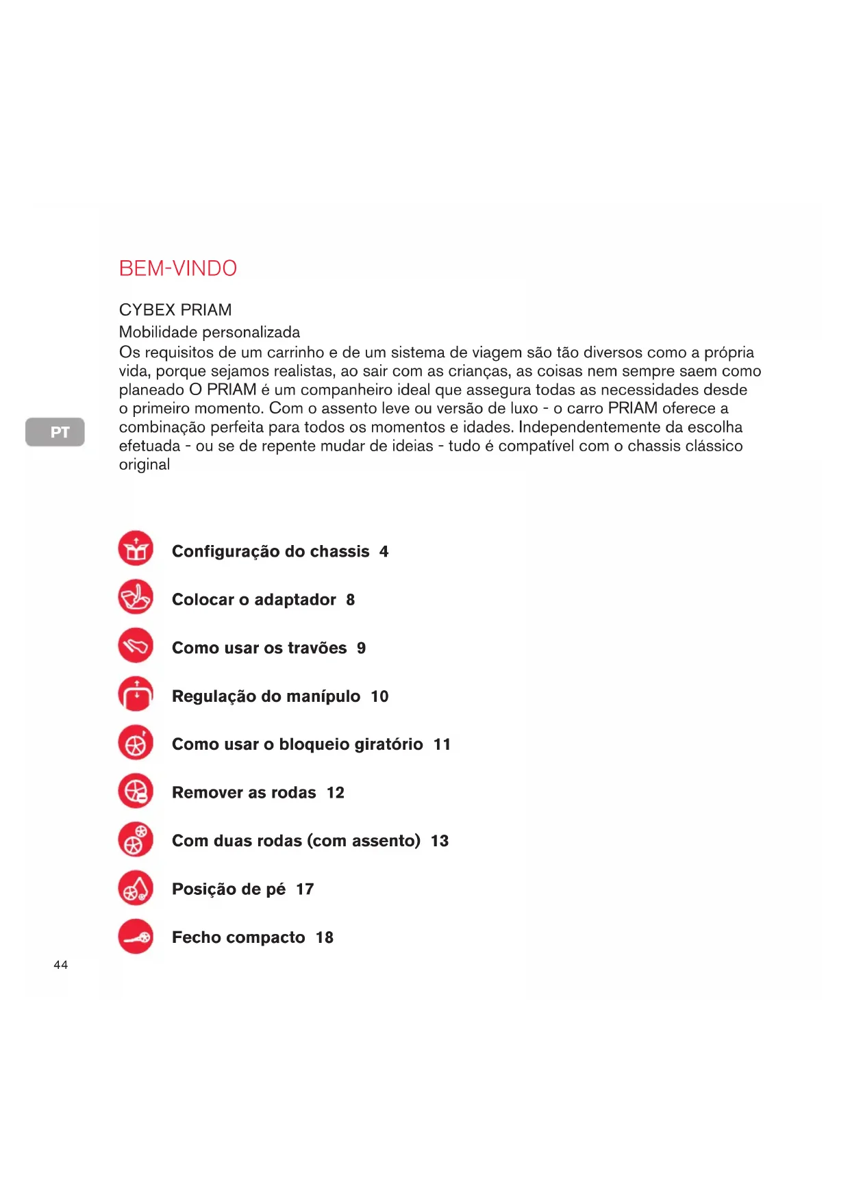 BEM-VINDO Os requisitos de um carrinho e de um sistema de viagem são tão diversos como a própria vida, porque sejamos realistas, ao sair com as crianças, as coisas nem sempre saem como planeado O PRIAM é um companheiro ideal que assegura todas as necessidades desde o primeiro momento. Com o assento leve ou versão de luxo - o carro PRIAM oferece a combinação perfeita para todos os momentos e idades. Independentemente da escolha efetuada - ou se de repente mudar de ideias - tudo é compatível com o chassis clássico original Mobilidade personalizada CYBEX PRIAM Configuração do chassis 4 Colocar o adaptador 8 Como usar os travões 9 Regulação do manípulo 10 Como usar o bloqueio giratório 11 Remover as rodas 12 Com duas rodas (com assento) 13 Posição de pé 17 Fecho compacto 18PT