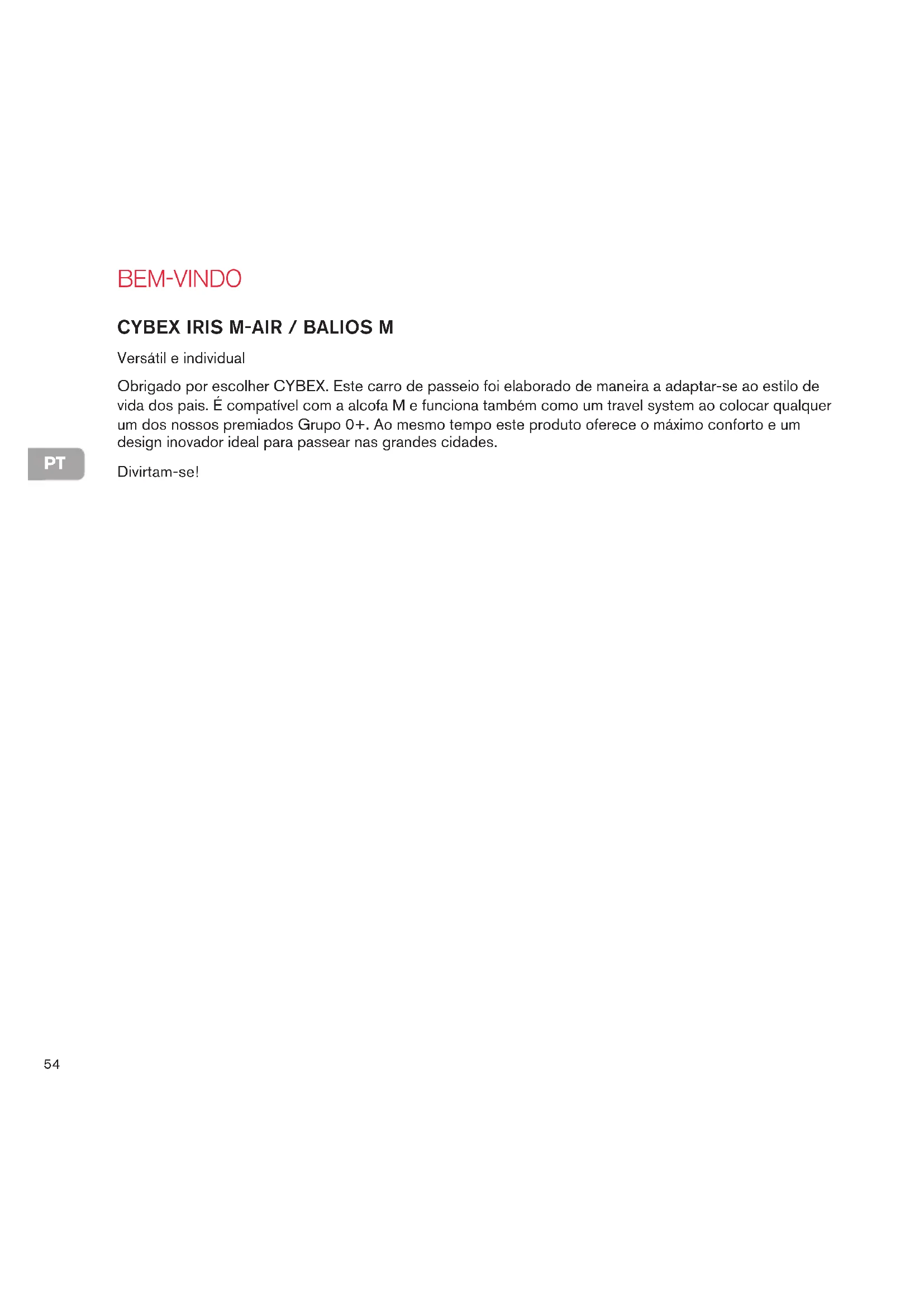 Bem-vindo CYBEX IrIs M-AIr / BAlIos M Versátil e individual Obrigado por escolher CYBEX. Este carro de passeio foi elaborado de maneira a adaptar-se ao estilo de vida dos pais. É compatível com a alcofa M e funciona também como um travel system ao colocar qualquer um dos nossos premiados Grupo 0+. Ao mesmo tempo este produto oferece o máximo conforto e um design inovador ideal para passear nas grandes cidades. Divirtam-se!PT
